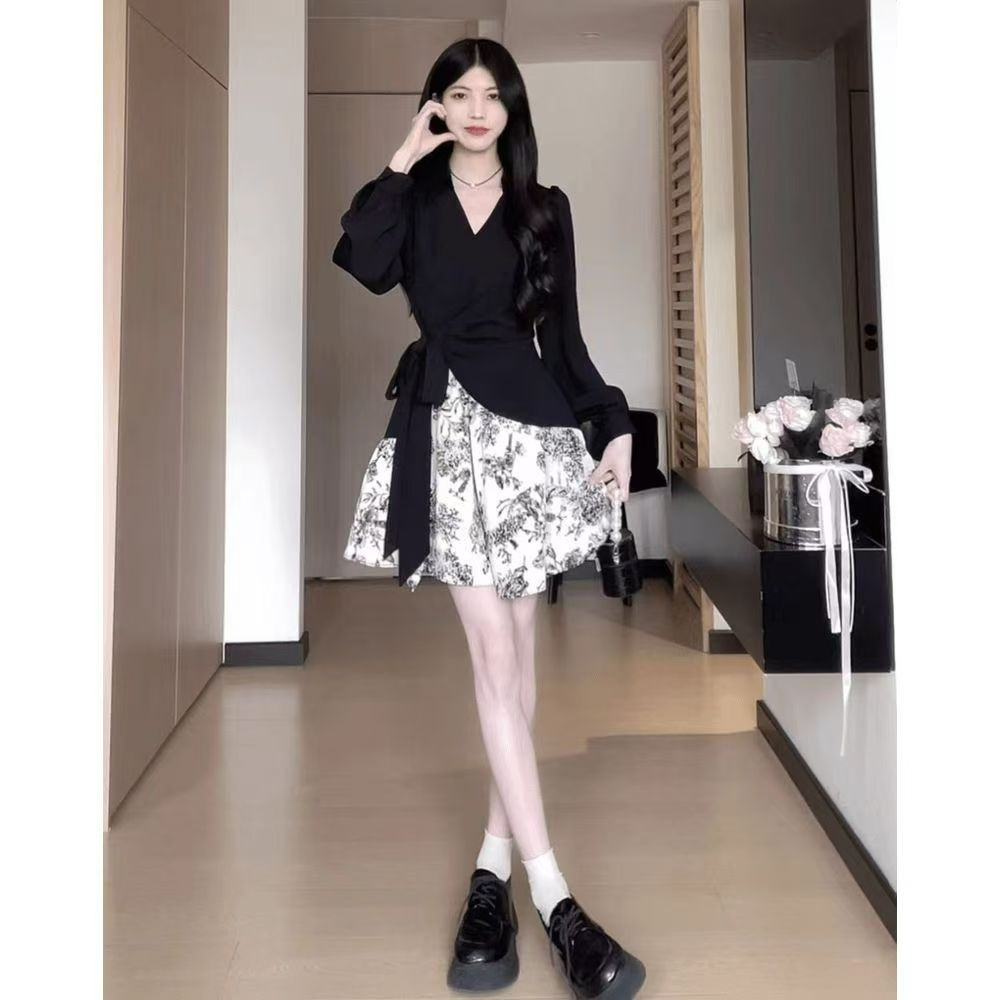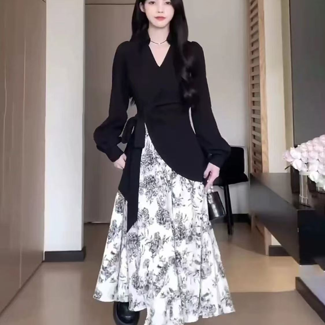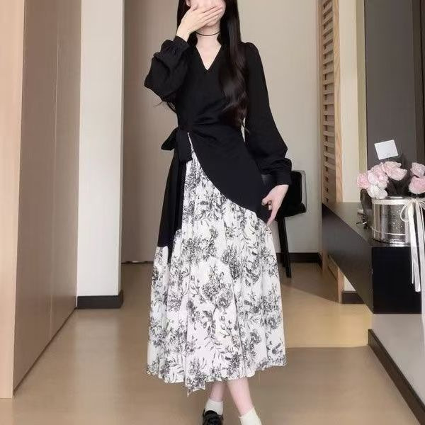 가을 새로운 중국 스타일 국가 스타일 잉크 꽃 모자이크 긴 소매 원피스 슬리밍 디자인 센스 허리 긴 스커트