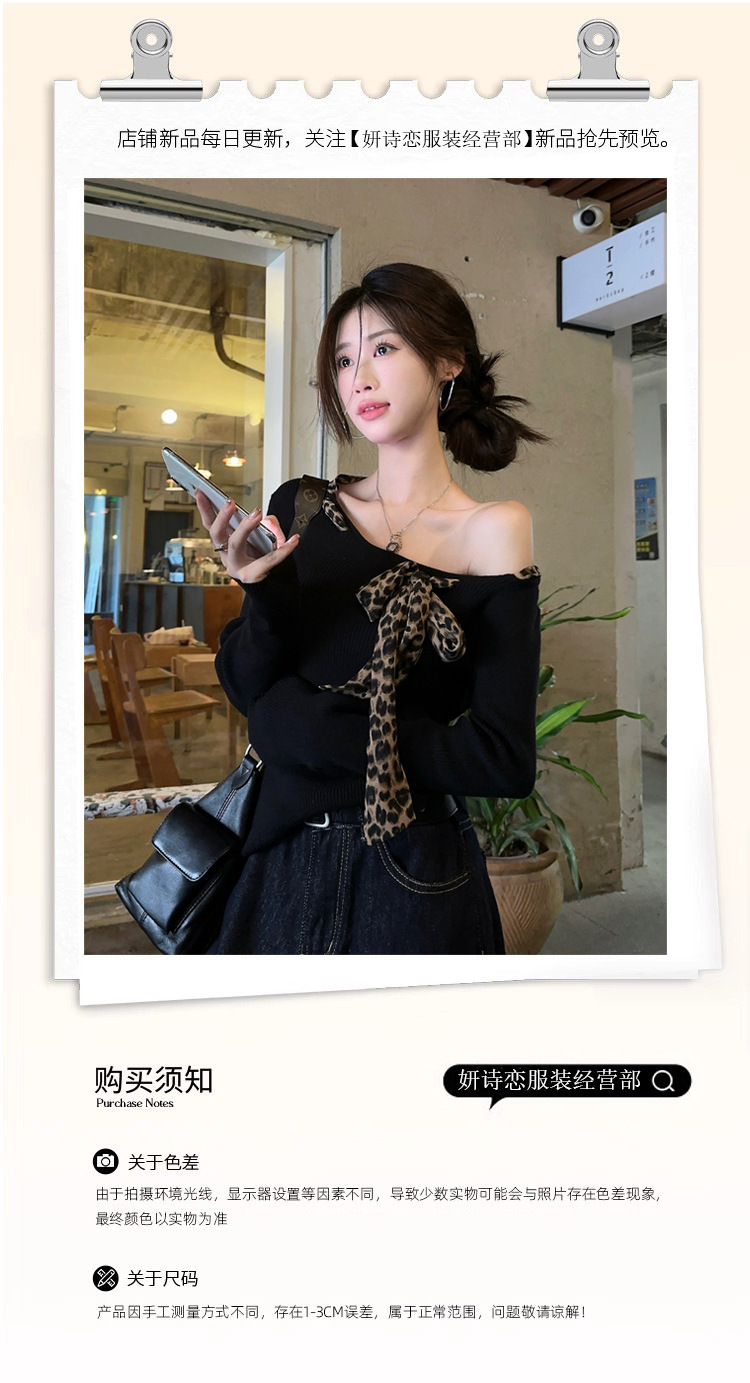 아메리칸 레트로 디자인 센스 레오파드 무늬 레이스 업 긴팔 티셔츠 여성용 초가을 소프트 왁스 슬리밍 오프 숄더 탑