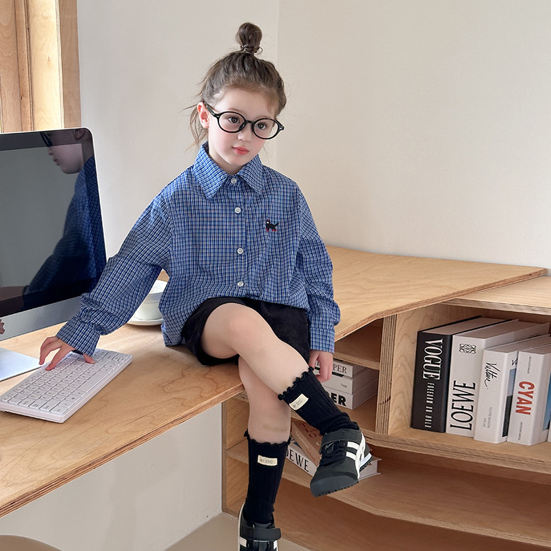 Aimo Beibei 봄과 가을 소녀 한국 스타일 격자 무늬 셔츠 서양식 캐주얼 루즈 자수 스트라이프 셔츠 탑 트렌디