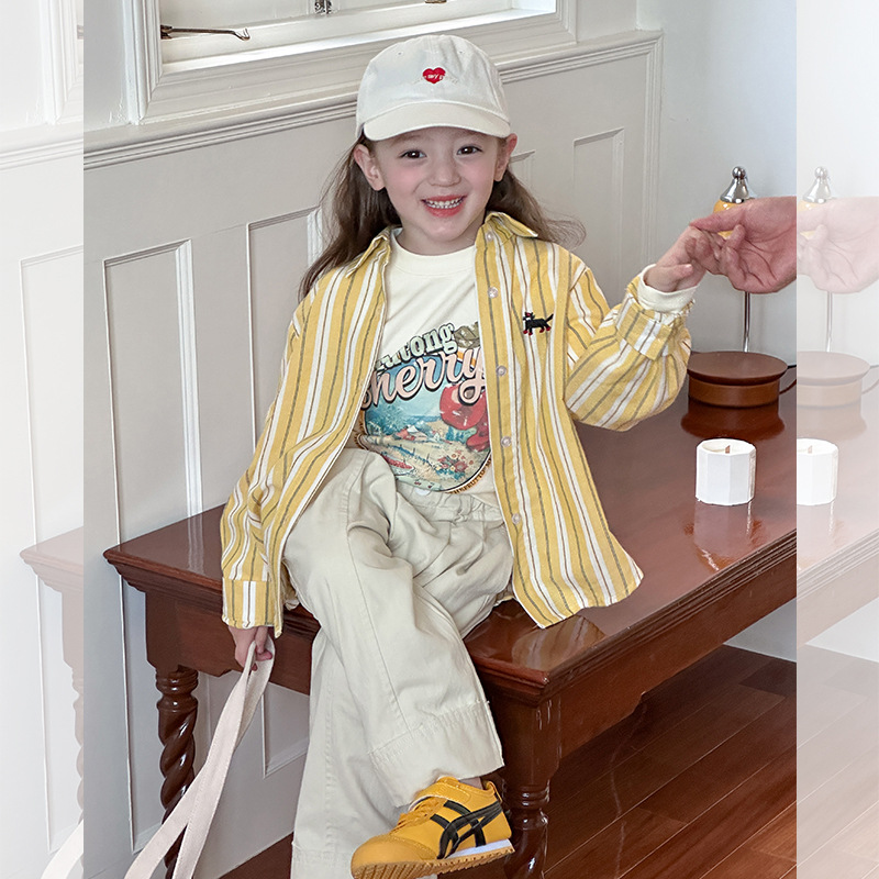 Aimo Beibei 봄과 가을 소녀 한국 스타일 격자 무늬 셔츠 서양식 캐주얼 루즈 자수 스트라이프 셔츠 탑 트렌디스토어 가기