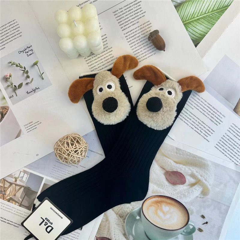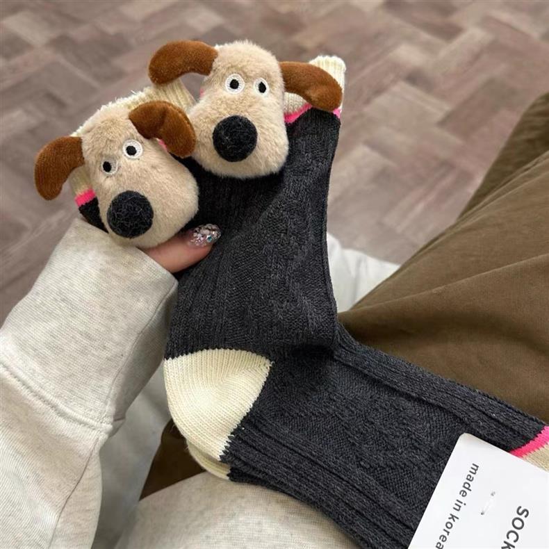 귀여운 리더 개 인형 쥬얼리 더블 니들 코튼 양말 어린이 미드 하이 Ins 만화 귀여운 온라인 연예인 조수