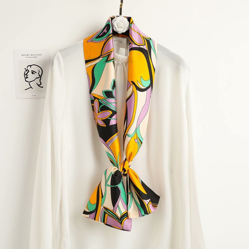 봄과 가을 새로운 좁은 실크 스카프 여성용 리본 헤어 액세서리 넥타이 가방 작은 스카프 인쇄 헤어 밴드 실크 긴 장식 실크 스카프