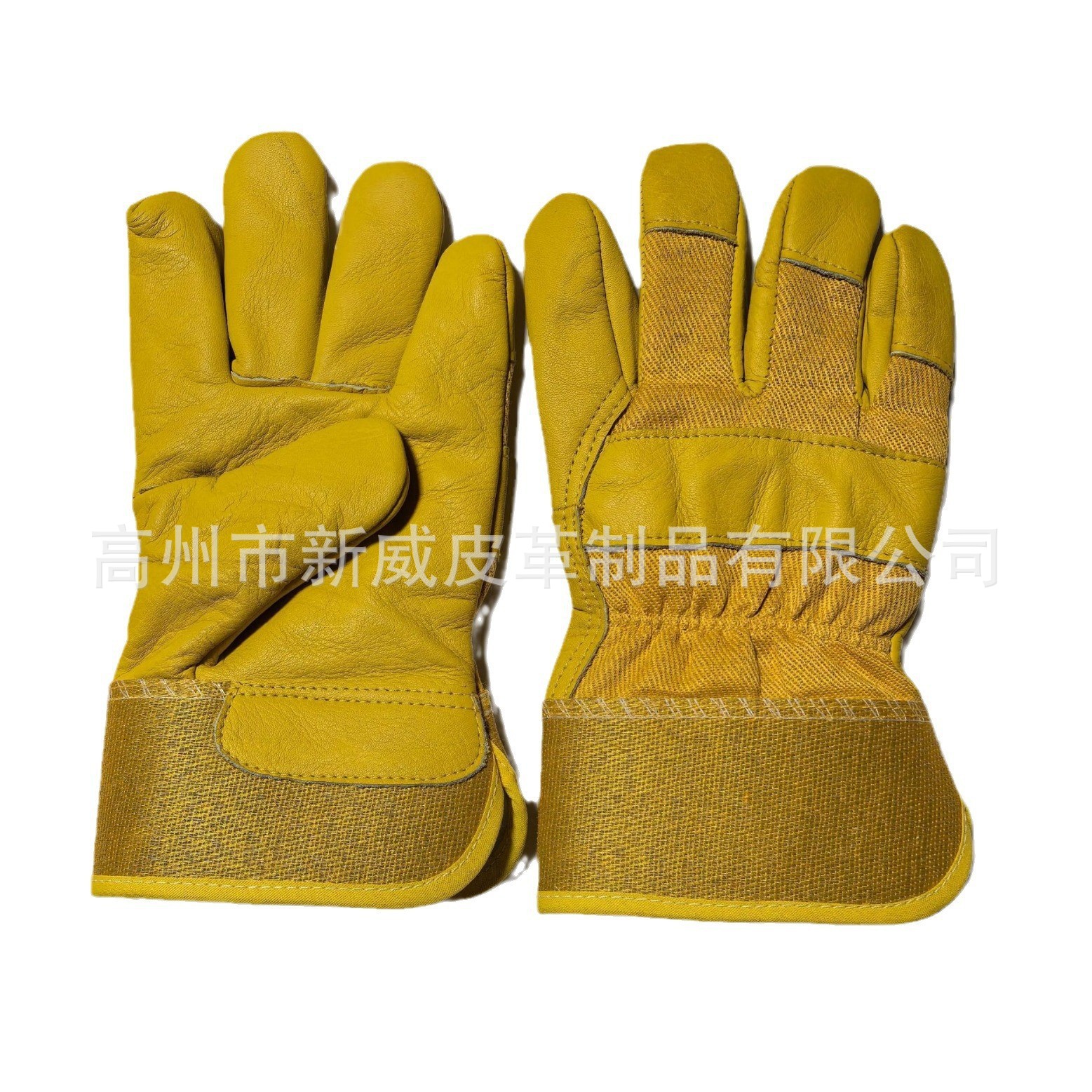 金黄色头层牛皮全掌手套,手套长度为326.5厘米,手掌宽度为14厘米,内里使用杂绒半里。