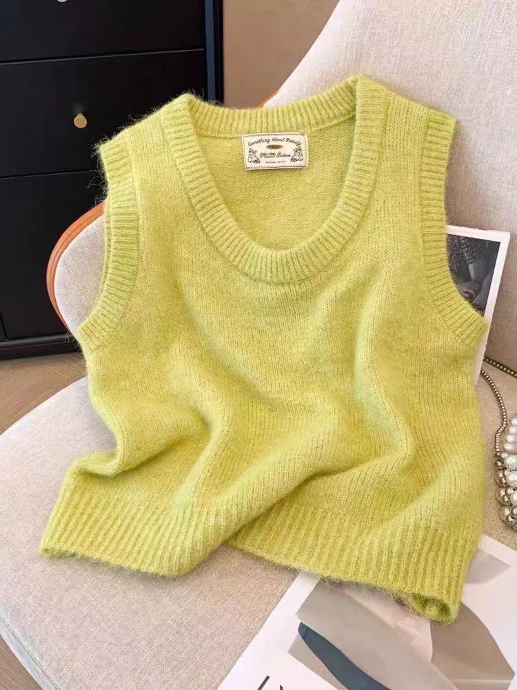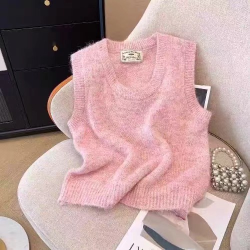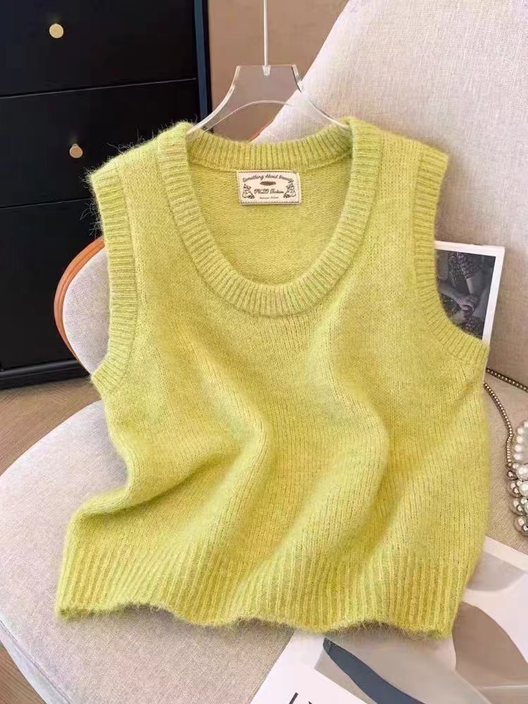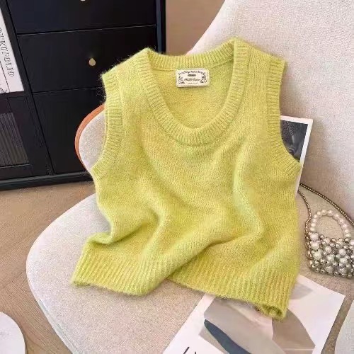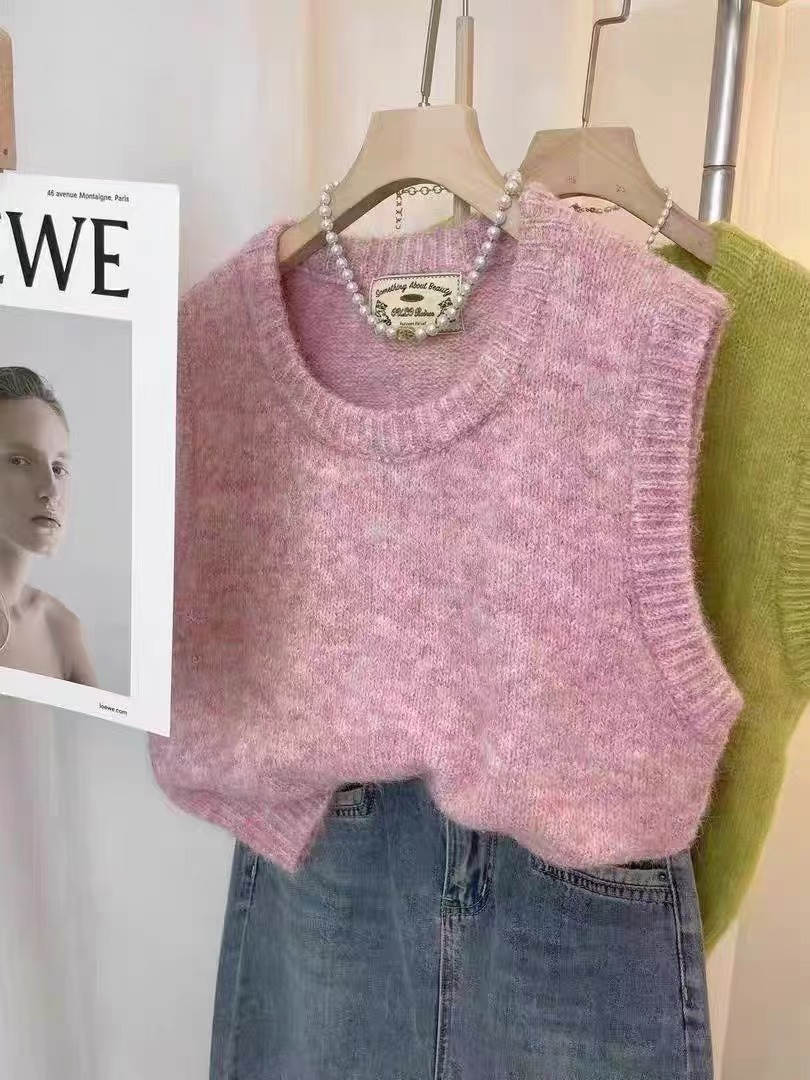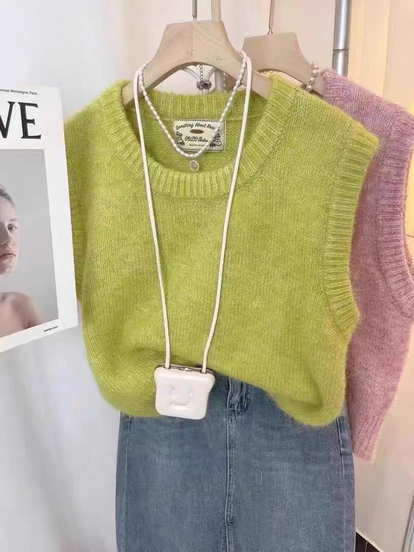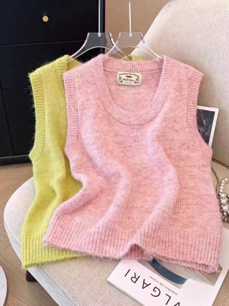 여성 모헤어 니트 조끼 가을과 겨울 새로운 한국식 캔디 컬러 게으른 스타일 둥근 목 풀오버 민소매 조끼