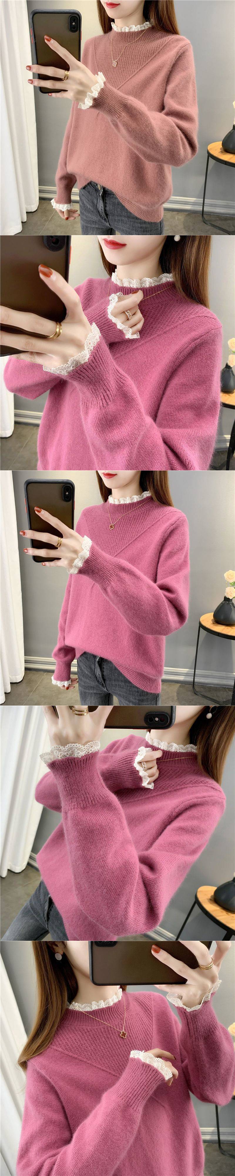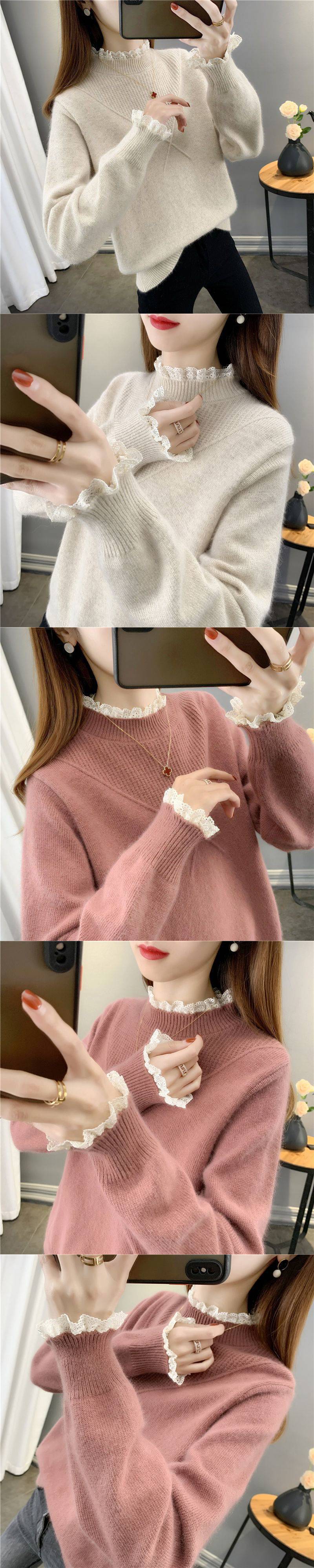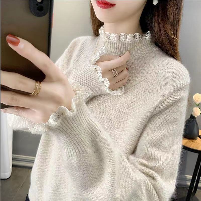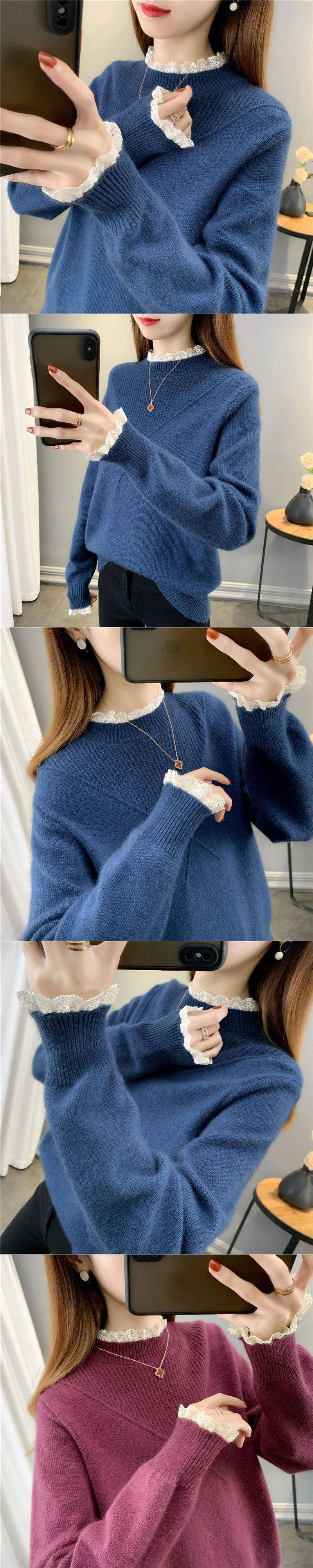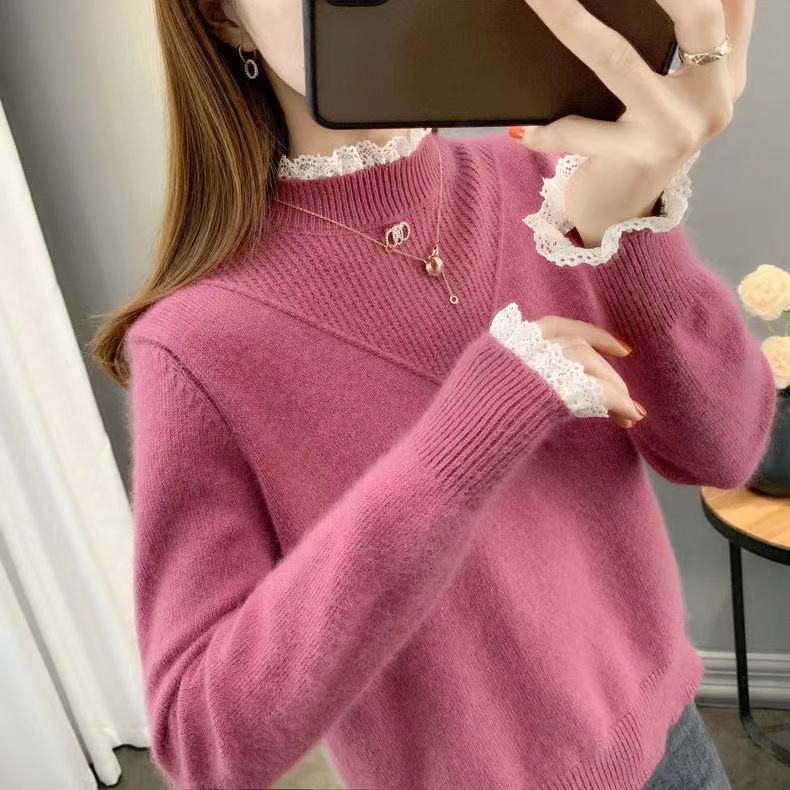 가을과 겨울 2024 새로운 반쪽 터틀넥 스웨터 여성의 느슨한 외부 착용 레이스 스티칭 니트베이스 셔츠 최고 트렌디스토어 가기