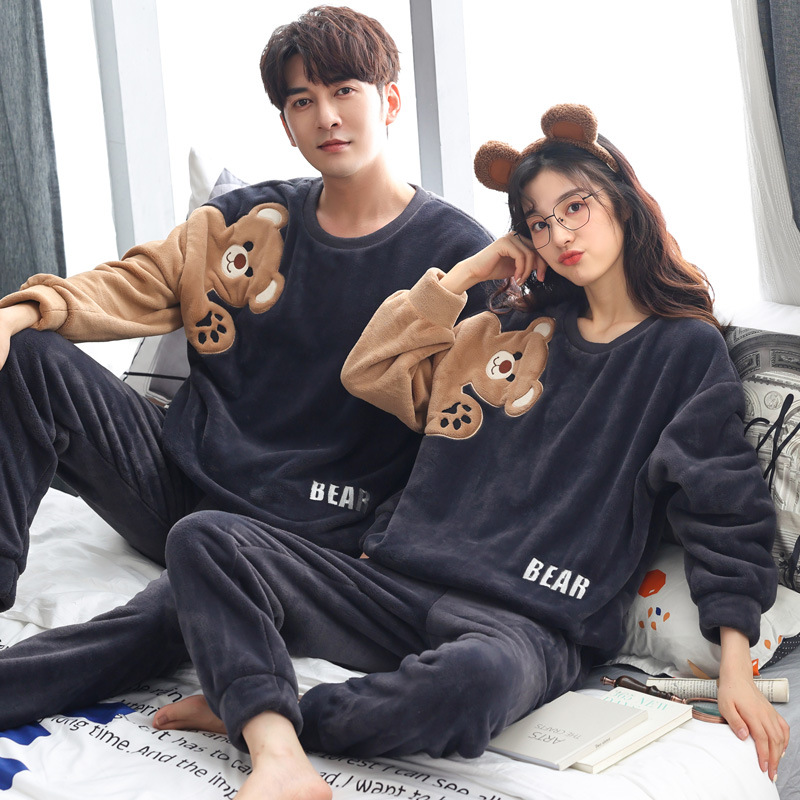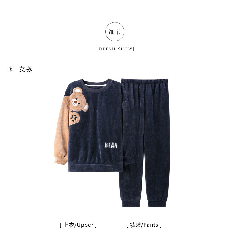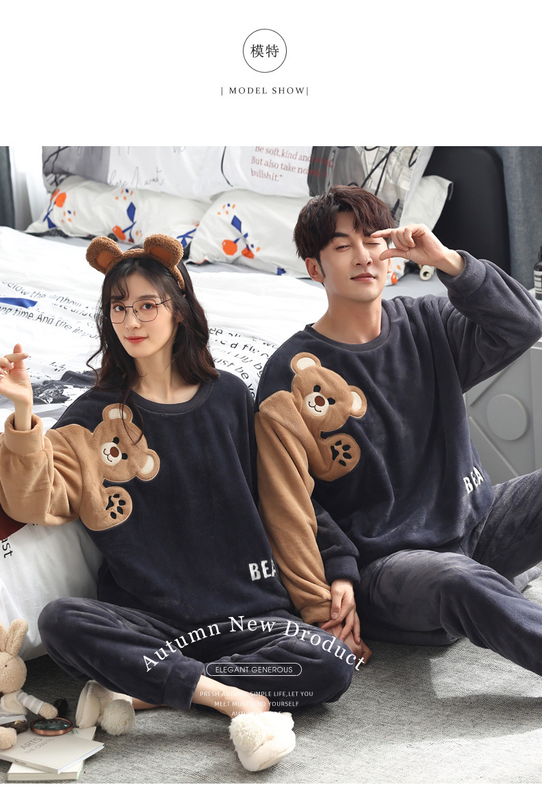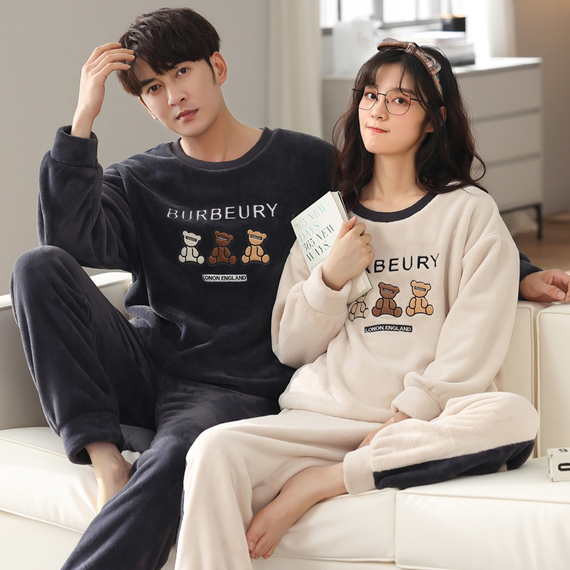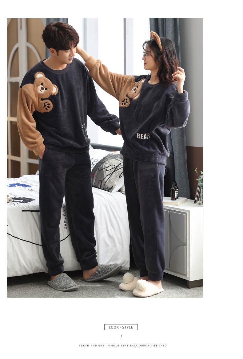 겨울 플란넬 커플 잠옷 남녀공용 가을 겨울 산호벨벳 라운드넥 겨울 두꺼운 보온 외출복 가능 홈웨어