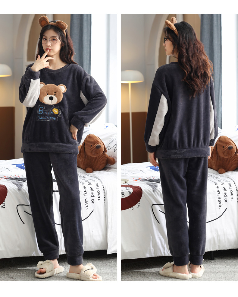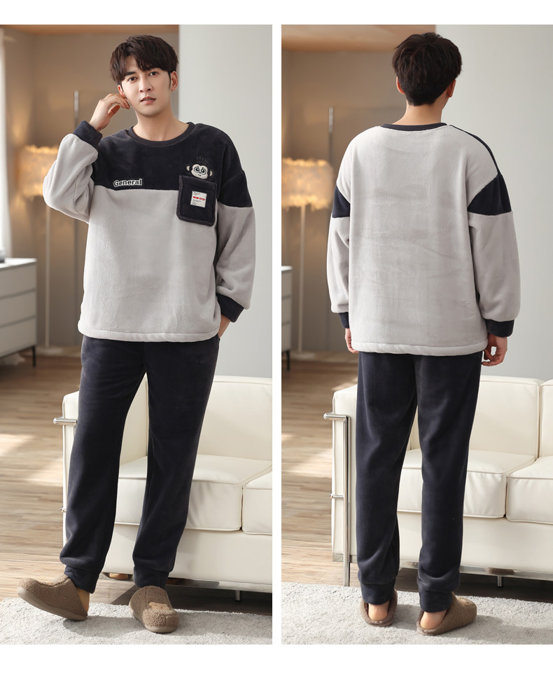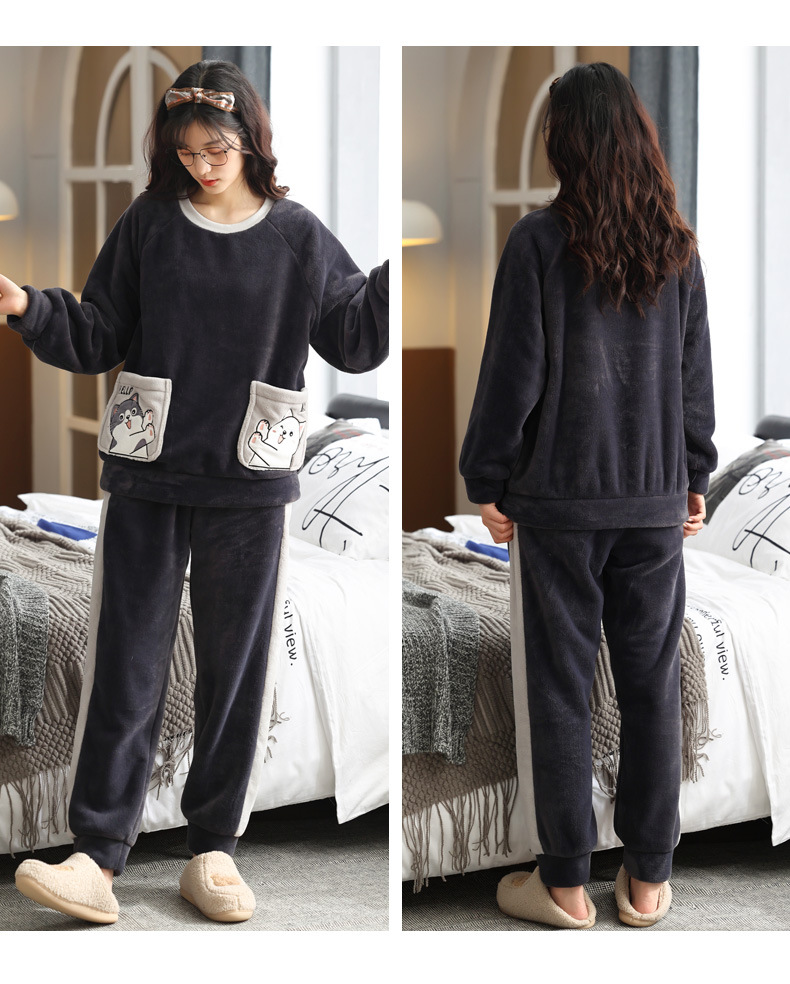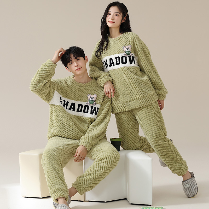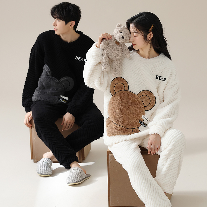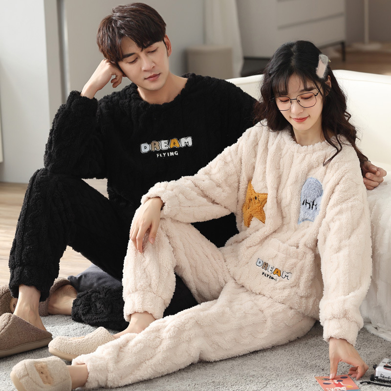 겨울 플란넬 커플 잠옷 남녀공용 가을 겨울 산호벨벳 라운드넥 겨울 두꺼운 보온 외출복 가능 홈웨어