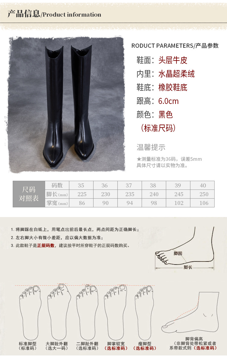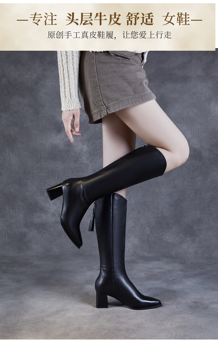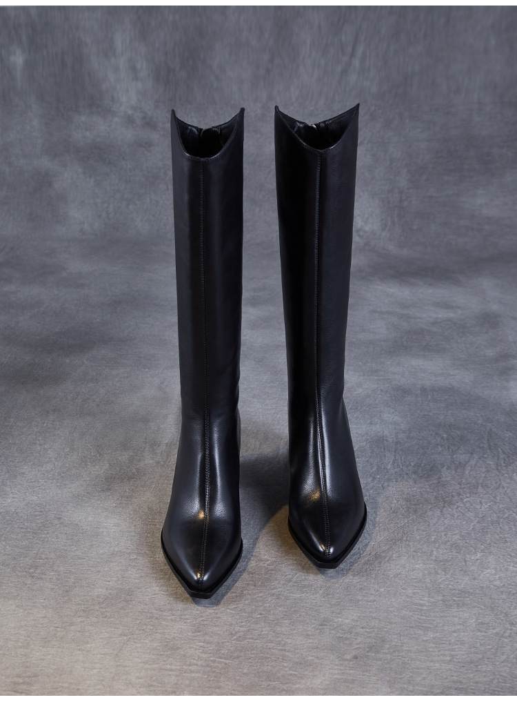 하이힐 V-입 라이더 부츠 여성용 2024 년 겨울 새 두꺼운 힐 유행 가죽 뾰족한 발가락 쁘띠 후방 지퍼 롱 부츠스토어 가기