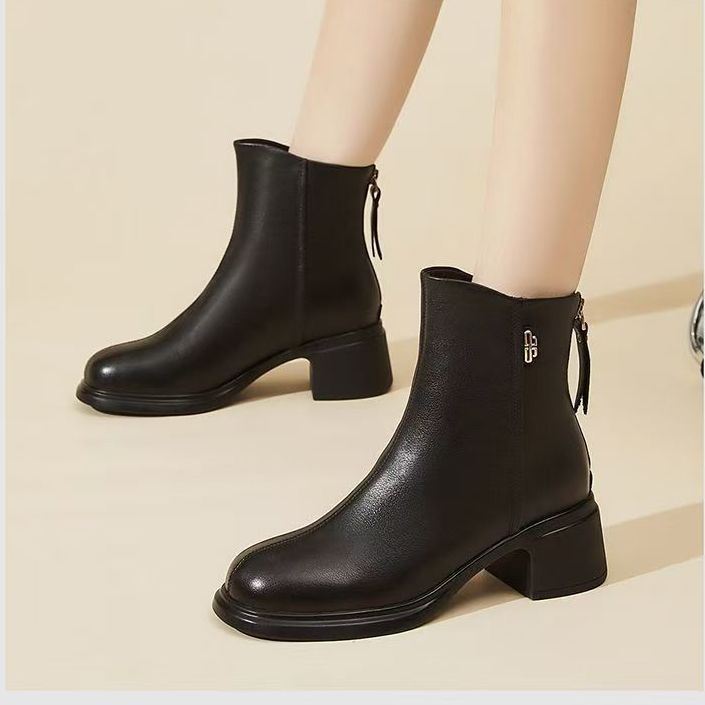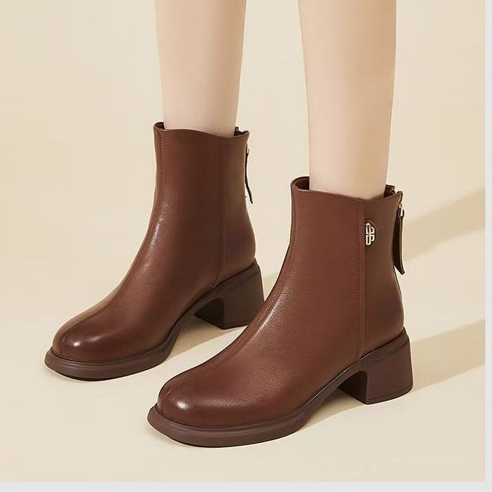 소프트 가죽 마틴 부츠 여성 가을 기모 2024 새로운 두꺼운 힐 조커 리어 지퍼 소프트 하단 미드 힐 엄마 발목 부츠