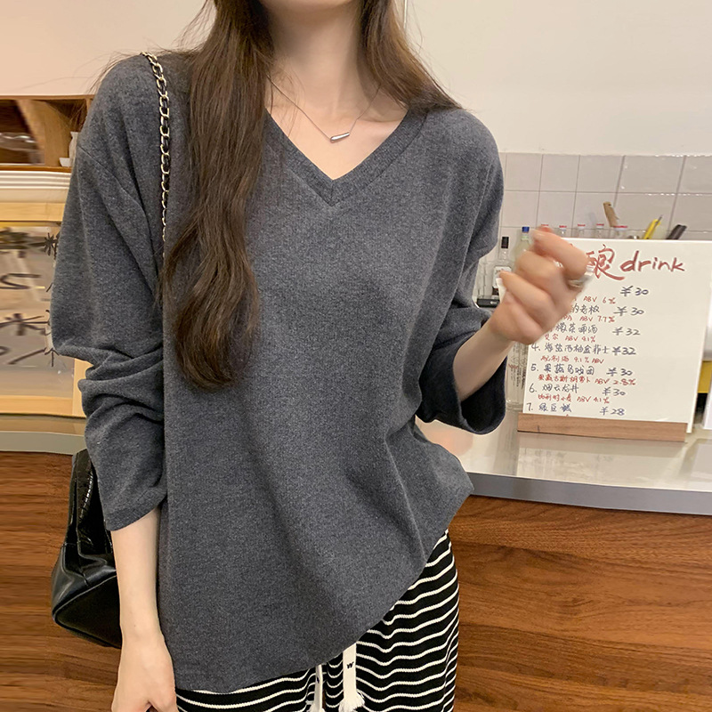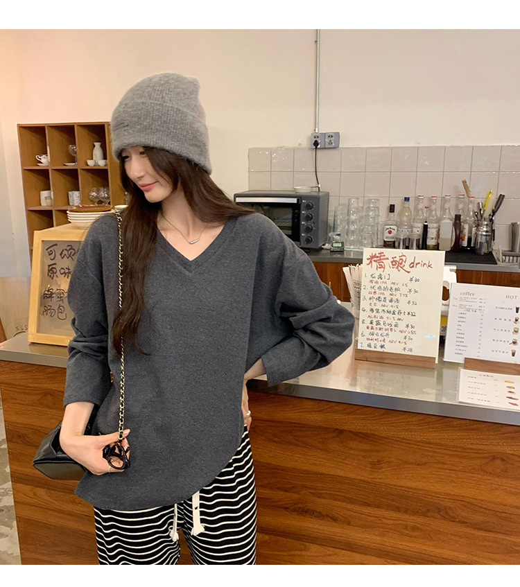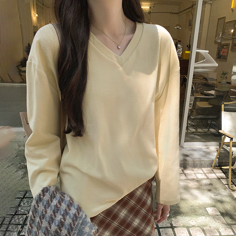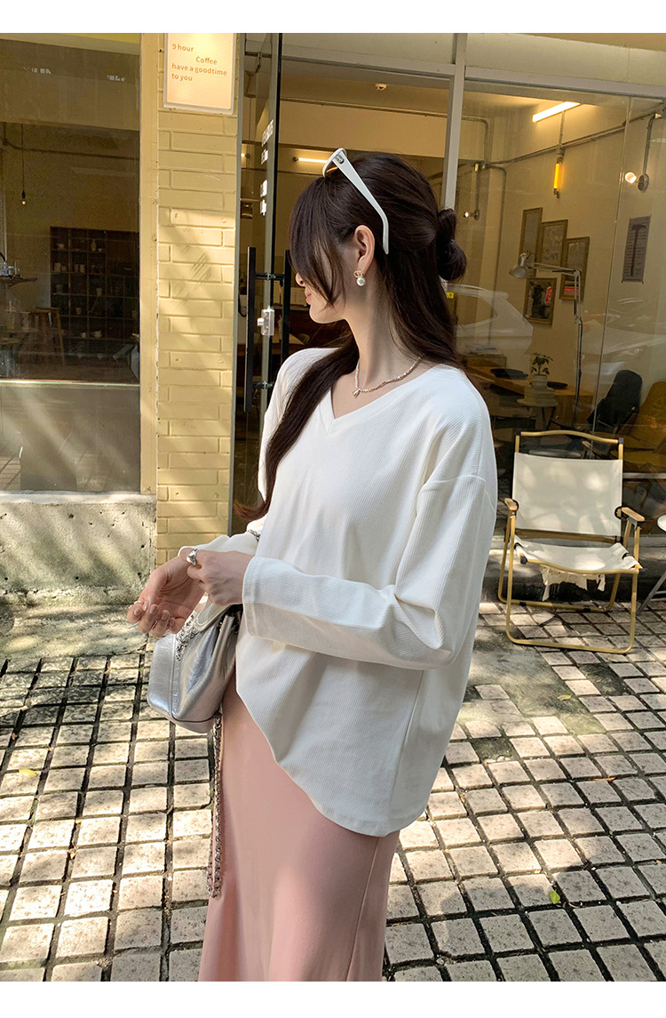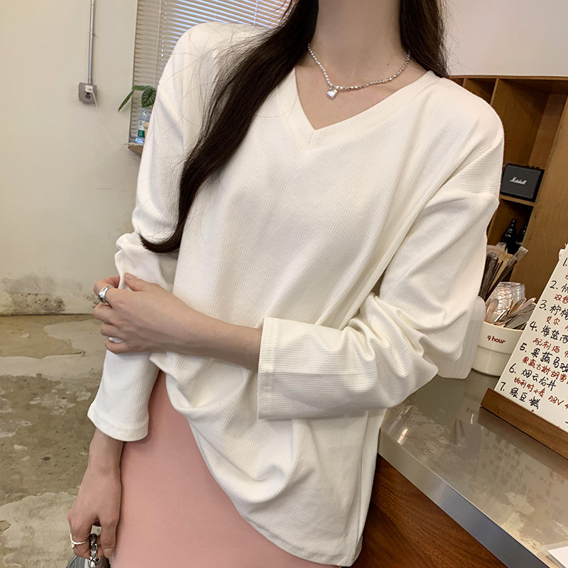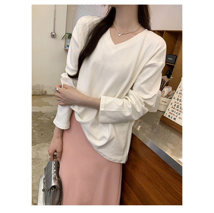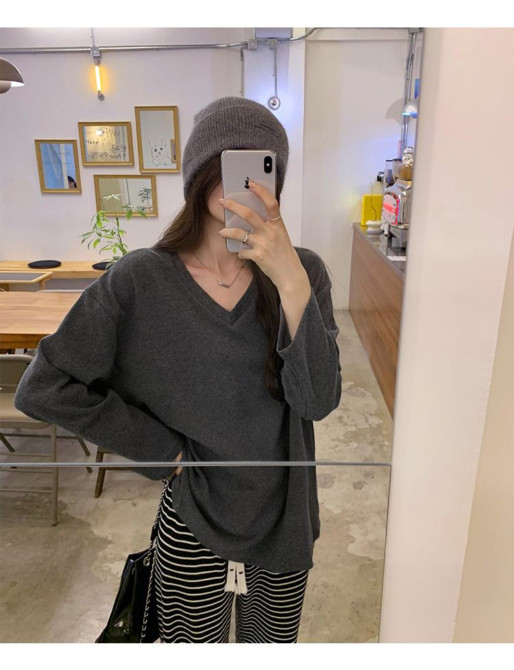 느슨한 게으르고 편안한 느낌 슈퍼 잘 생긴 V 넥 긴팔 티셔츠 여성의 2024 가을과 겨울 새로운 슬림 올 매치베이스 코트스토어 가기