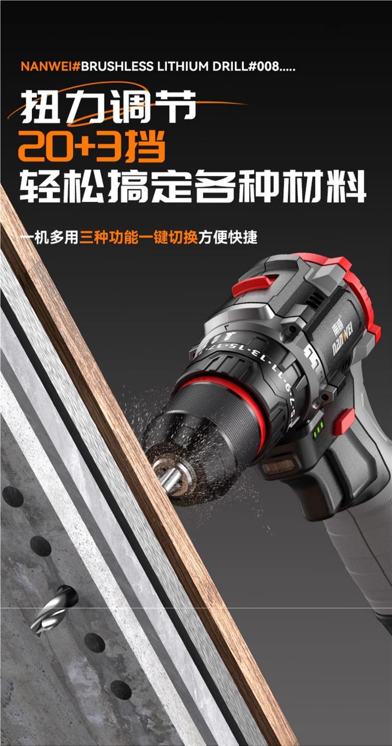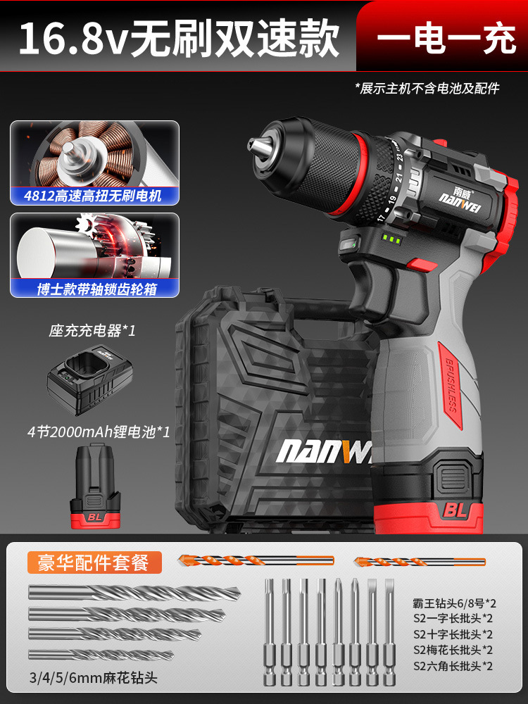 Nanwei 브러시리스 타악기 전기 드릴 가정용 핸드 전기 드릴 전기 드라이버 금속 래칫 척 충격 리튬 전기 드릴