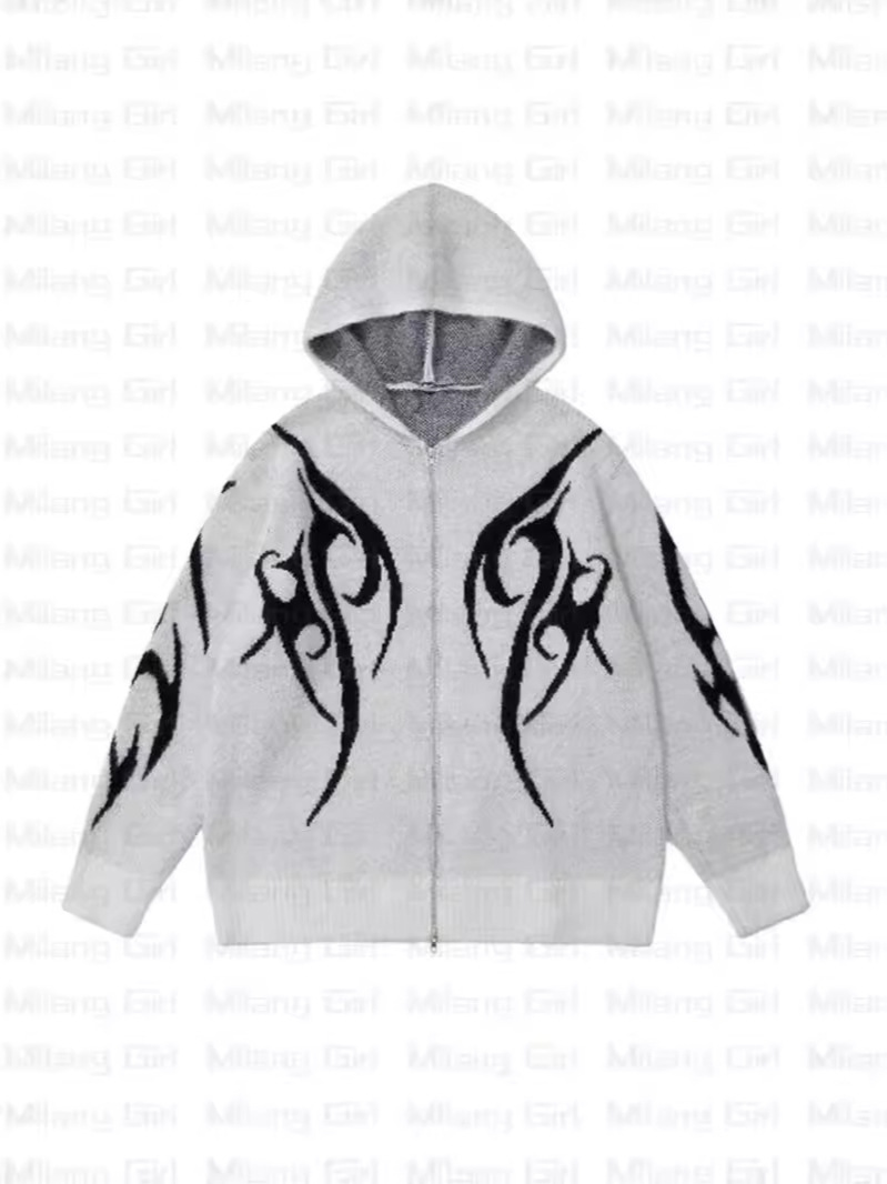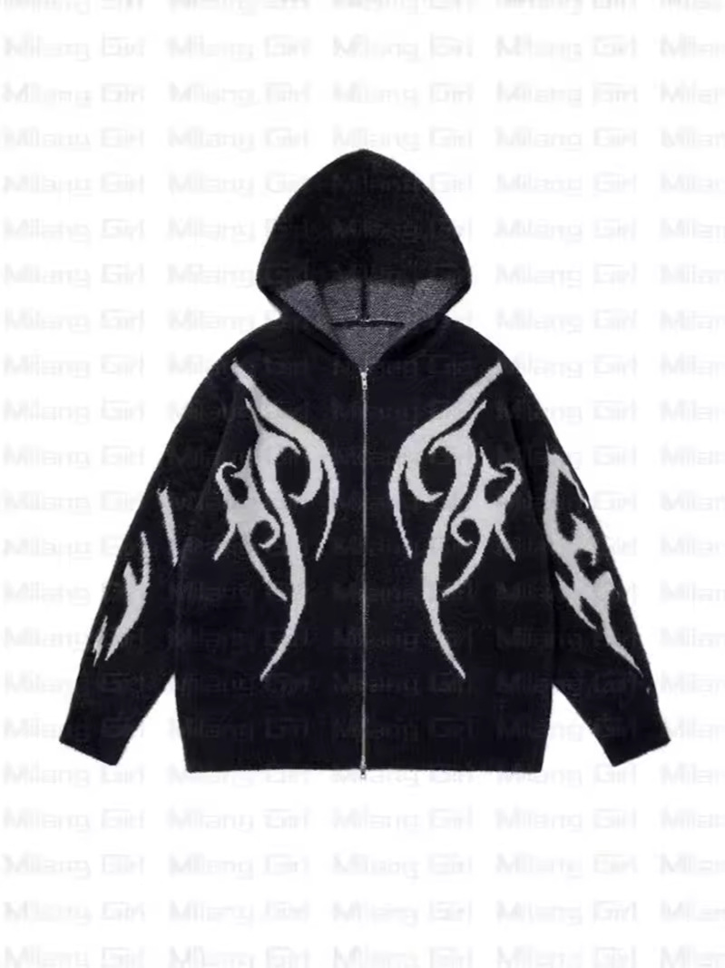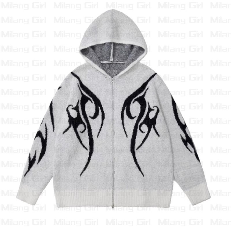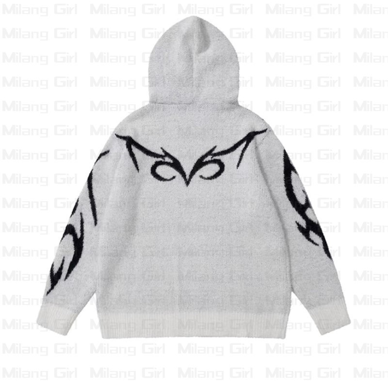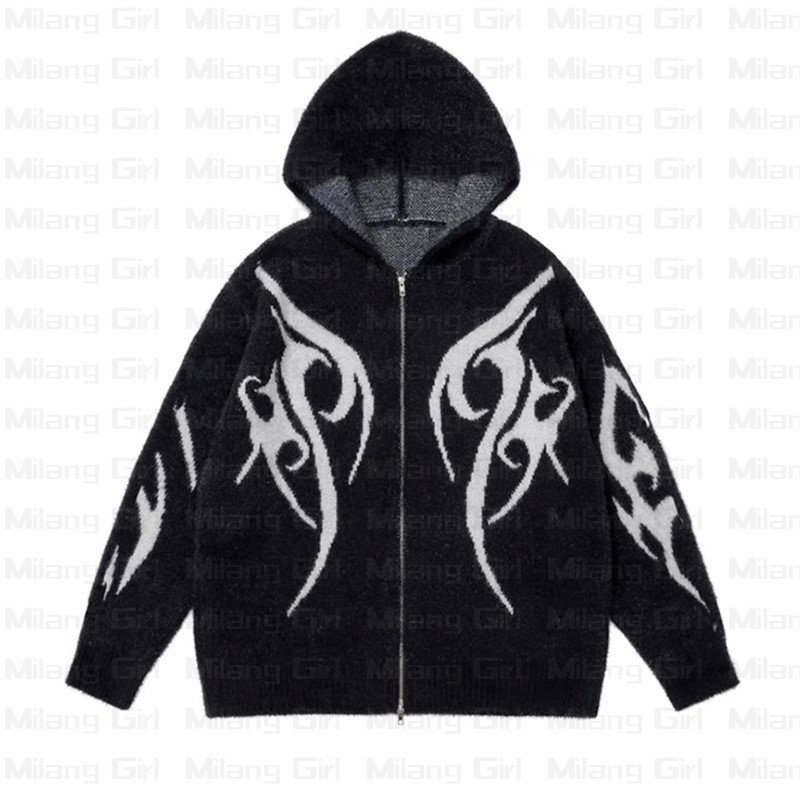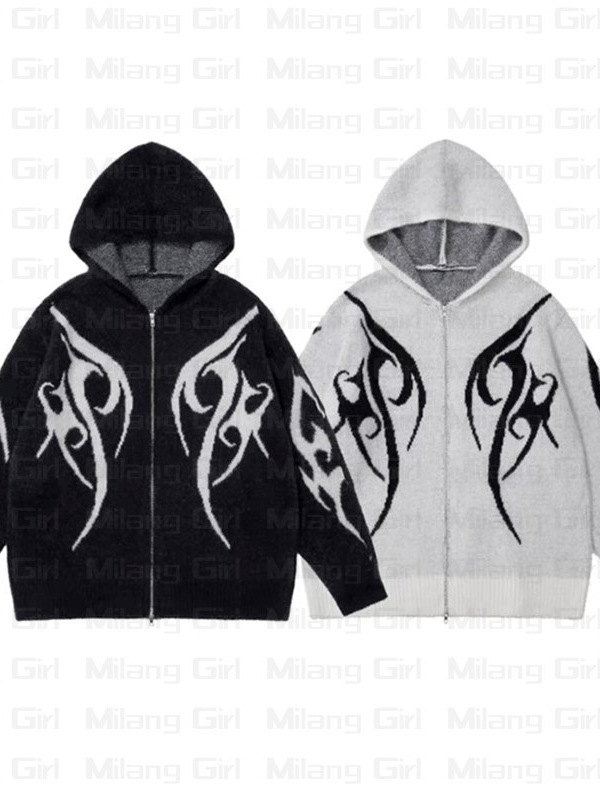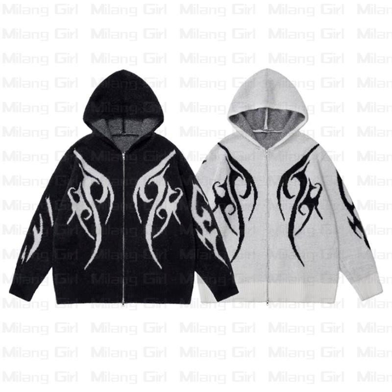 유럽과 미국의 다크 가시 자카드 후드 지퍼 스웨터 카디건 남성과 여성을위한 가을과 겨울 긴 소매 느슨한 커플 니트웨어