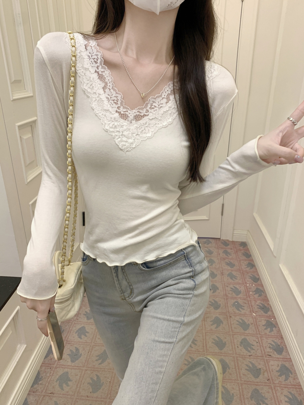 브이넥 긴팔베이스 셔츠 여성의 2024 가을 및 겨울 착용 슬림핏 슬리밍 티셔츠 여성용 샌딩 레이스 짧은 따뜻한 탑 트렌디