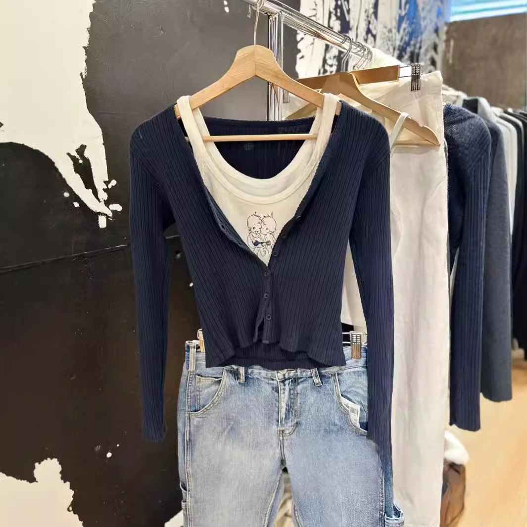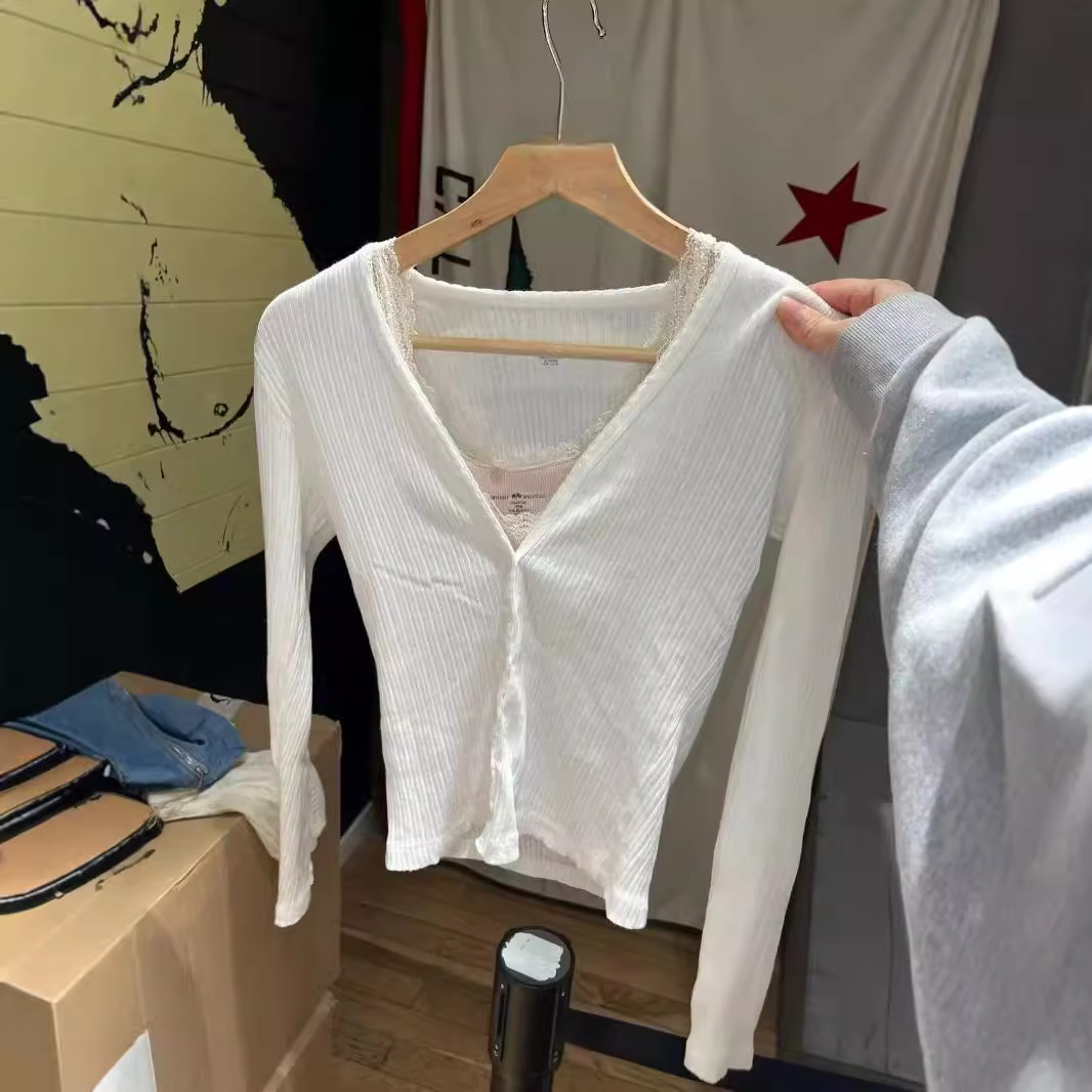 브랜디 BM 새로운 화이트 V 넥 레이스 버클 타이트 긴 소매 니트 카디건 여성의 가을 Bm 스위트 탑