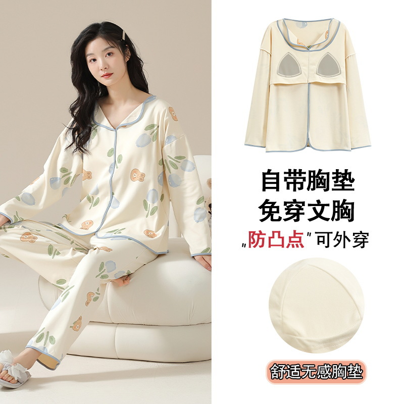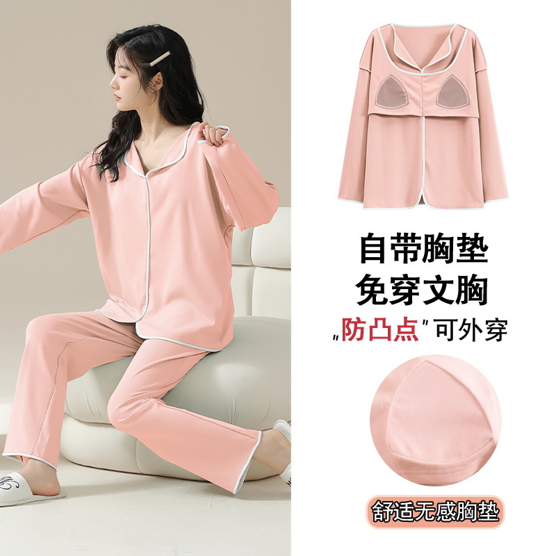 빛을 방지하기 위해 가슴 패드가 달린 새로운 잠옷 여성의 봄과 가을 긴 소매는 여성 가정 의류 세트 대외 무역 도매 밖에서 착용 할 수 있습니다.스토어 가기