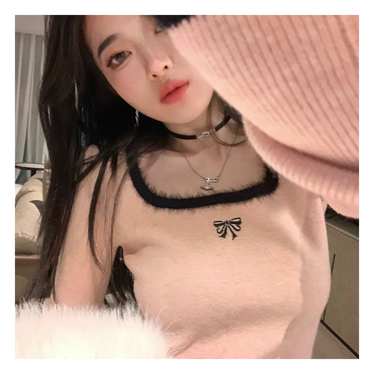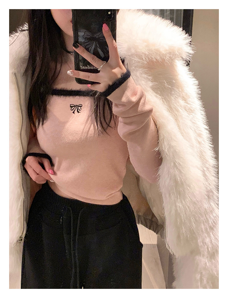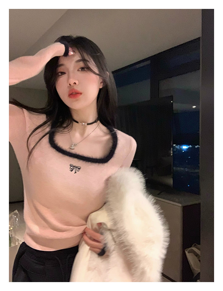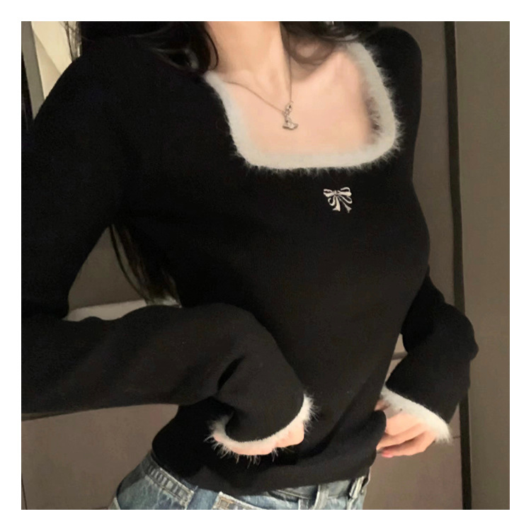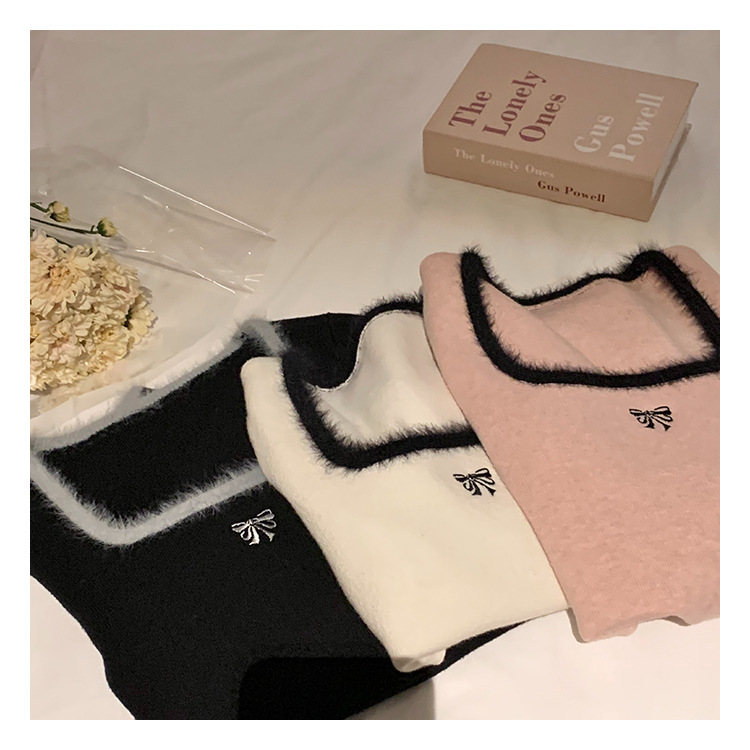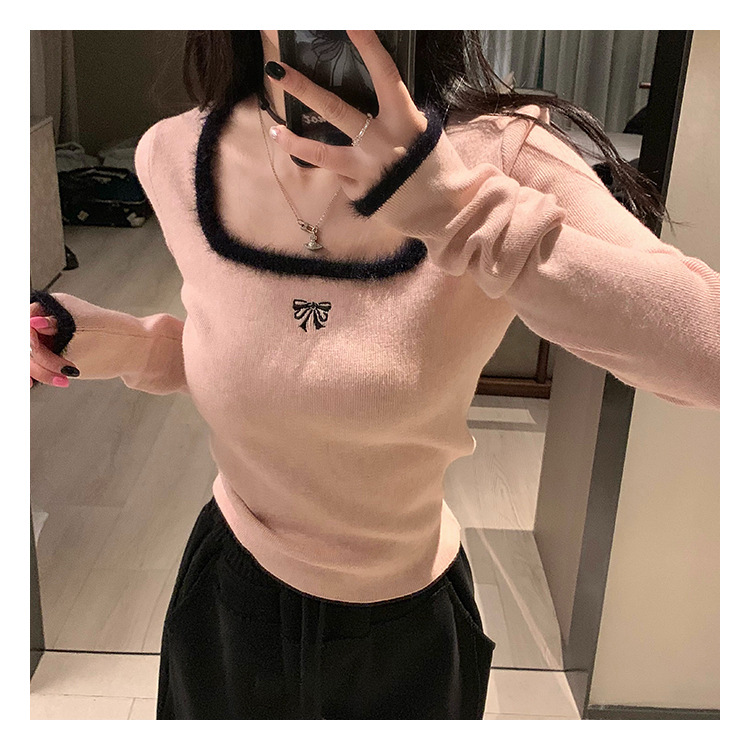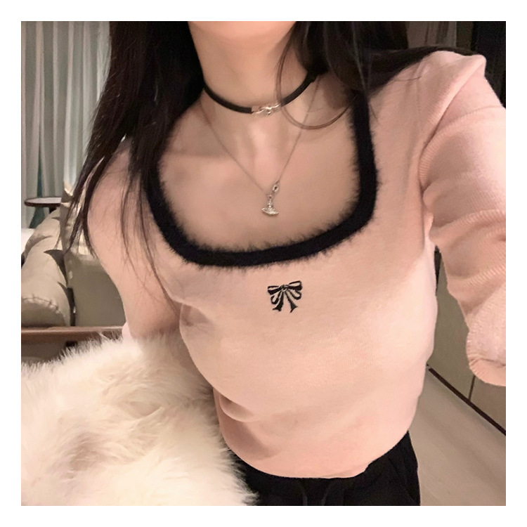 De Rong 순수한 욕망 스타일 하이 엔드 스타일 스퀘어 칼라 자수 가을과 겨울 새로운 내부 슬림 핏 짧은베이스 셔츠 긴팔 탑