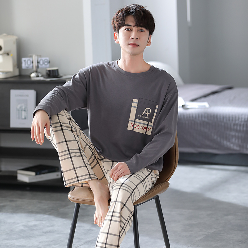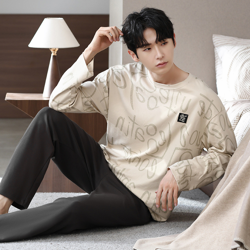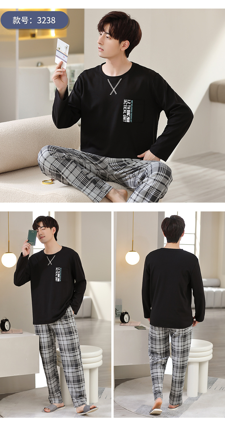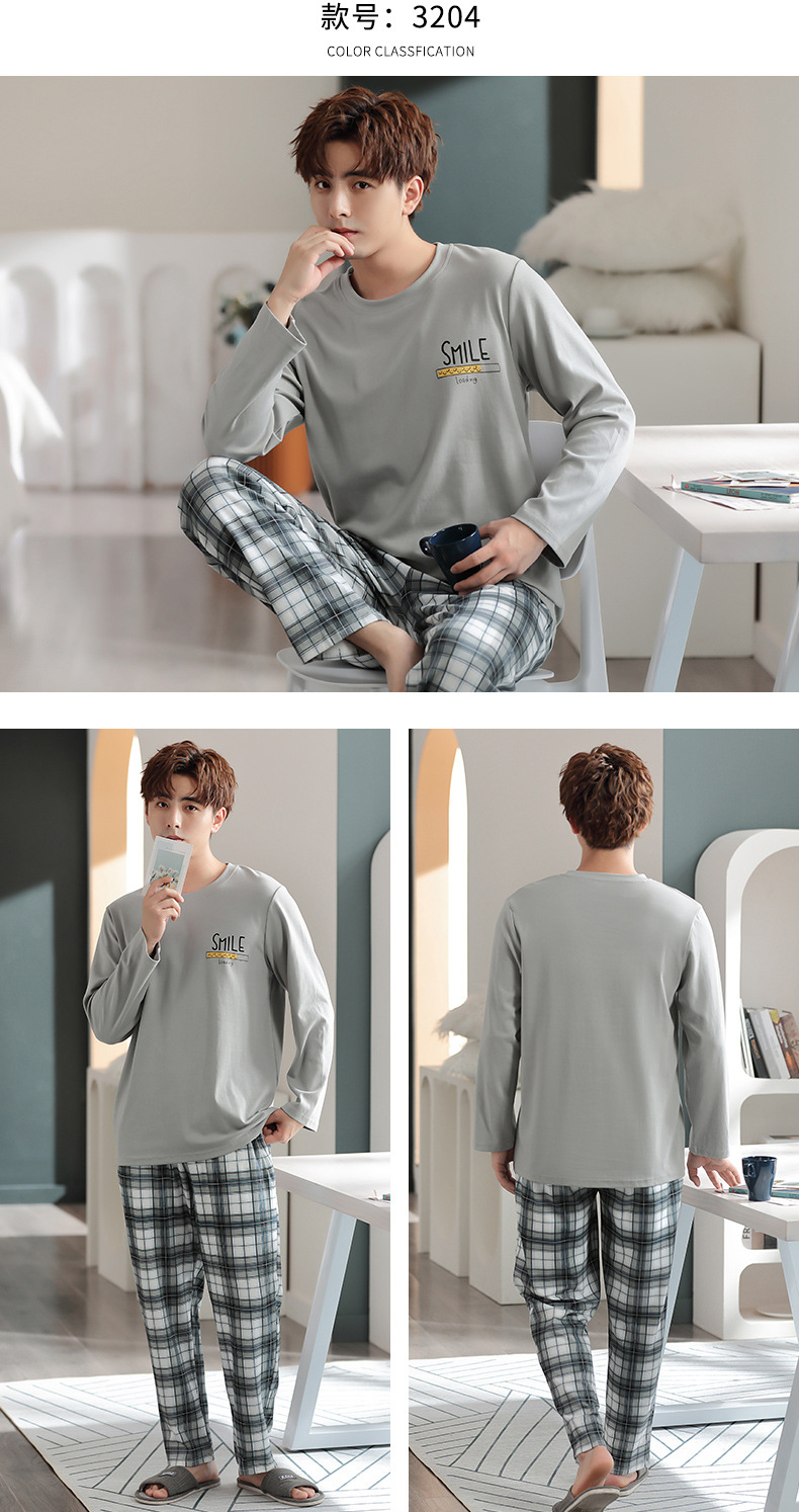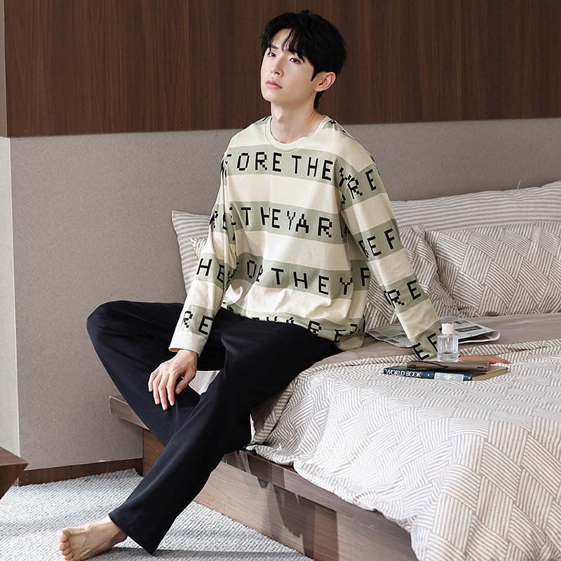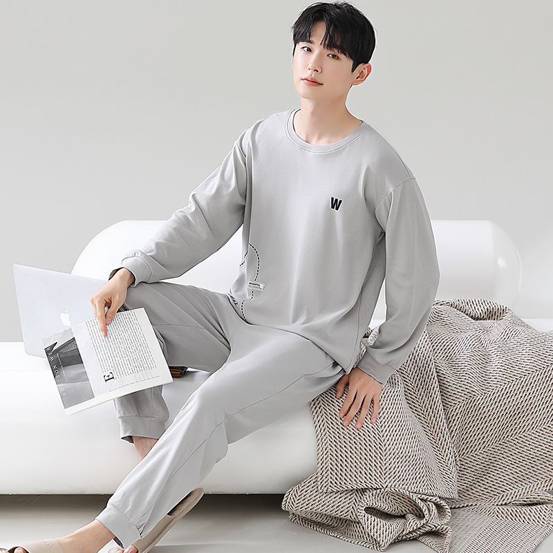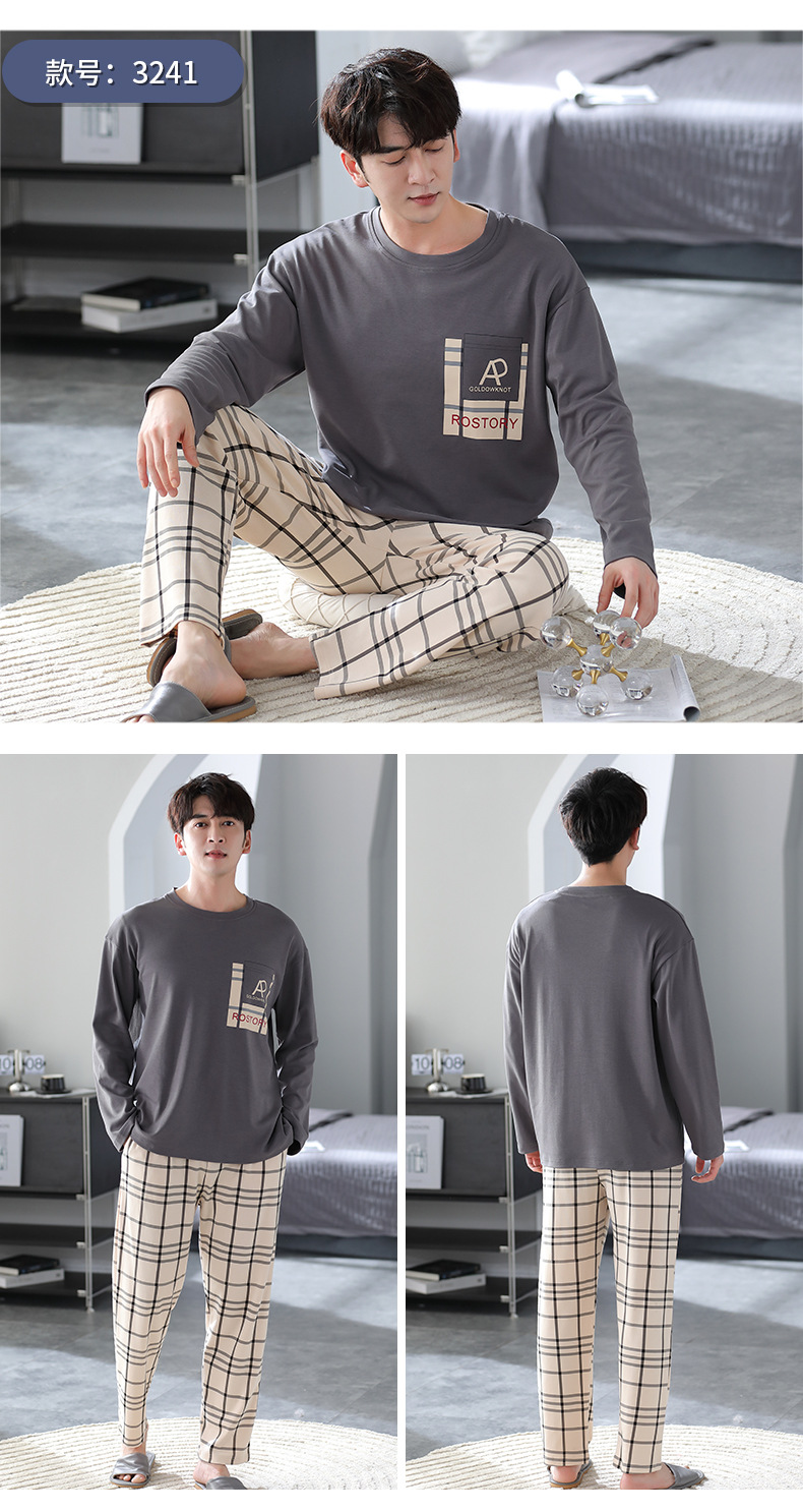 100% 양면 두꺼운 순면 남성용 잠옷 가을과 겨울 긴 소매 캐주얼 라운드 넥 아웃웨어 청소년 홈 의류 세트스토어 가기