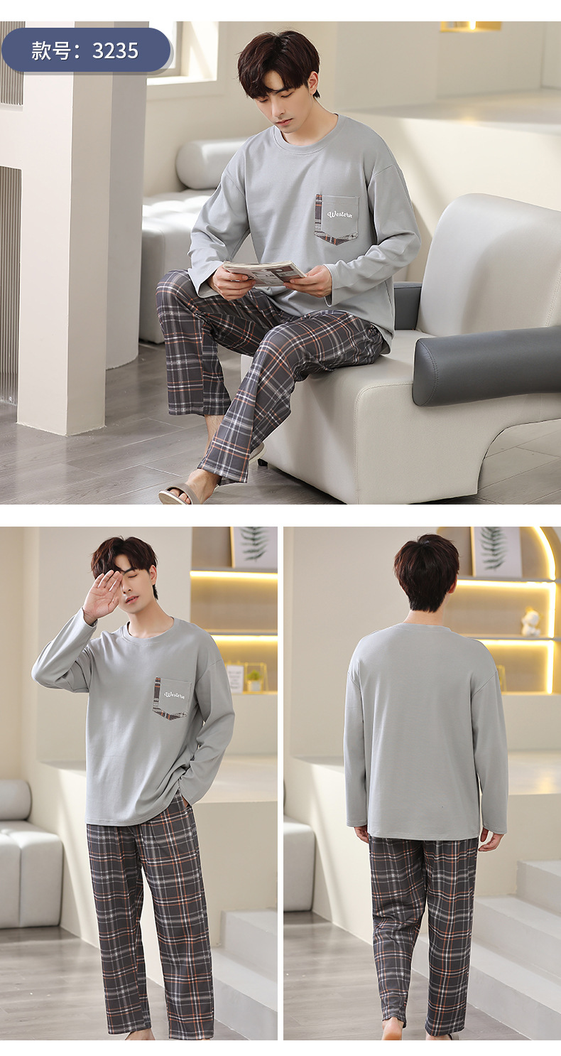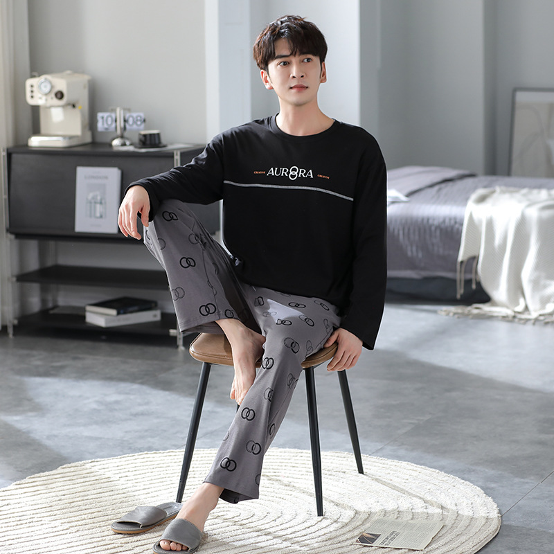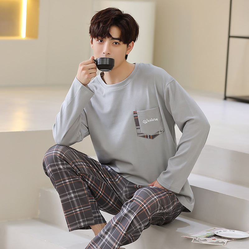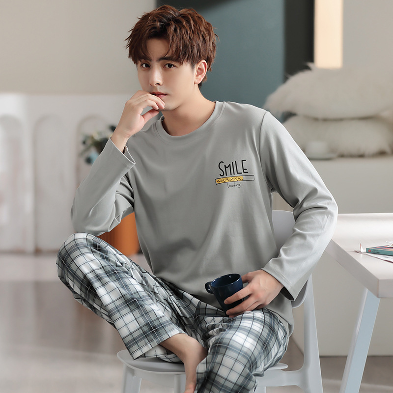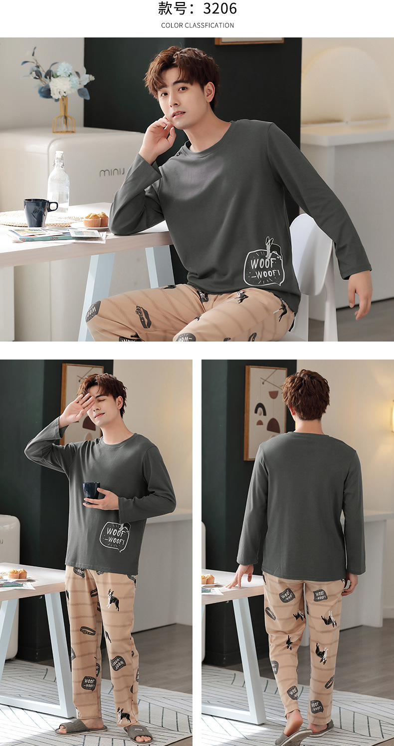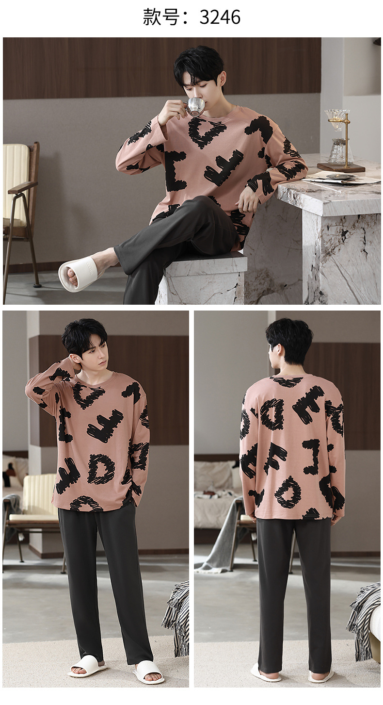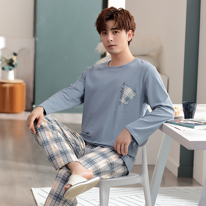100% 양면 두꺼운 순면 남성용 잠옷 가을과 겨울 긴 소매 캐주얼 라운드 넥 아웃웨어 청소년 홈 의류 세트스토어 가기
