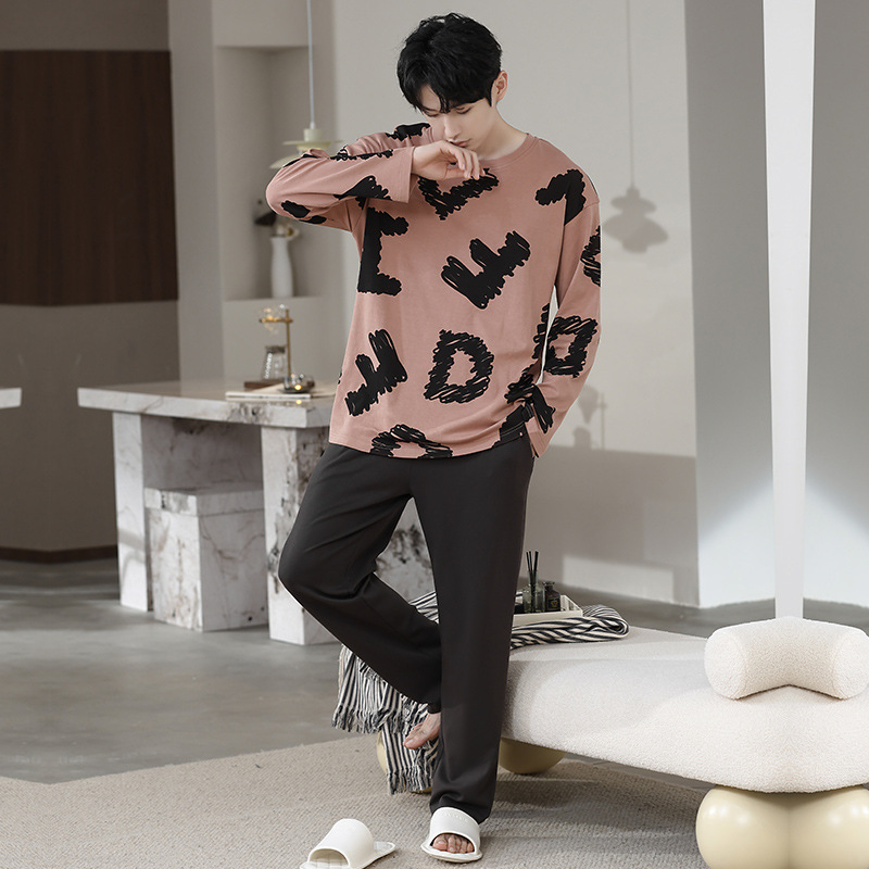 100% 양면 두꺼운 순면 남성용 잠옷 가을과 겨울 긴 소매 캐주얼 라운드 넥 아웃웨어 청소년 홈 의류 세트