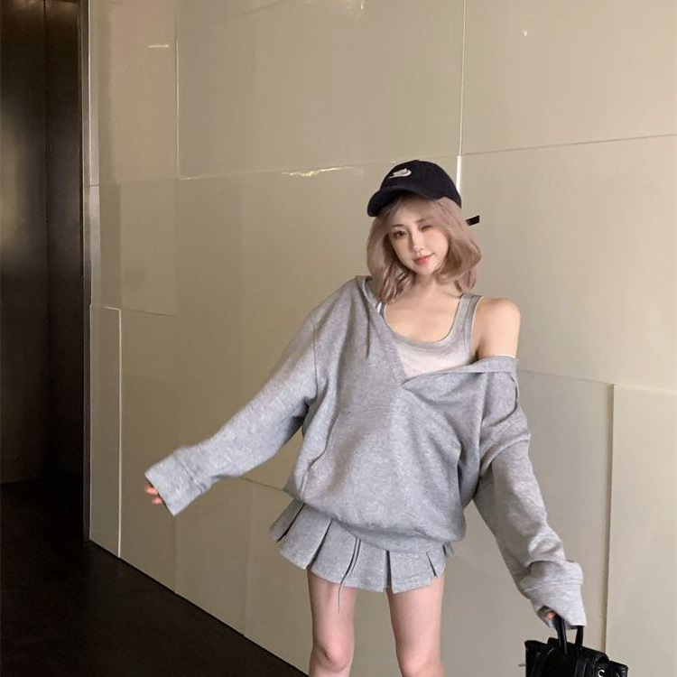• 회색 스웨트셔츠 + 조끼 + 스커트