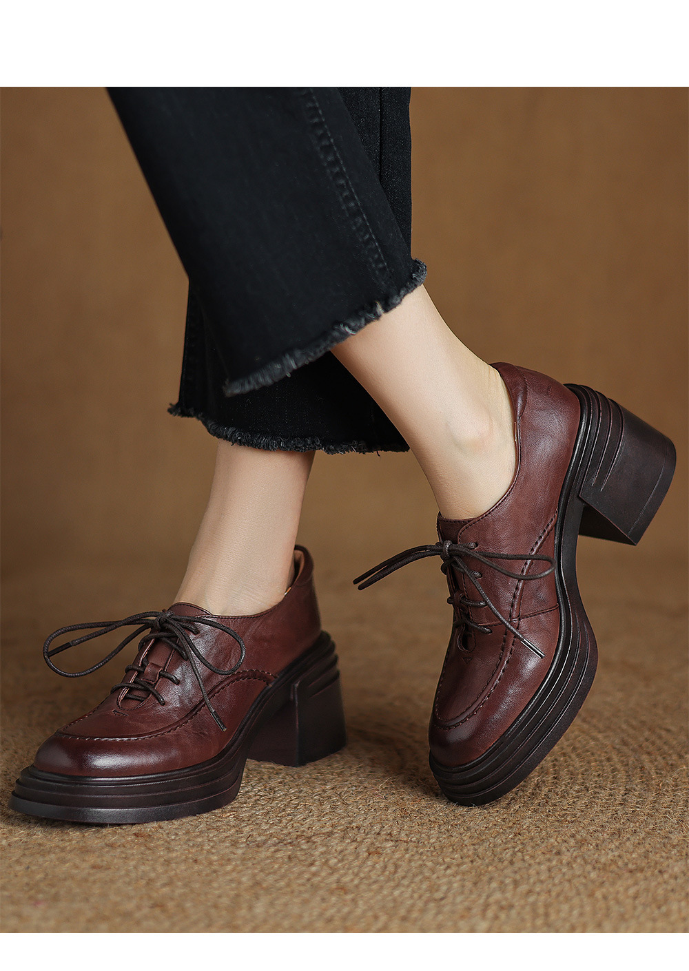 영국 스타일 하이힐 작은 가죽 신발 여성 빈티지 두꺼운 힐 라운드 토 레이스 업 로퍼 올 매치 작은 두꺼운 싱글 신발