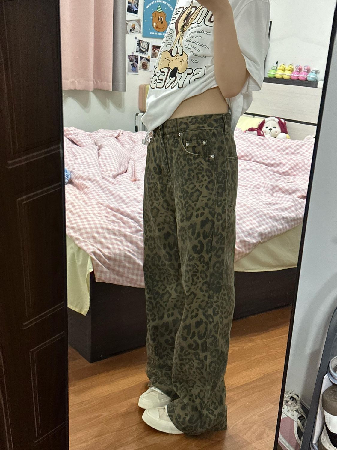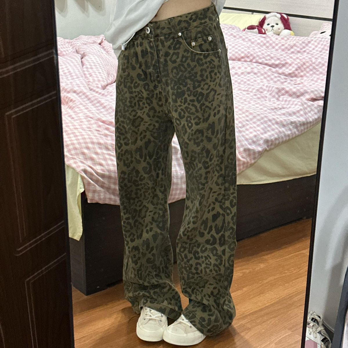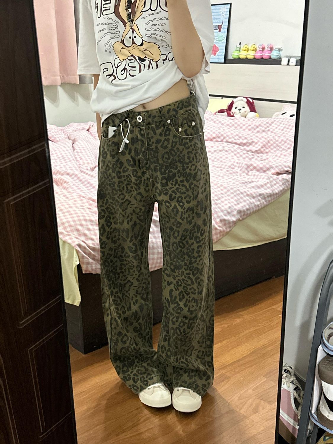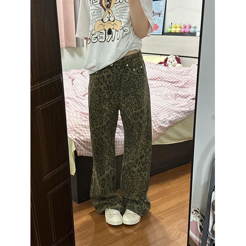 빈티지 레오파드 무늬 스트레이트 레그 와이드 레그 청바지 여성의 2024 가을 새로운 미국 스타일 높은 허리 캐주얼 루즈 걸레 바지스토어 가기