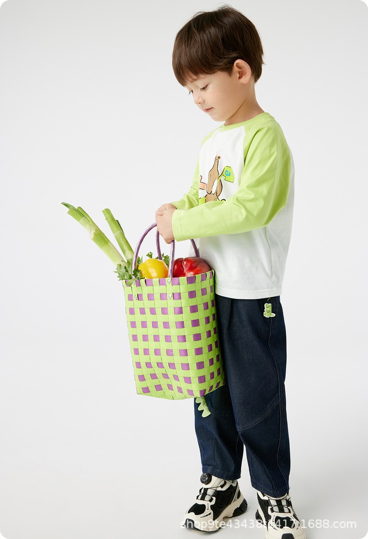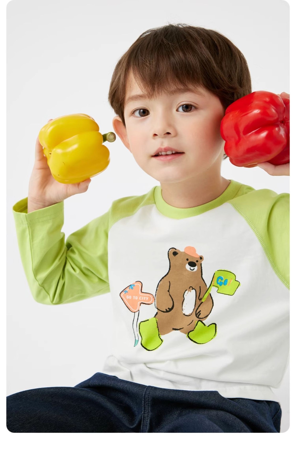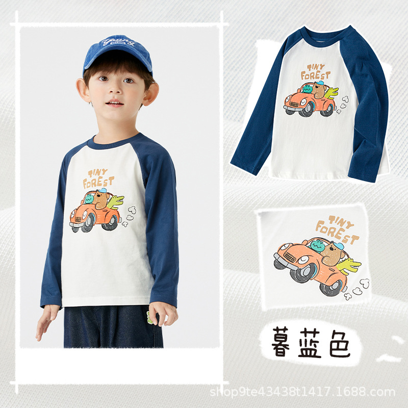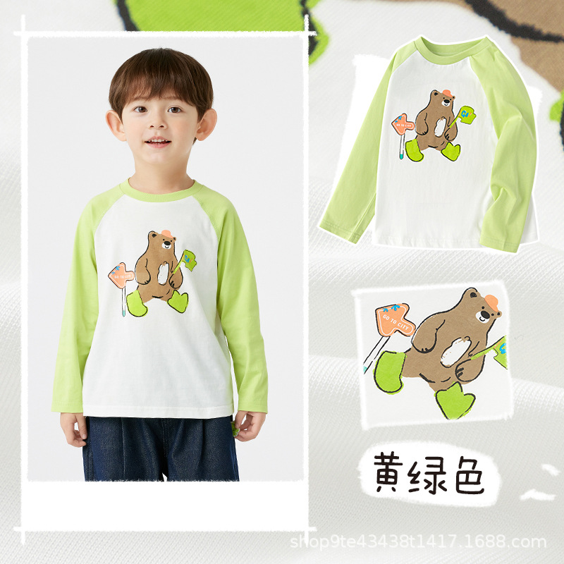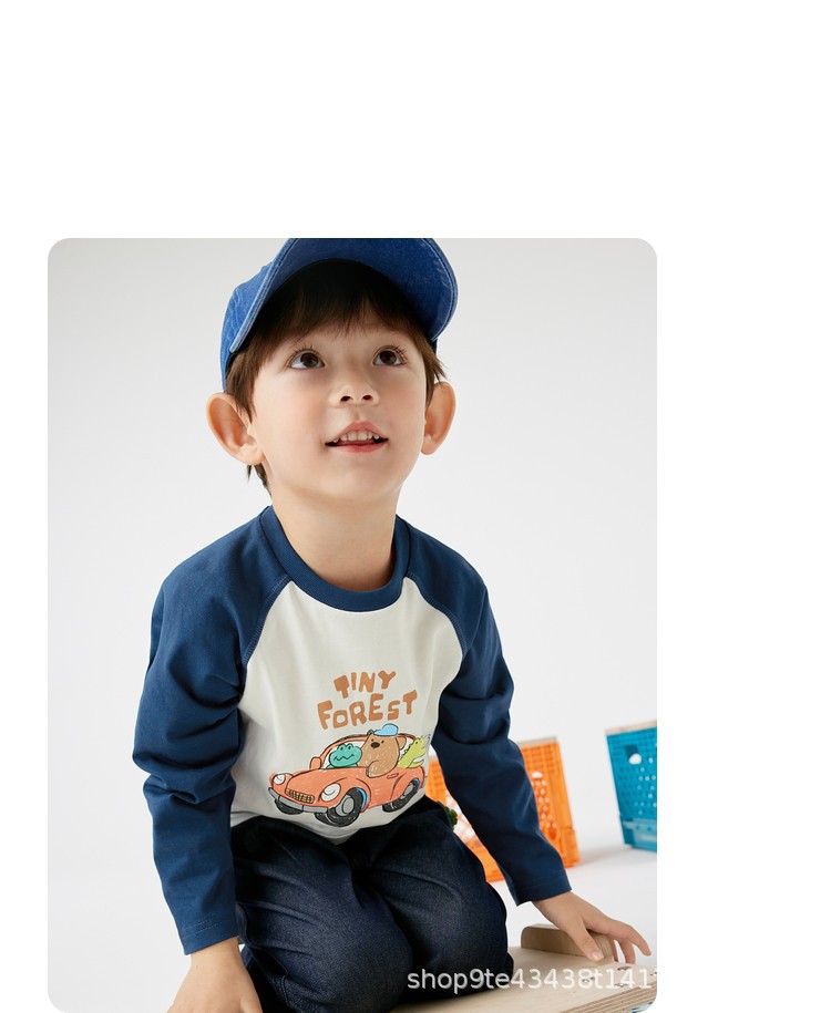 스티치 대비 색상 소년 긴팔 봄 2025 새로운 어린이 티셔츠 순수 코튼 바닥 셔츠 가을 의류 빗질 코튼 만화스토어 가기