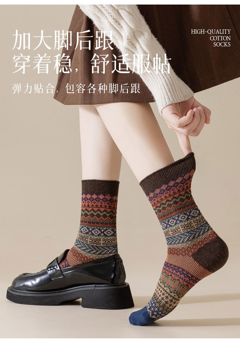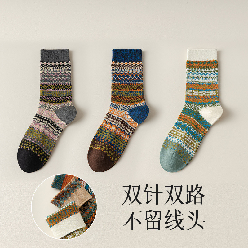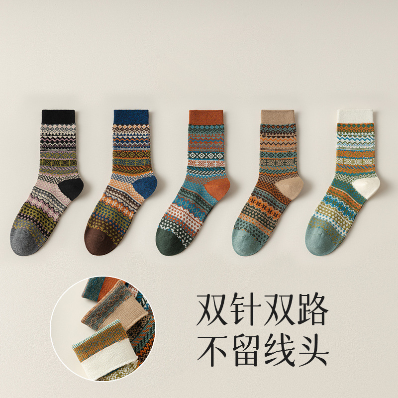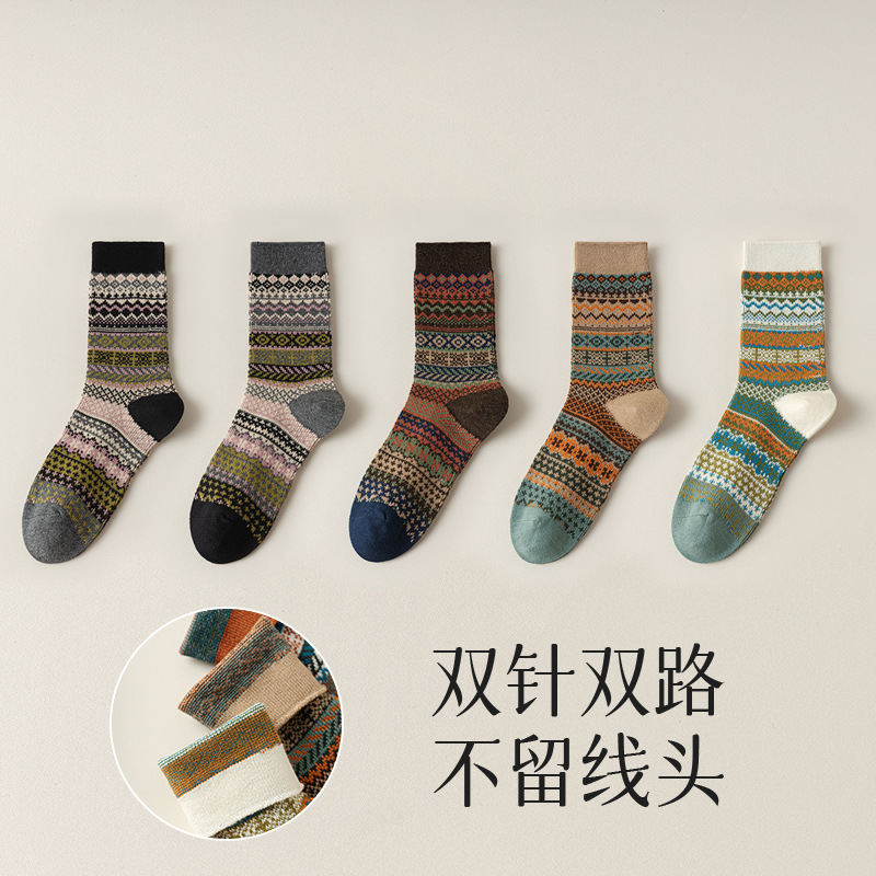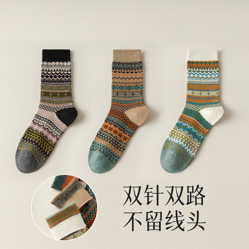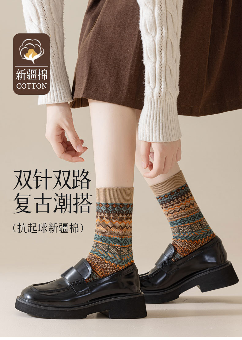 양말 여성용 미드 양말 가을과 겨울 더블 바늘 민족 스타일 레트로 트렌디 양말 안티 필링 신강 코튼 작은 가죽 신발