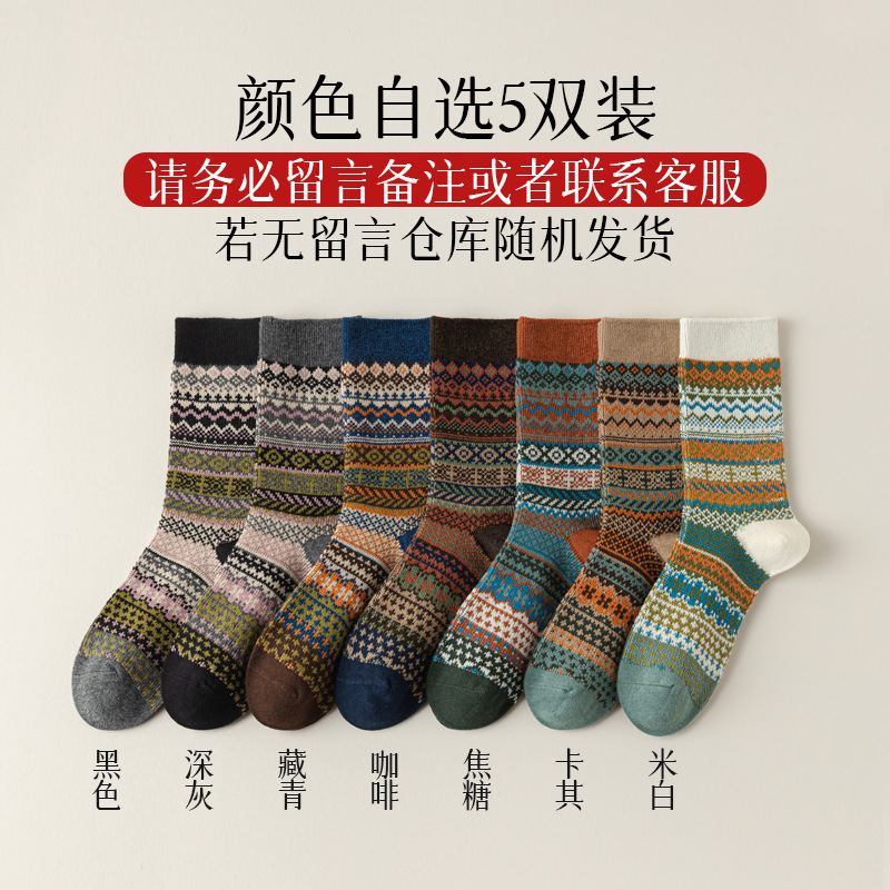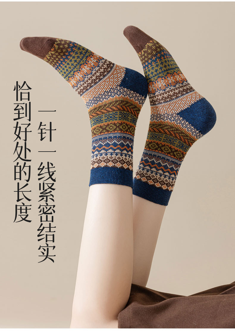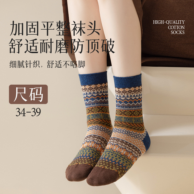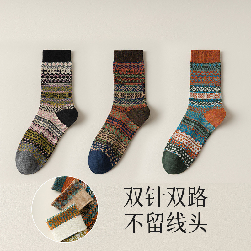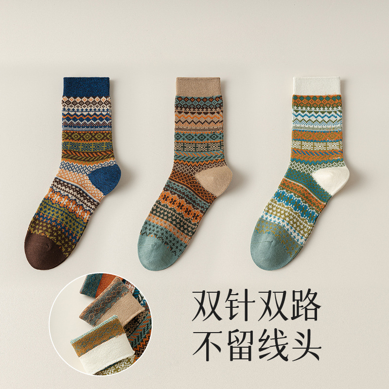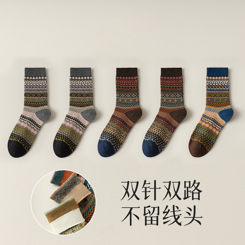양말 여성용 미드 양말 가을과 겨울 더블 바늘 민족 스타일 레트로 트렌디 양말 안티 필링 신강 코튼 작은 가죽 신발