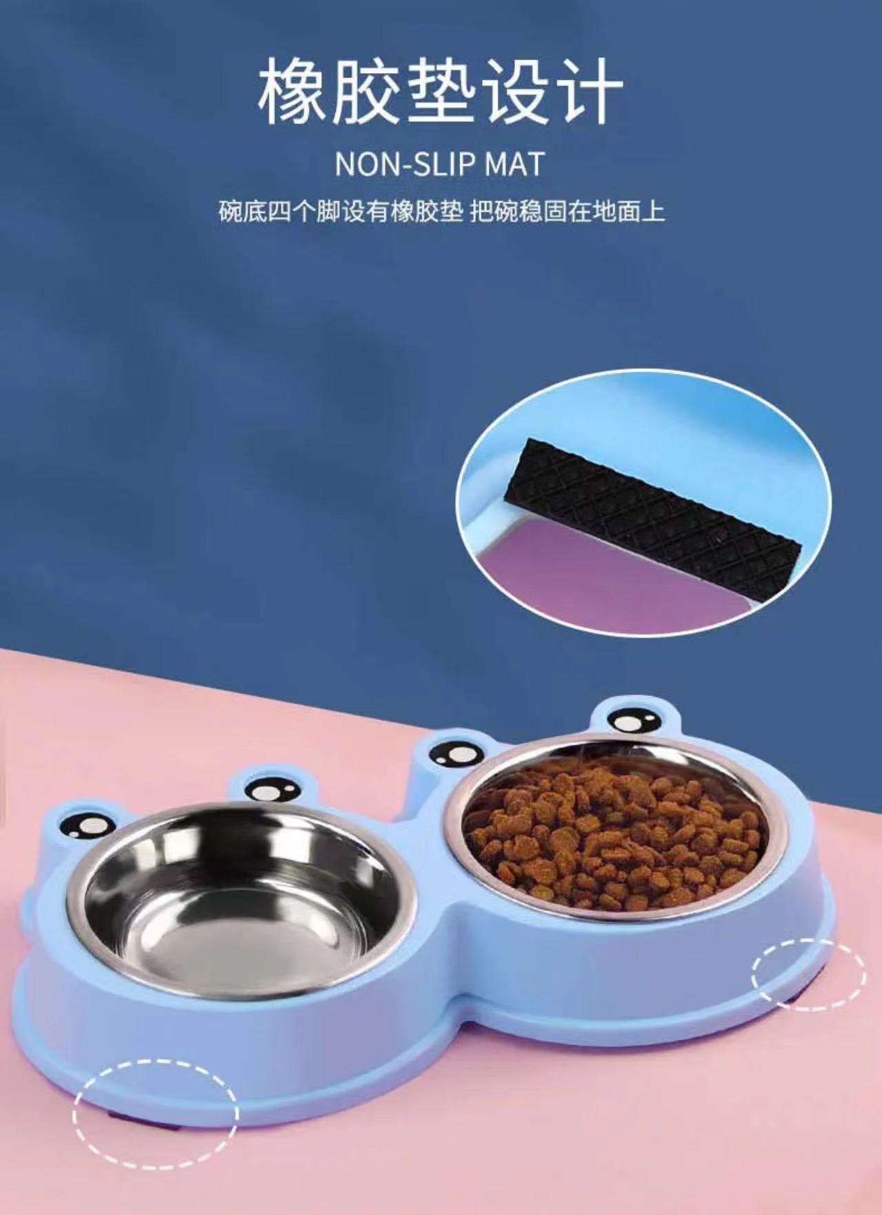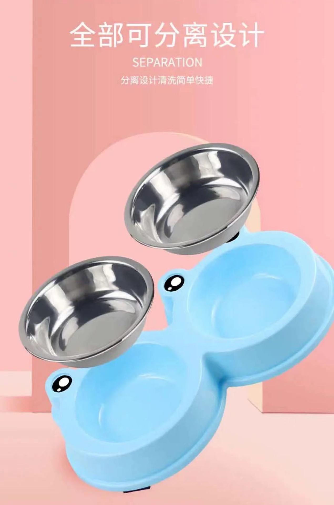 고양이 그릇 개 그릇 애완 동물 그릇 도매 고양이와 개 먹고 마시는 플라스틱 스테인레스 스틸 개구리 더블 그릇 애완 동물 도구스토어 가기