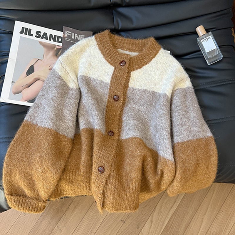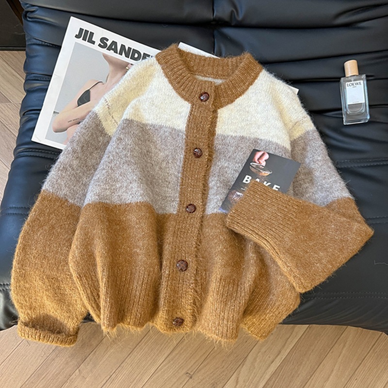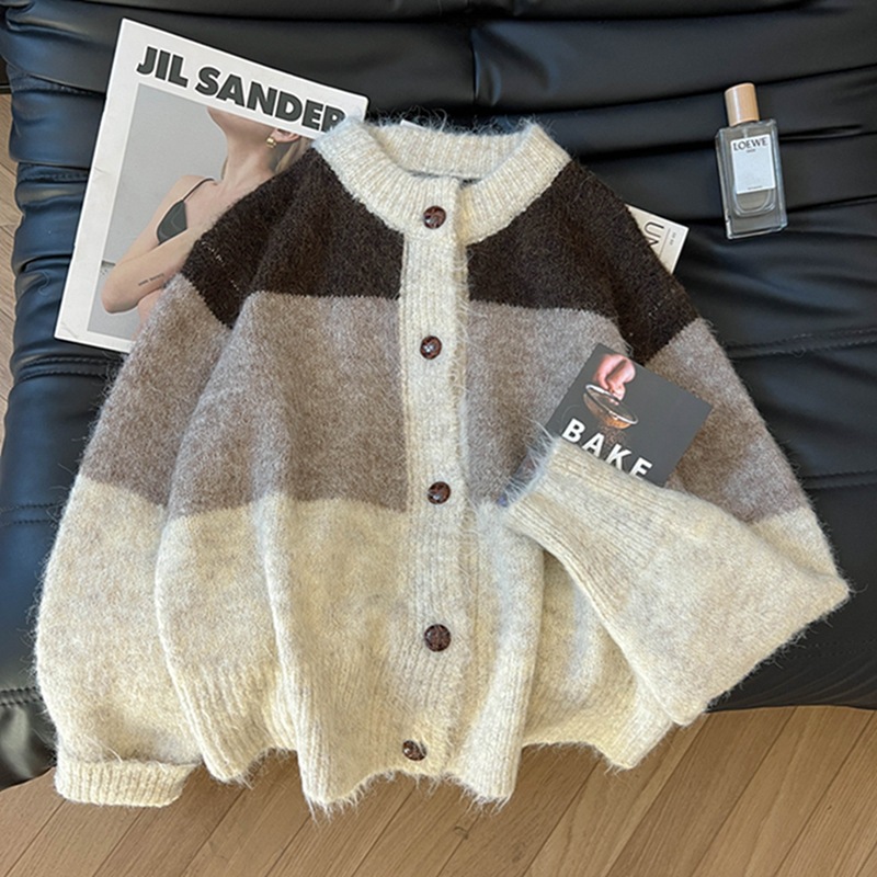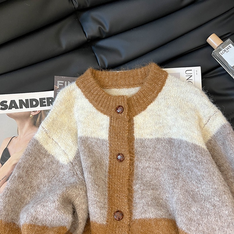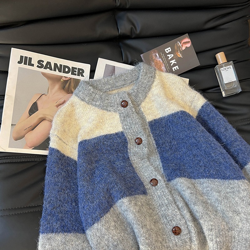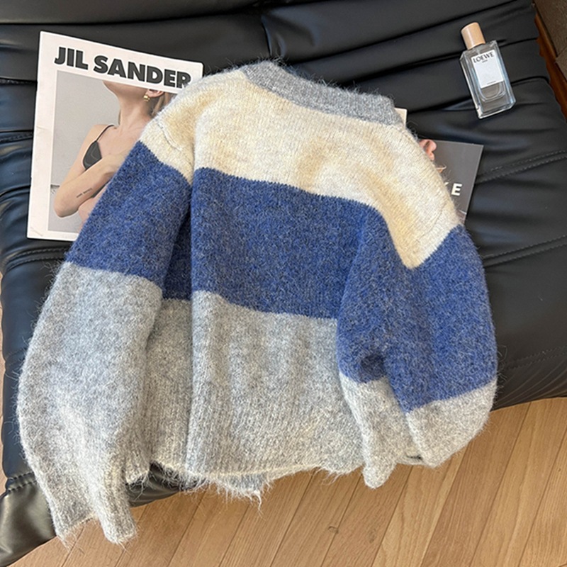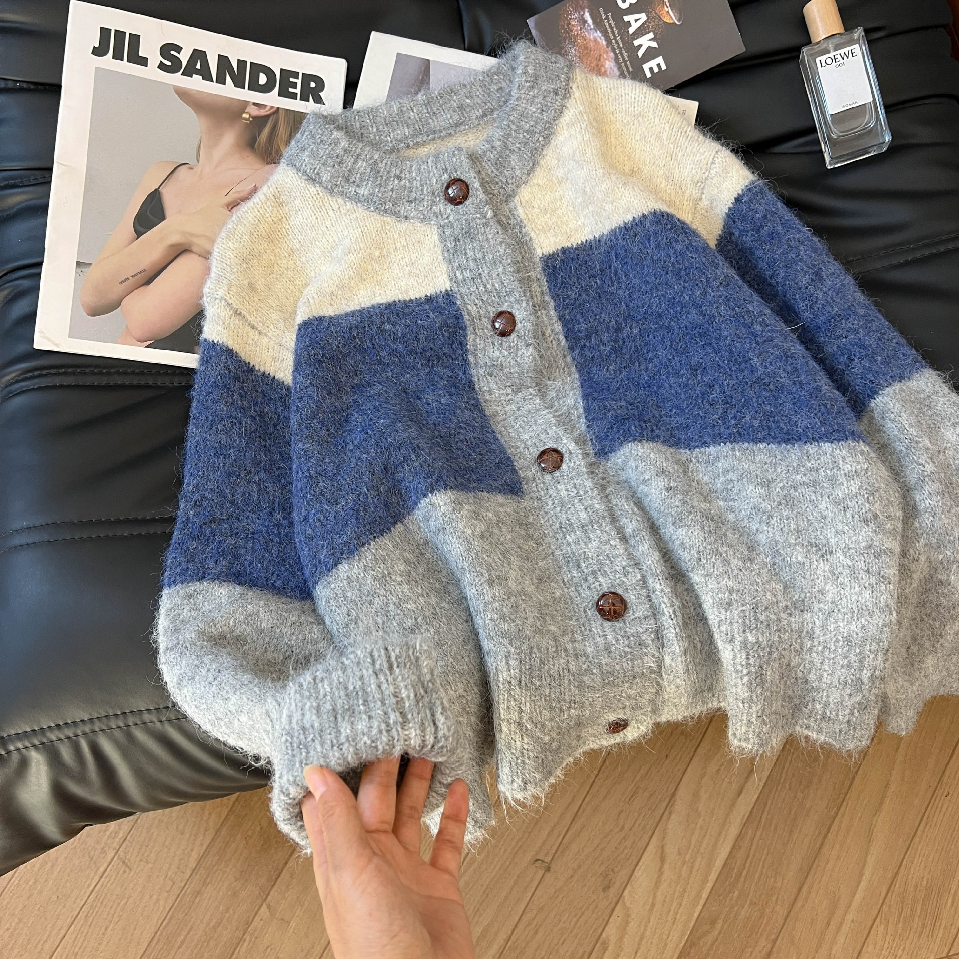 撞色条纹毛衣外套女秋冬季复古慵懒风设计感百搭针织