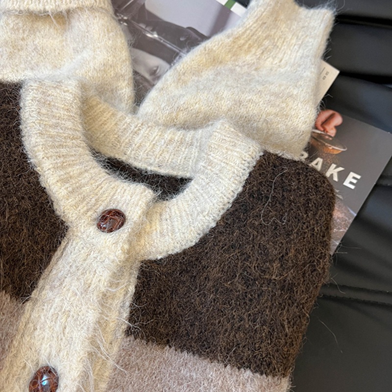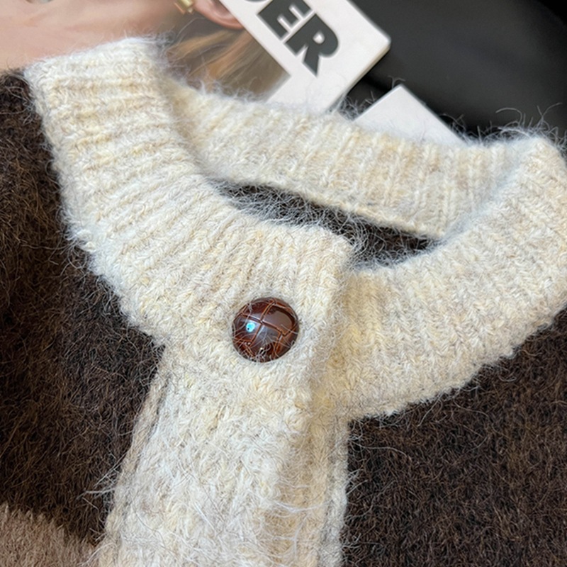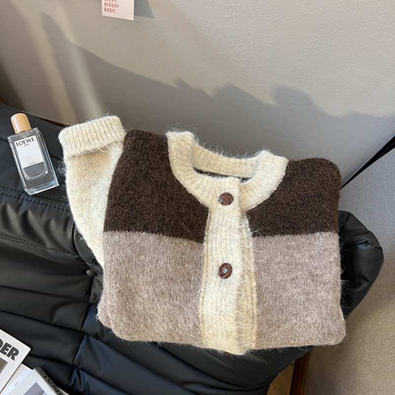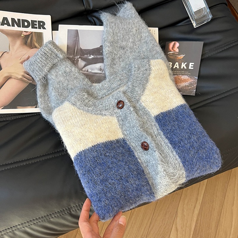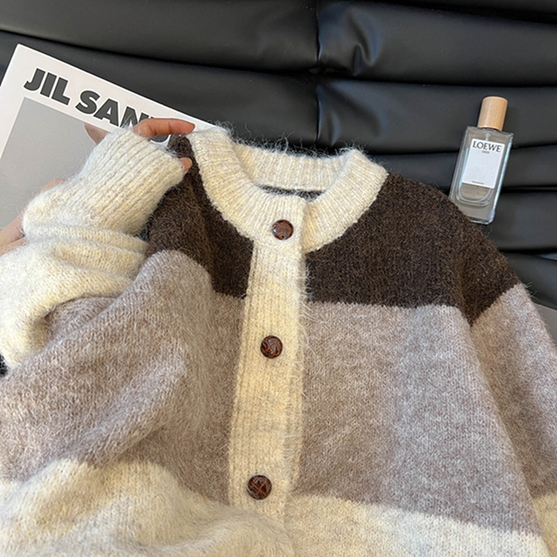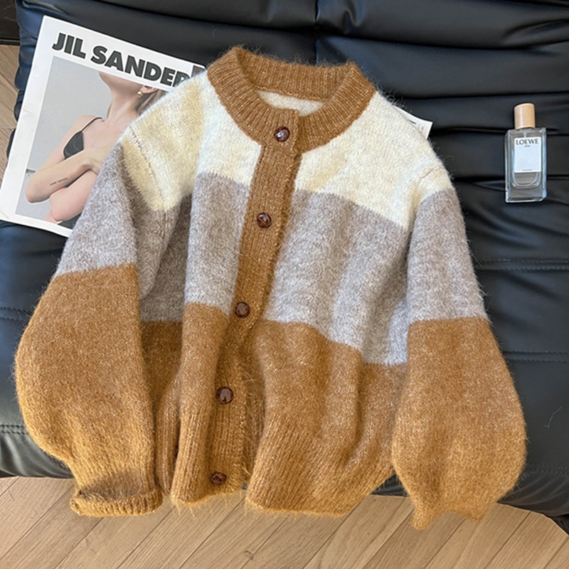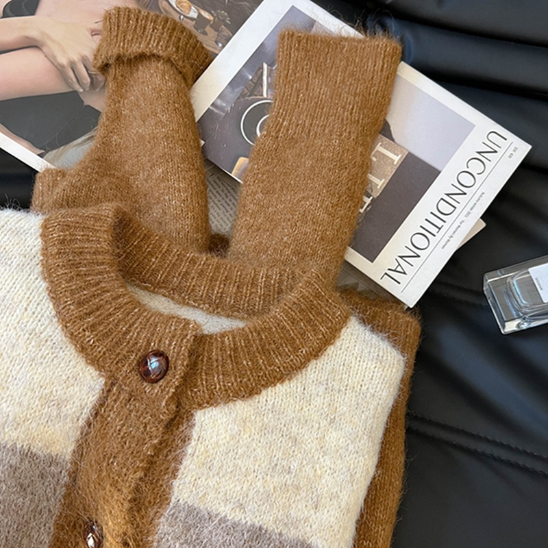 撞色条纹毛衣外套女秋冬季复古慵懒风设计感百搭针织