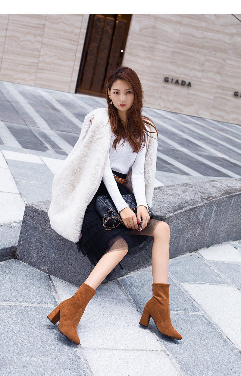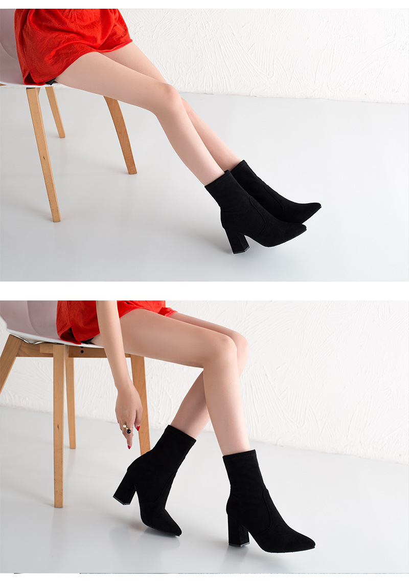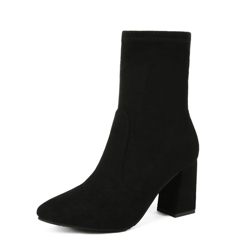 2025 새로운 가을, 겨울 인터넷 연예인 패션 부츠 여성 두꺼운 굽 패션 뾰족한 발가락 하이힐 겉옷 슬리브 스웨이드 여성 부츠 유행스토어 가기