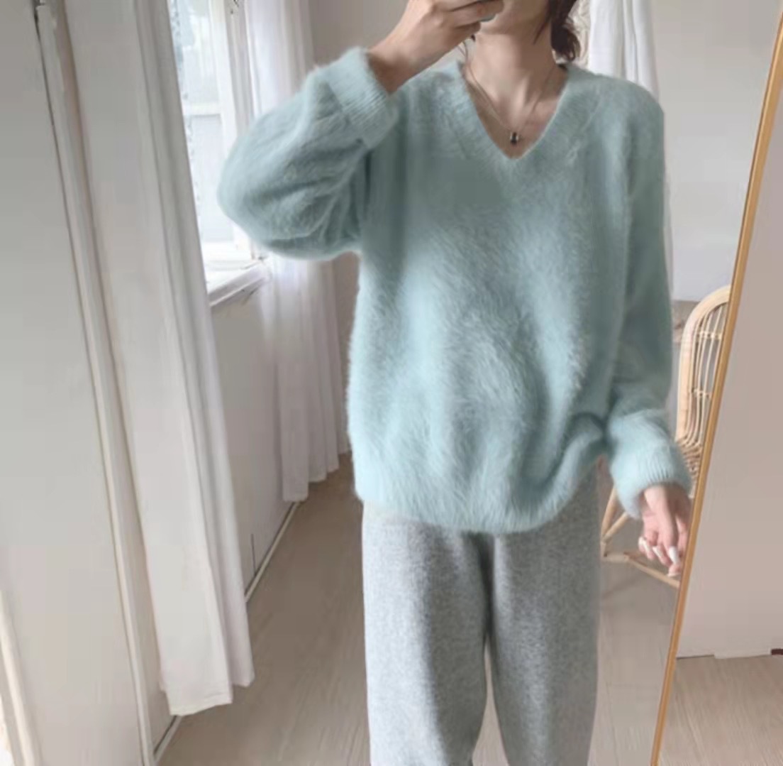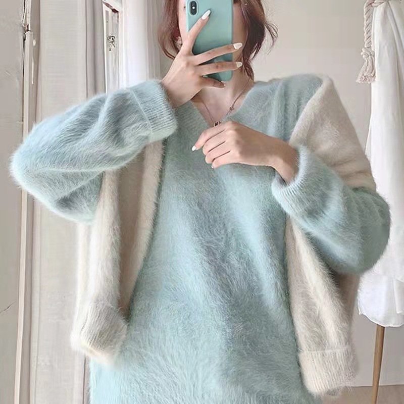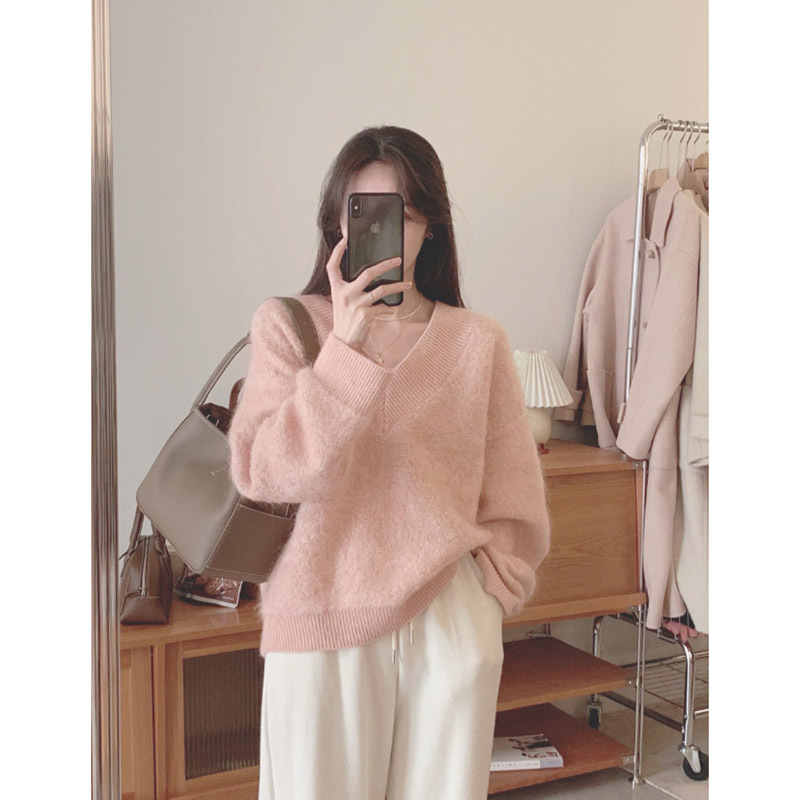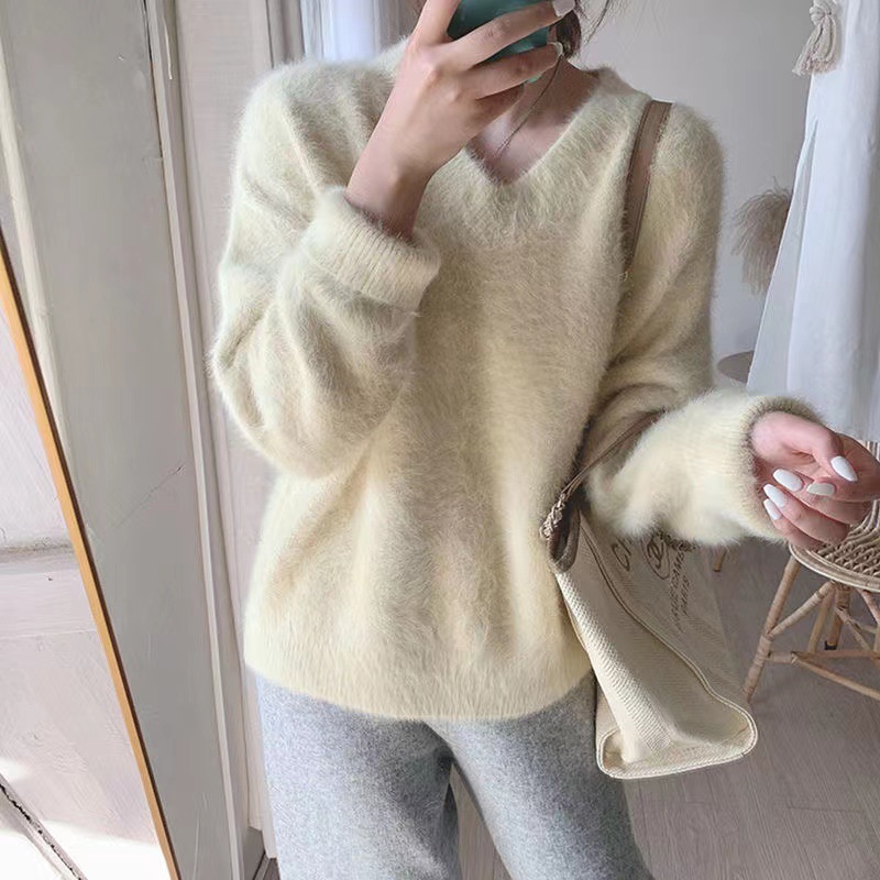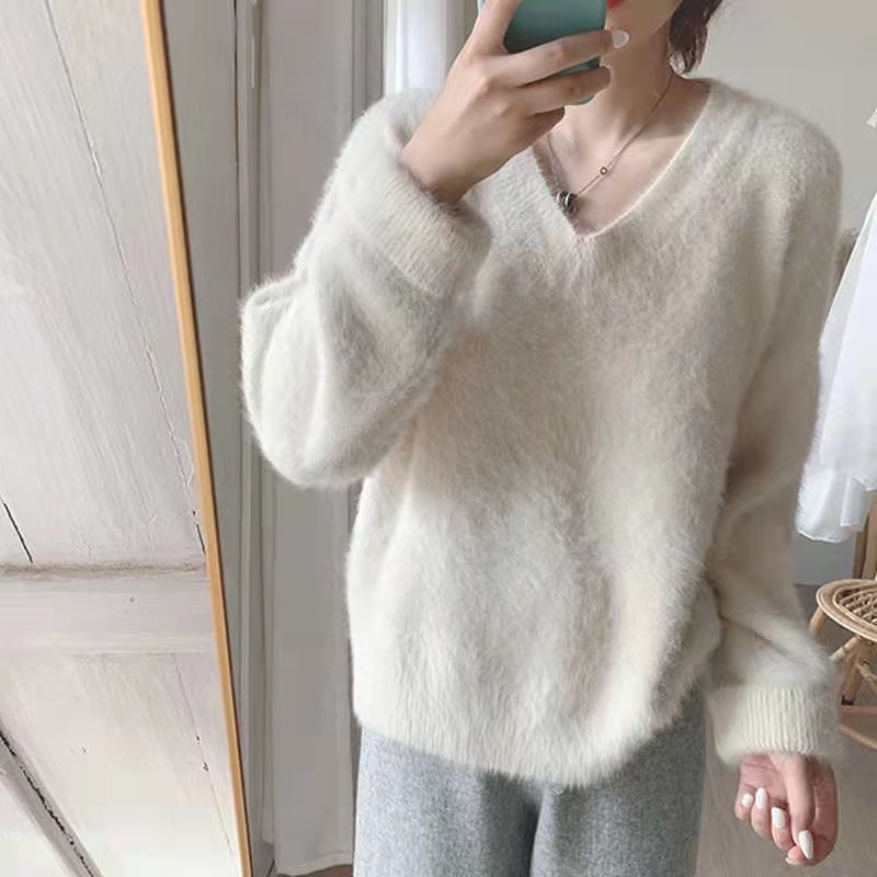 2024 가을 겨울 신상 모조 밍크 브이넥 스웨터 풀오버 부드러운 일본 스타일 여성 겨울 두꺼운 루즈핏 스웨터스토어 가기