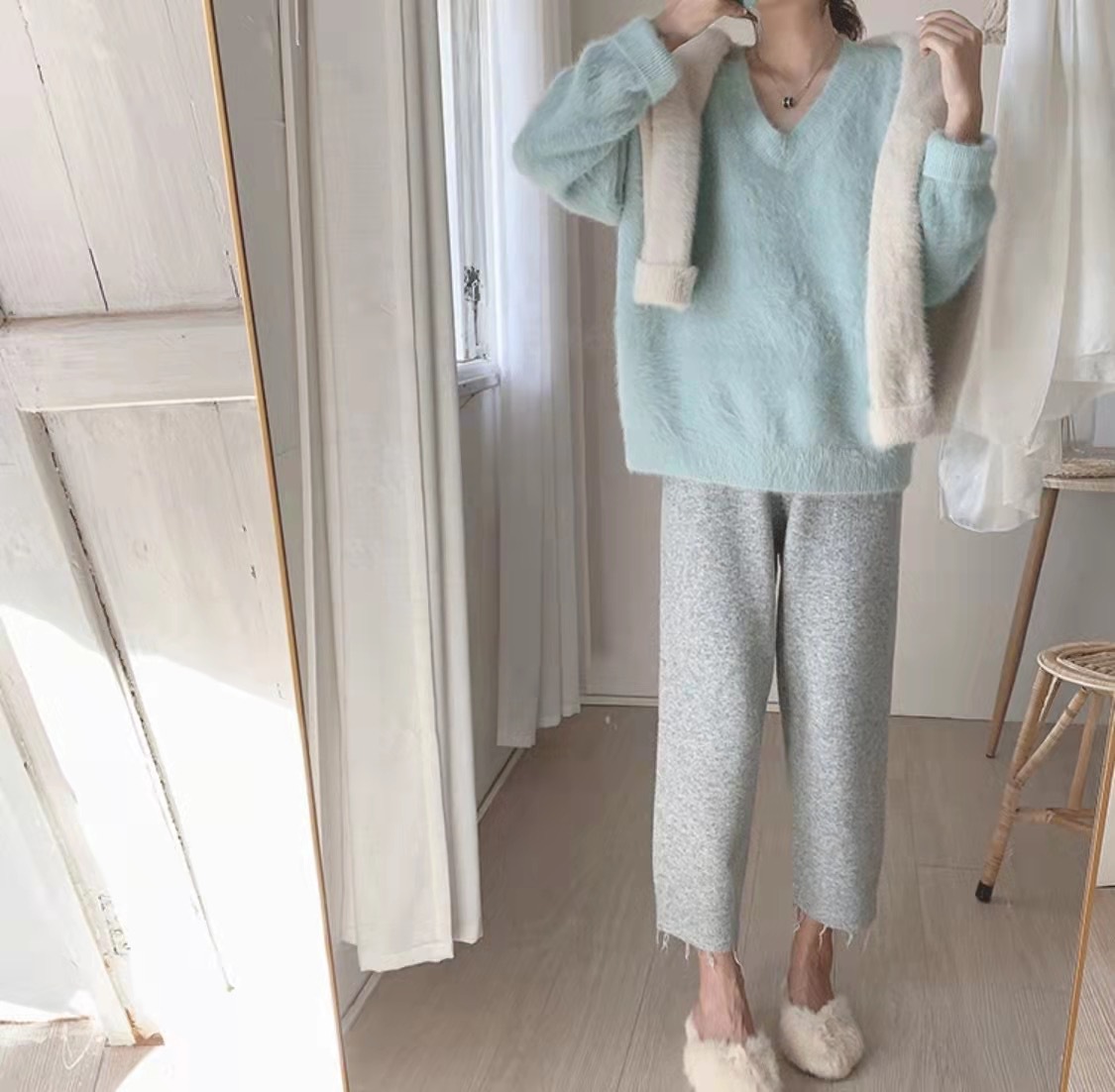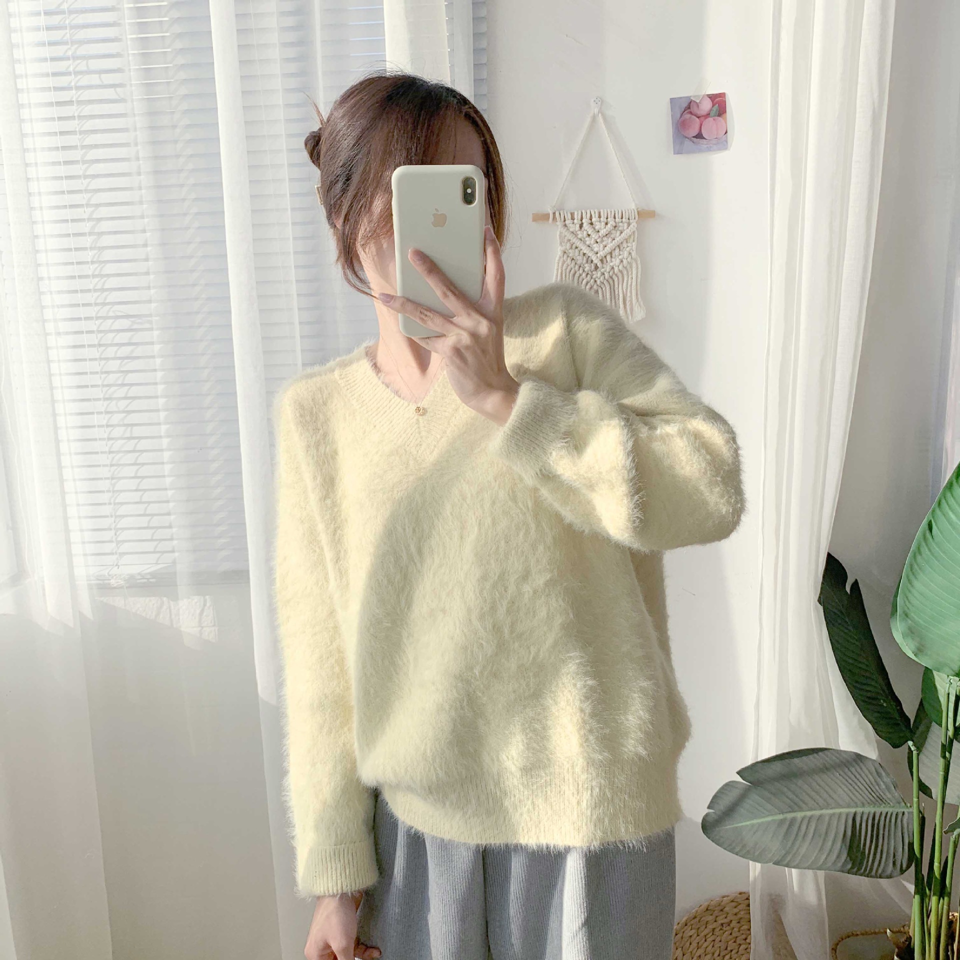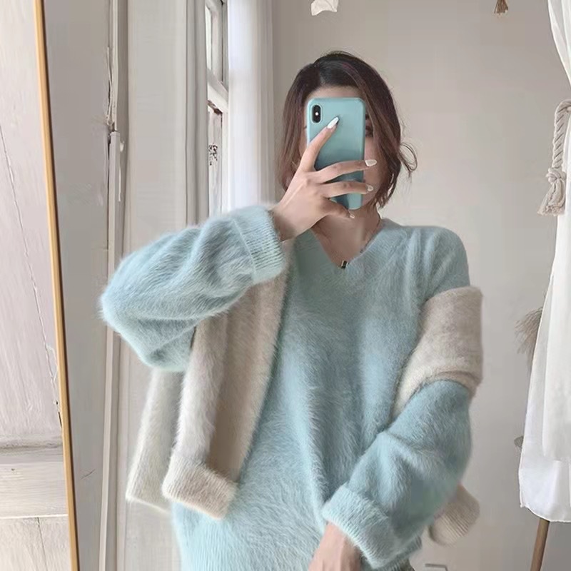 2024 가을 겨울 신상 모조 밍크 브이넥 스웨터 풀오버 부드러운 일본 스타일 여성 겨울 두꺼운 루즈핏 스웨터스토어 가기