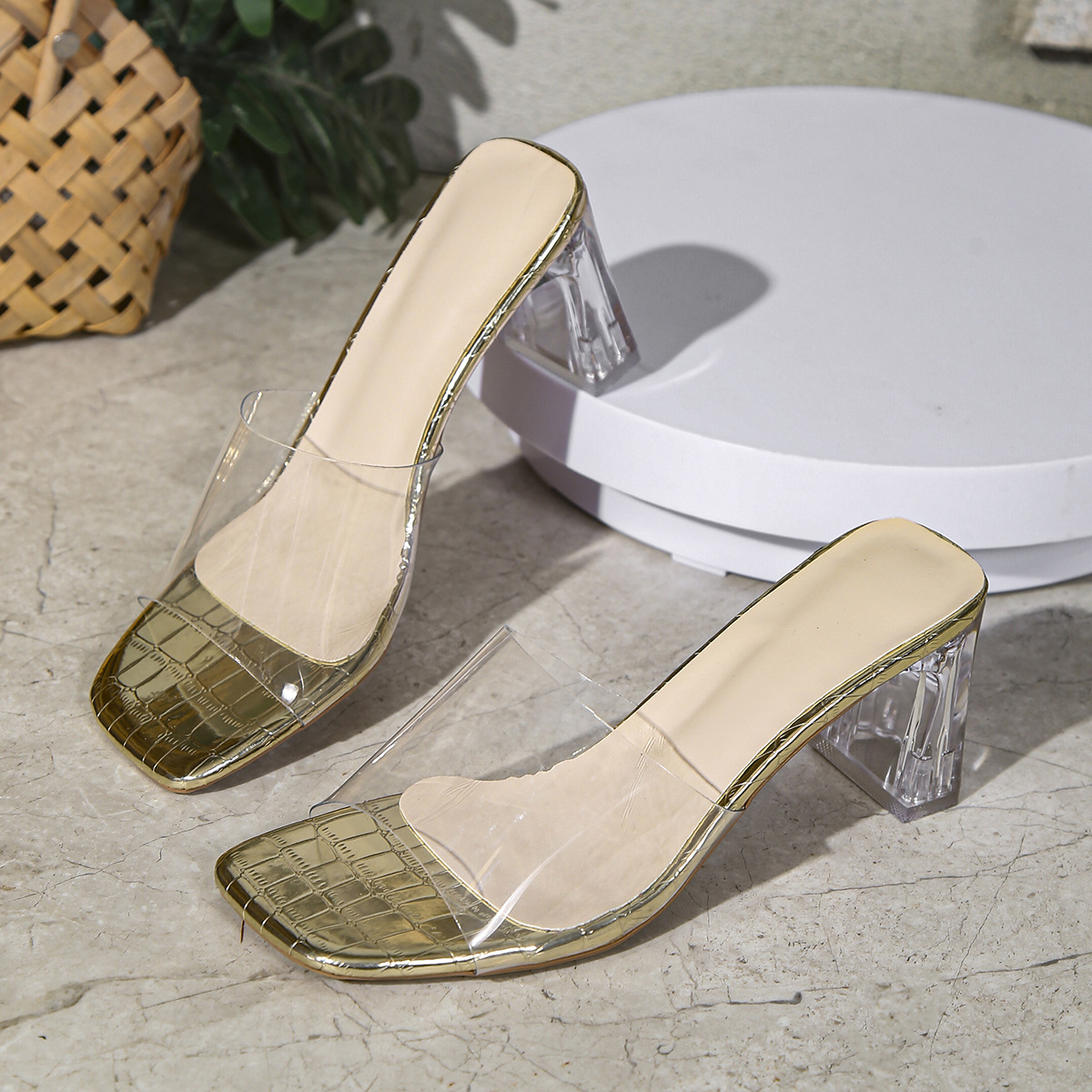 국경 간 플러스 사이즈 35-42 여성 투명 샌들 여름 새로운 크리스탈 미드 힐 두꺼운 힐 하프 걸레 샌들 도매