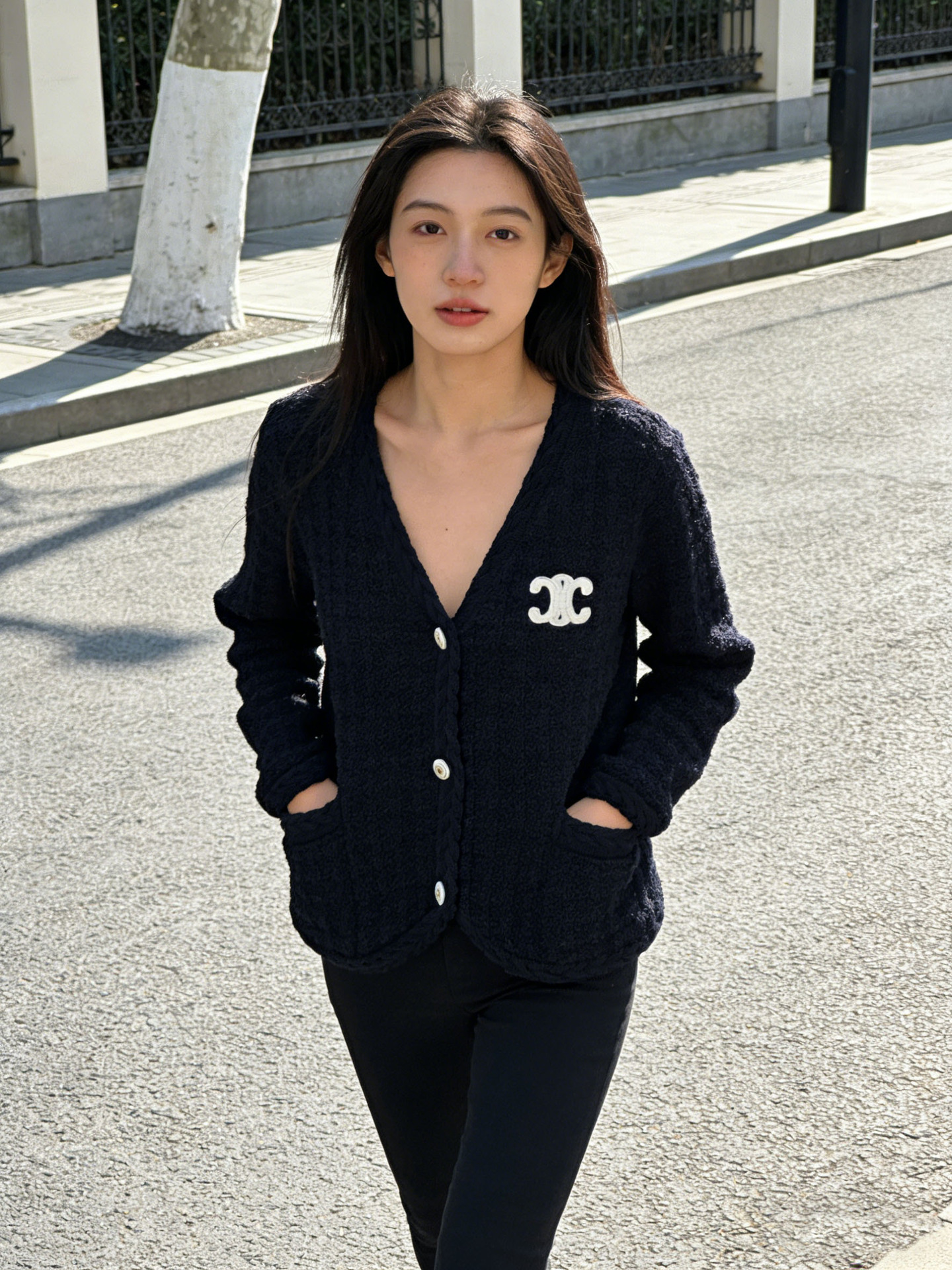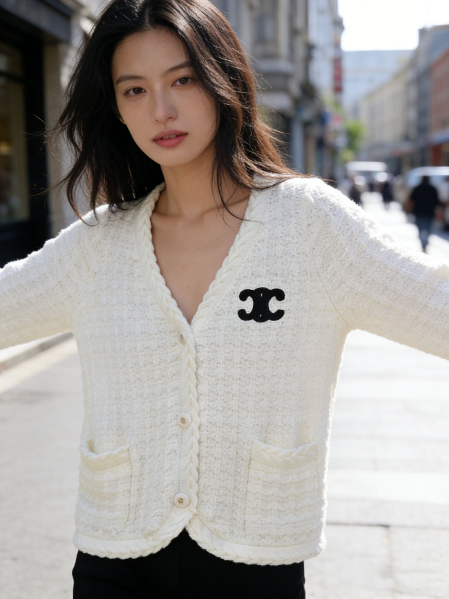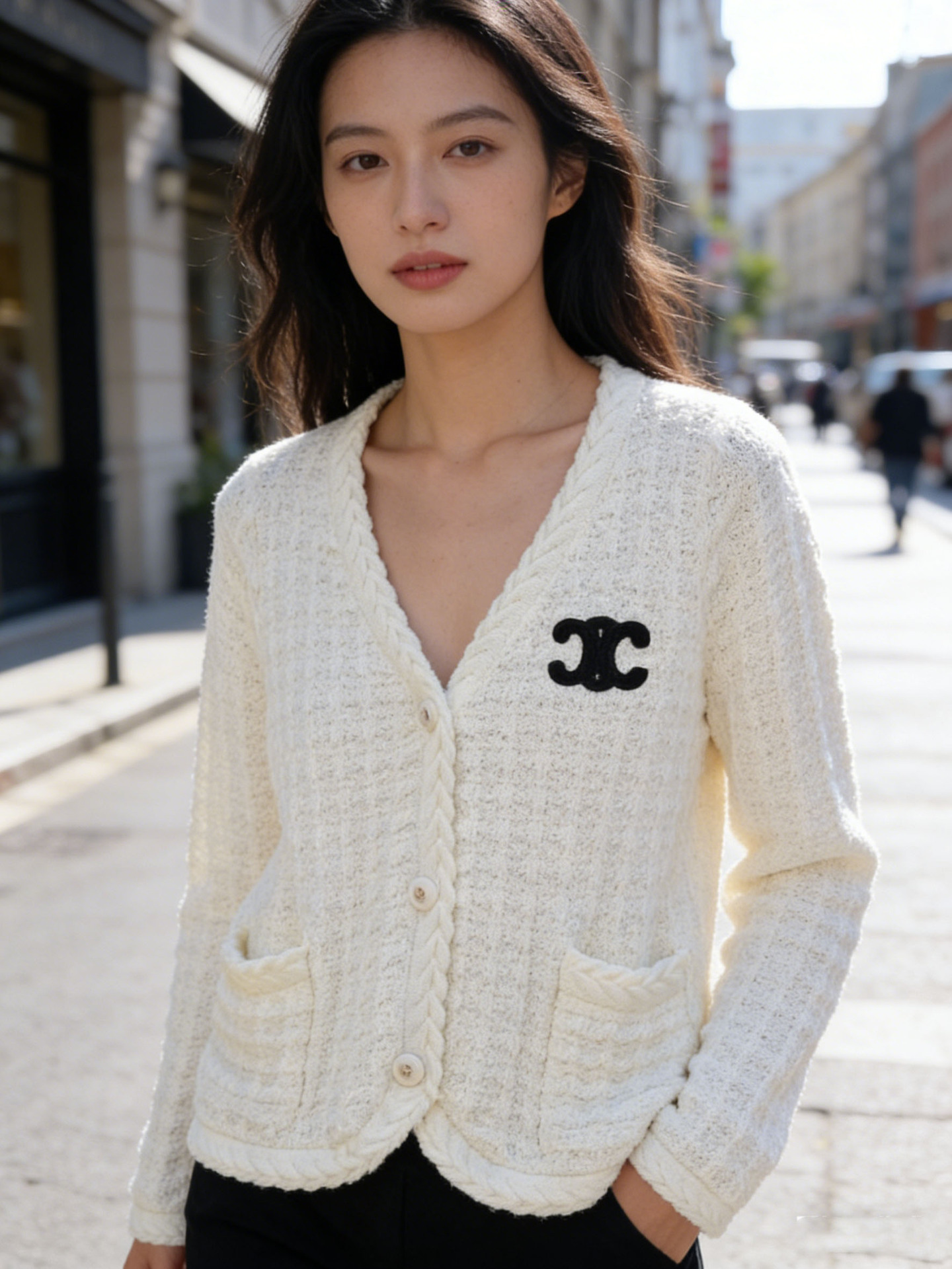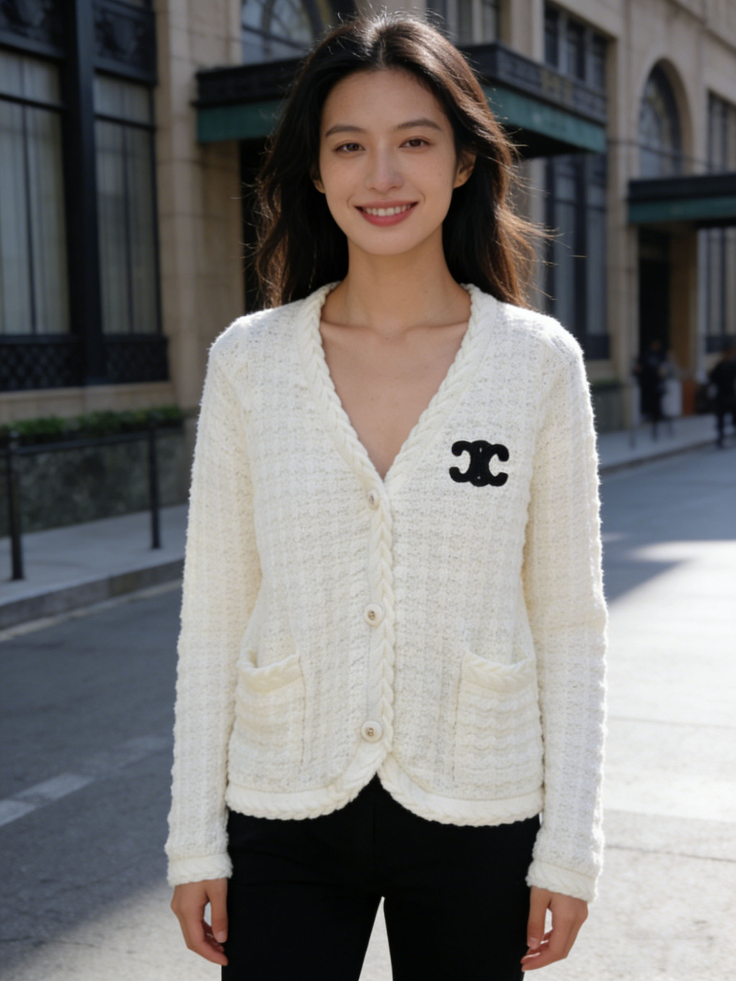 跨境春秋字母刺绣口袋V领针织开衫上衣新款慵懒风宽松毛衣外套女
