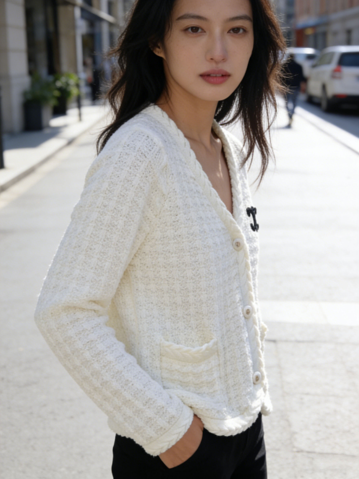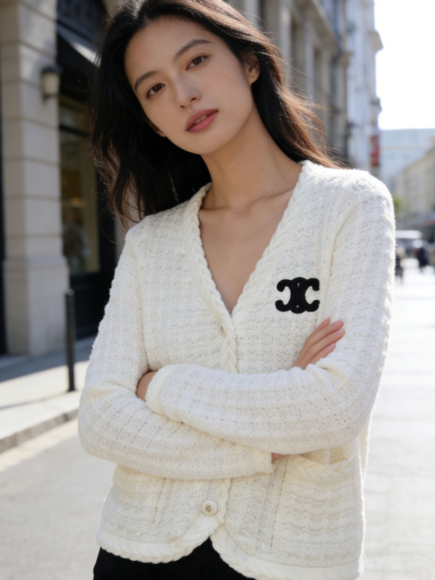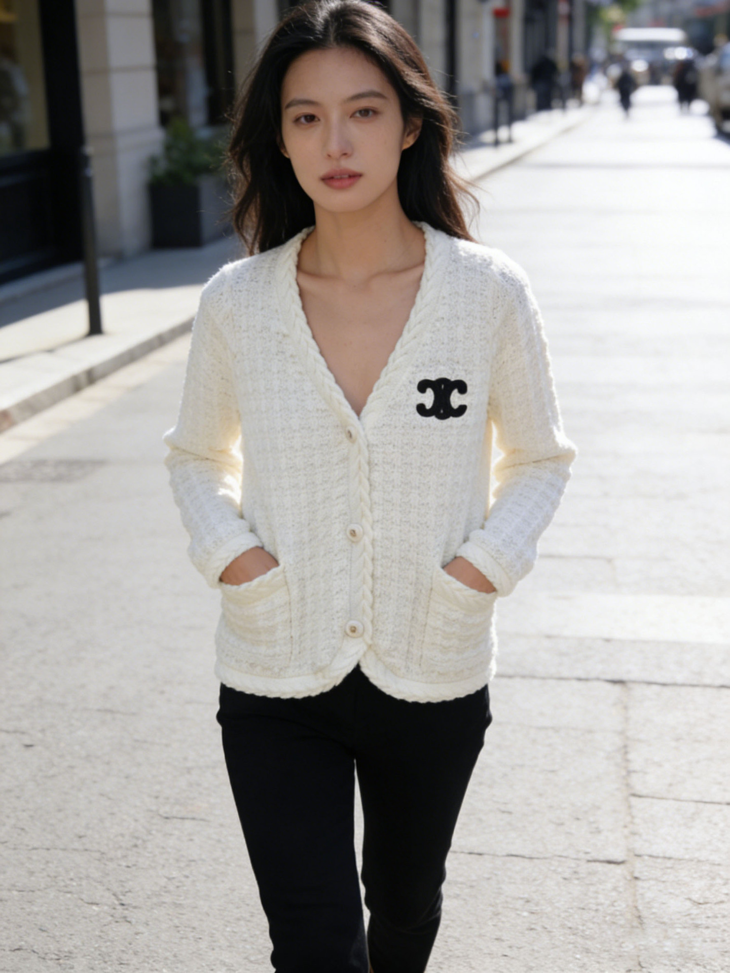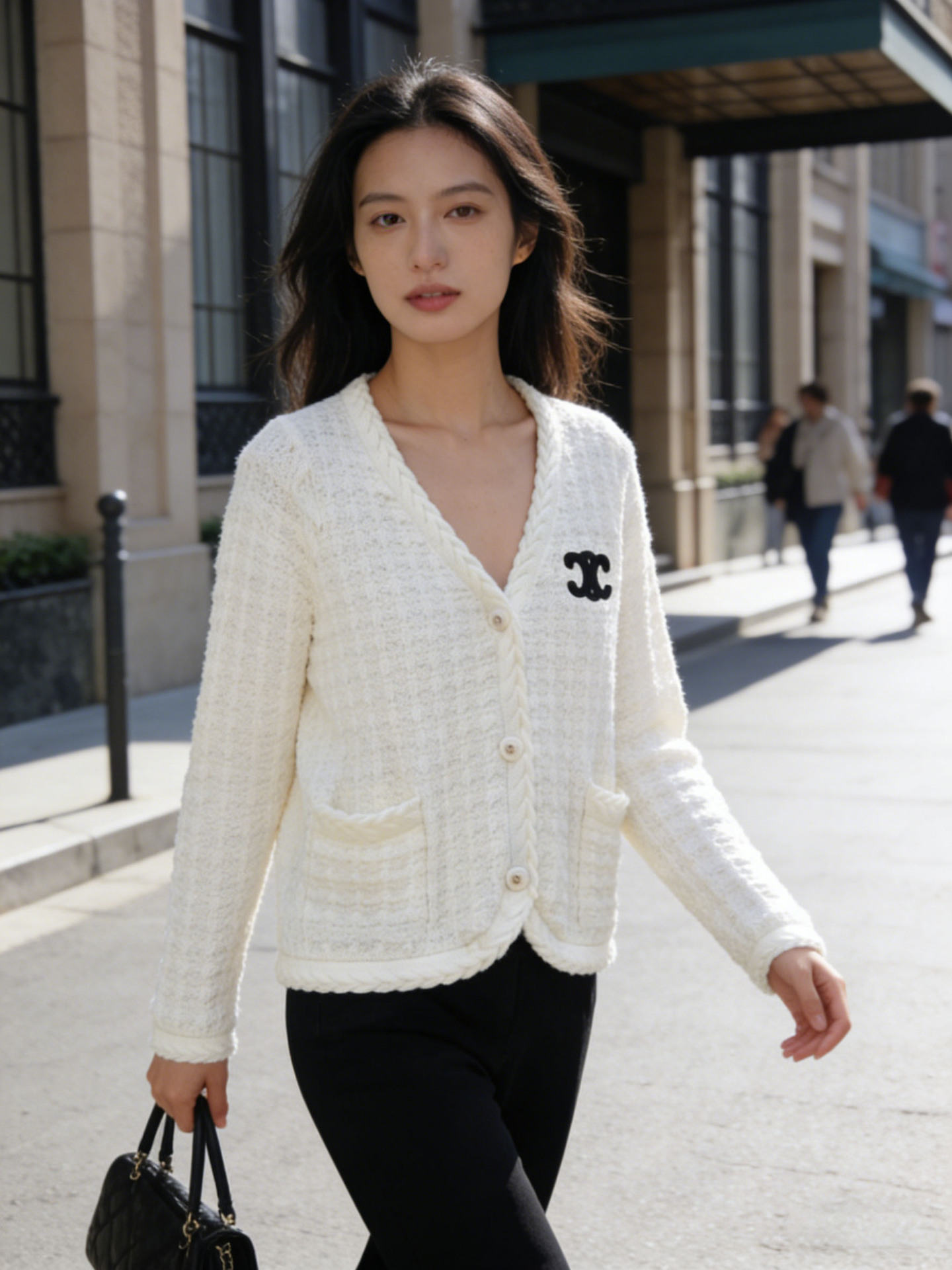 跨境春秋字母刺绣口袋V领针织开衫上衣新款慵懒风宽松毛衣外套女