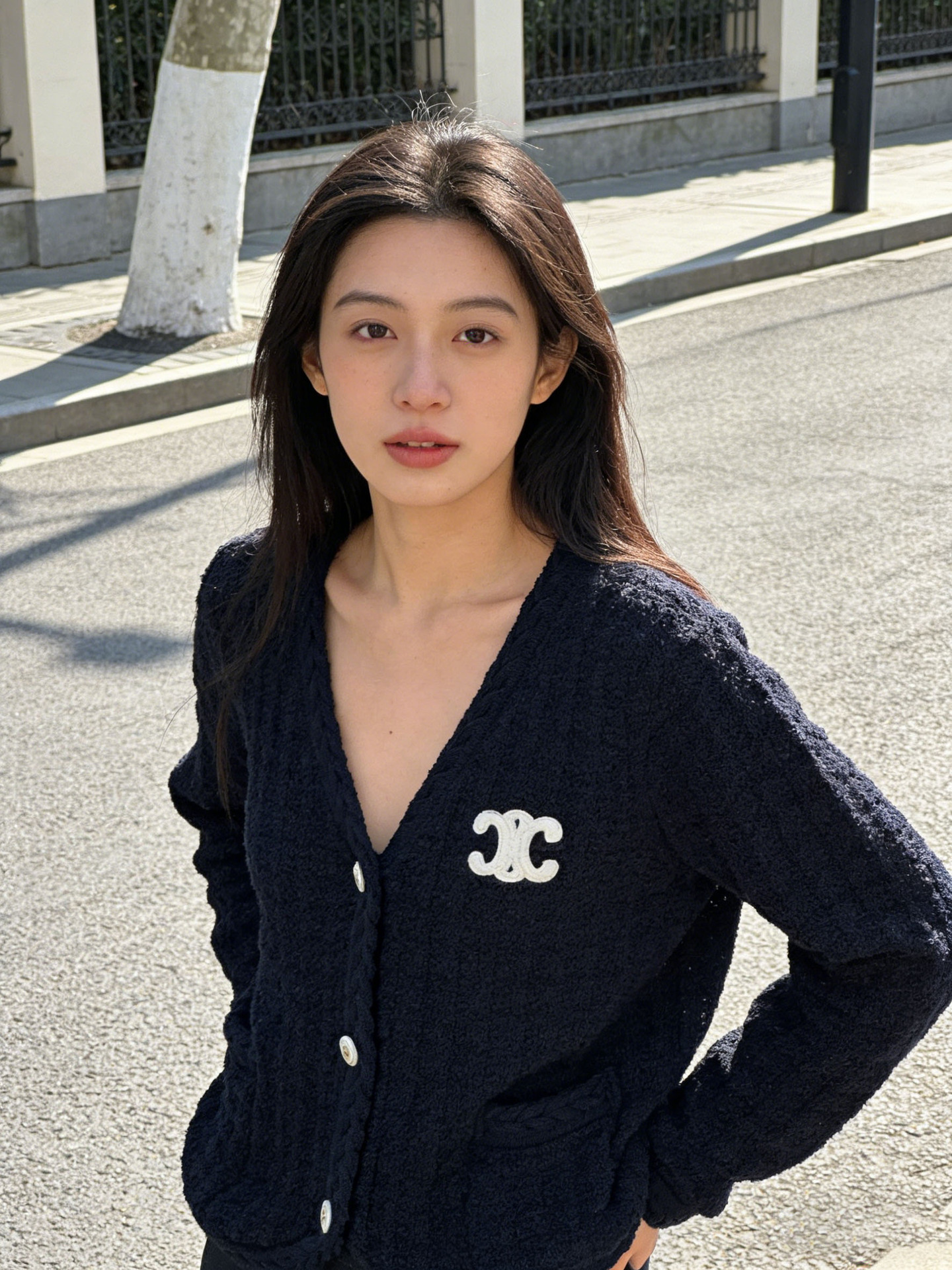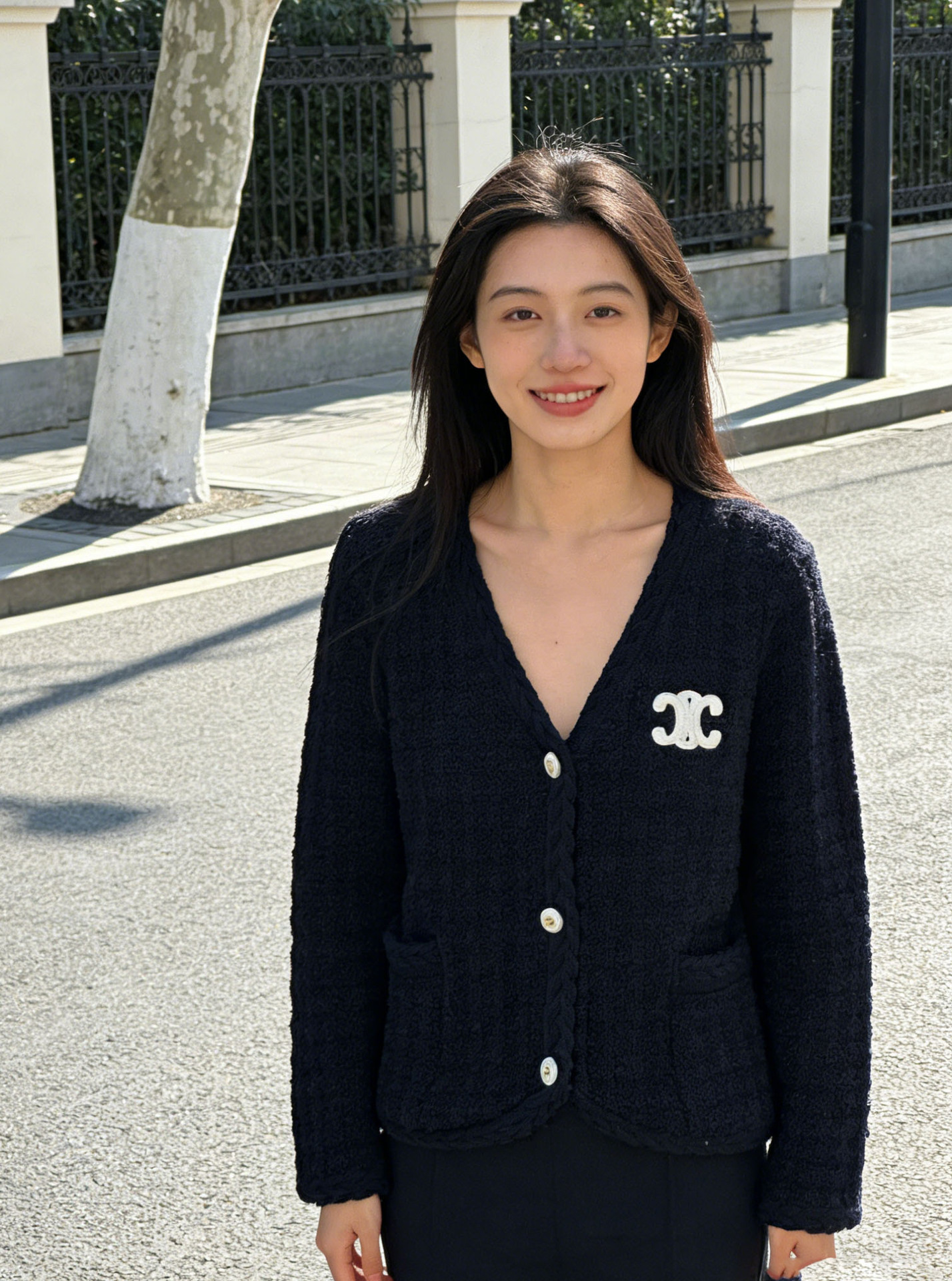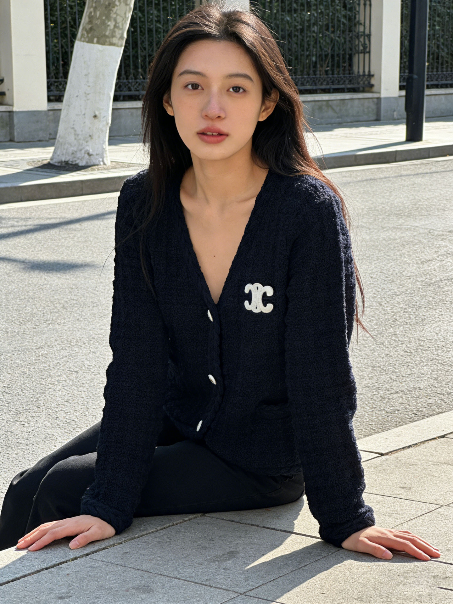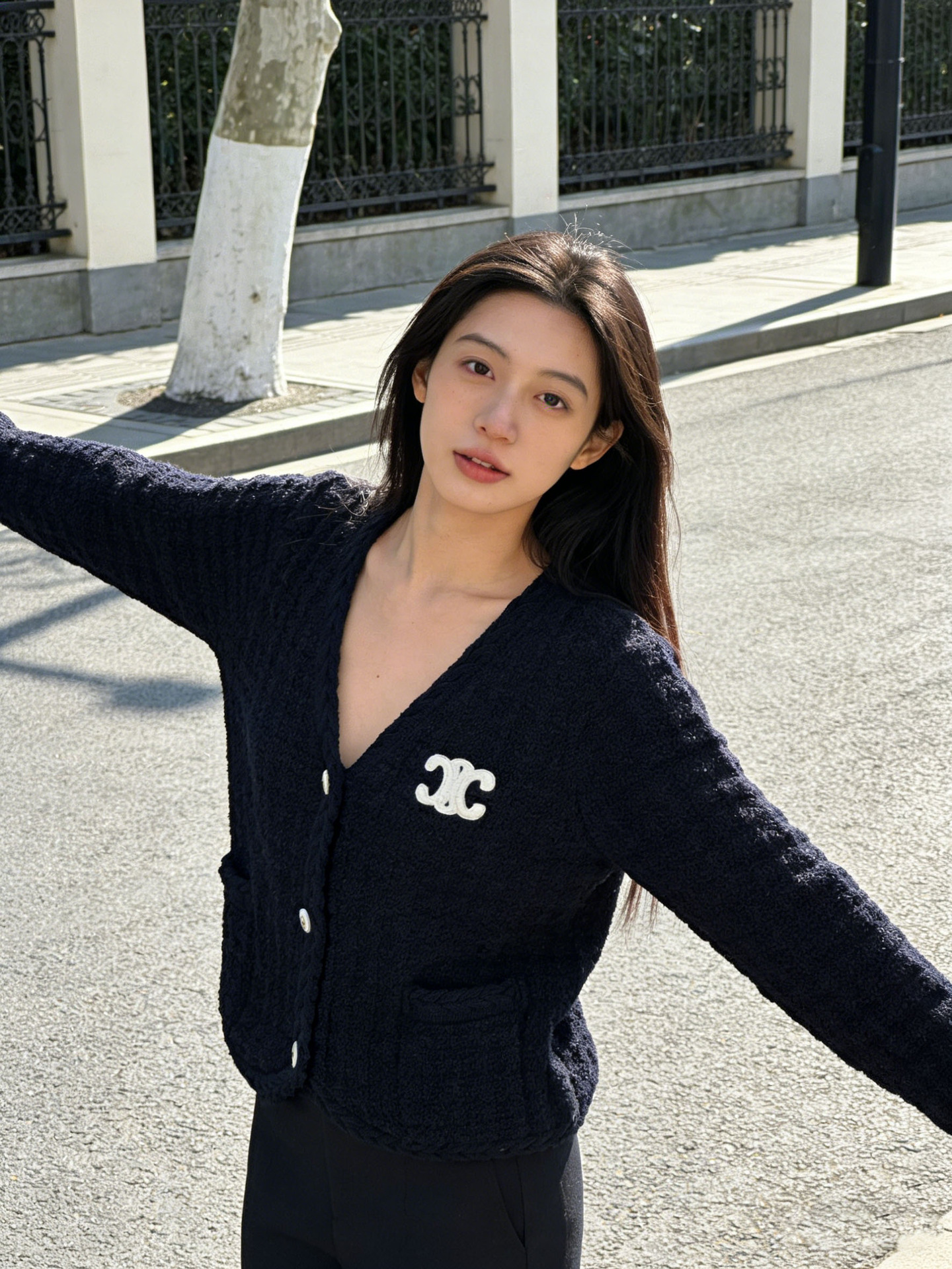 跨境春秋字母刺绣口袋V领针织开衫上衣新款慵懒风宽松毛衣外套女
