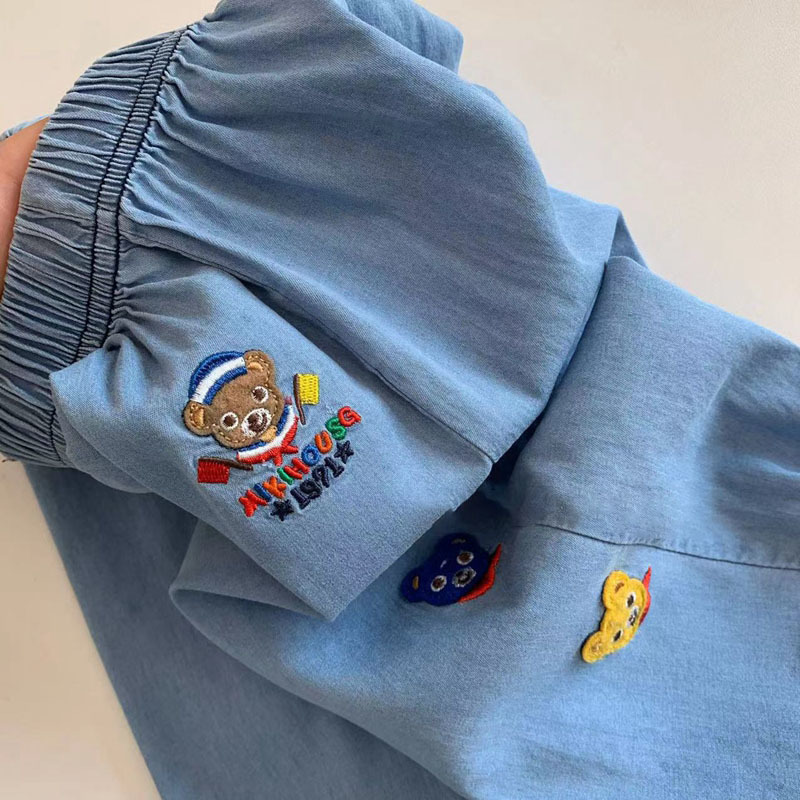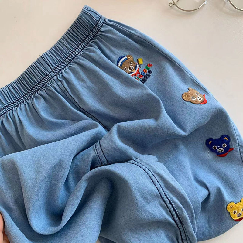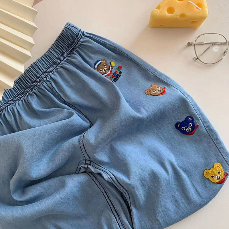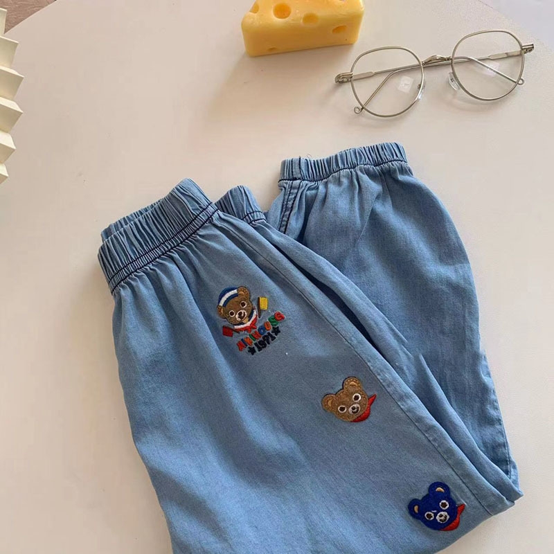 봄과 여름 새로운 어린이 사이드 베어 수 놓은 캐주얼 바지 아기 느슨한 모기 방지 바지 남녀 실크 코튼 바지스토어 가기