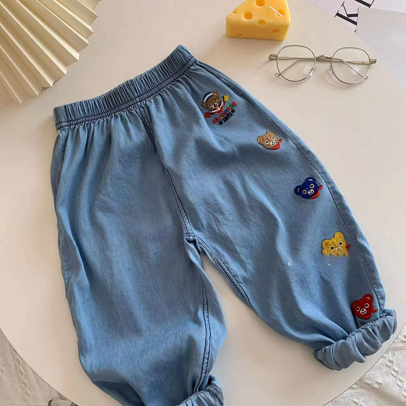 봄과 여름 새로운 어린이 사이드 베어 수 놓은 캐주얼 바지 아기 느슨한 모기 방지 바지 남녀 실크 코튼 바지