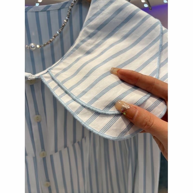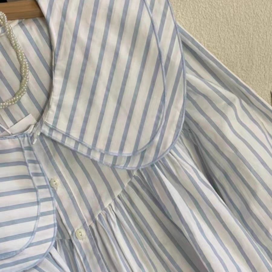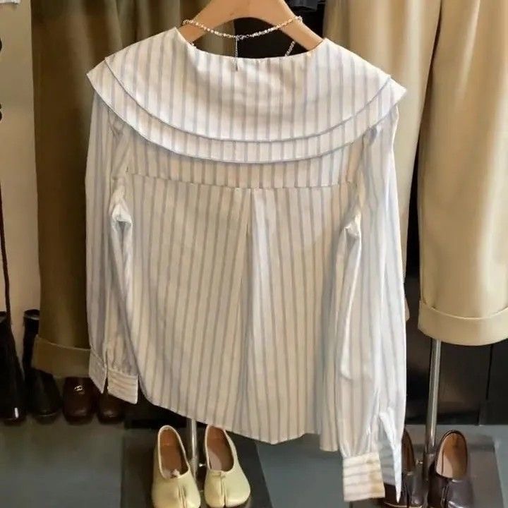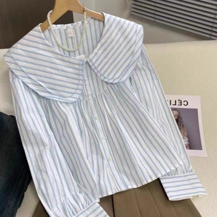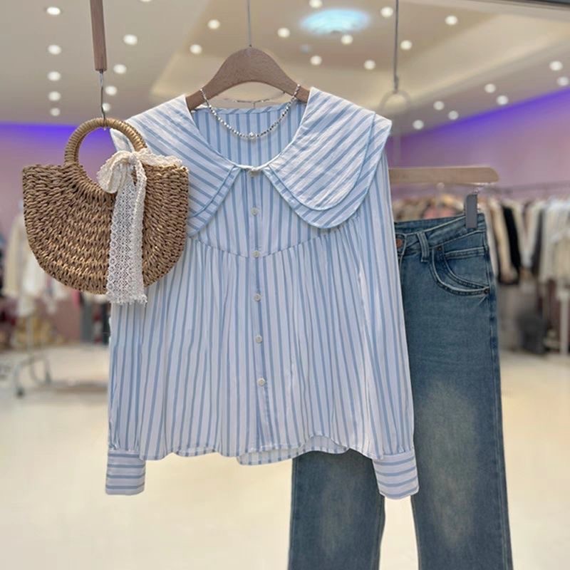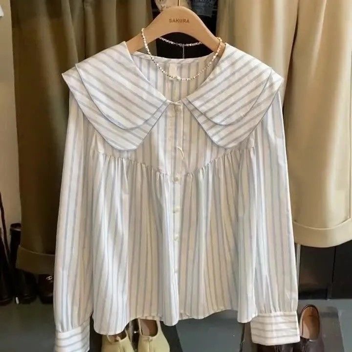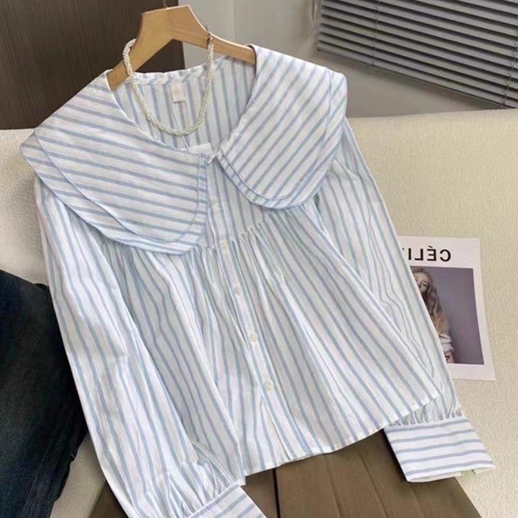 프랑스 줄무늬 인형 칼라 셔츠 여성의 봄과 가을 디자인 센스 틈새 패션 연령 감소 독특한 세련된 긴 소매 탑스토어 가기