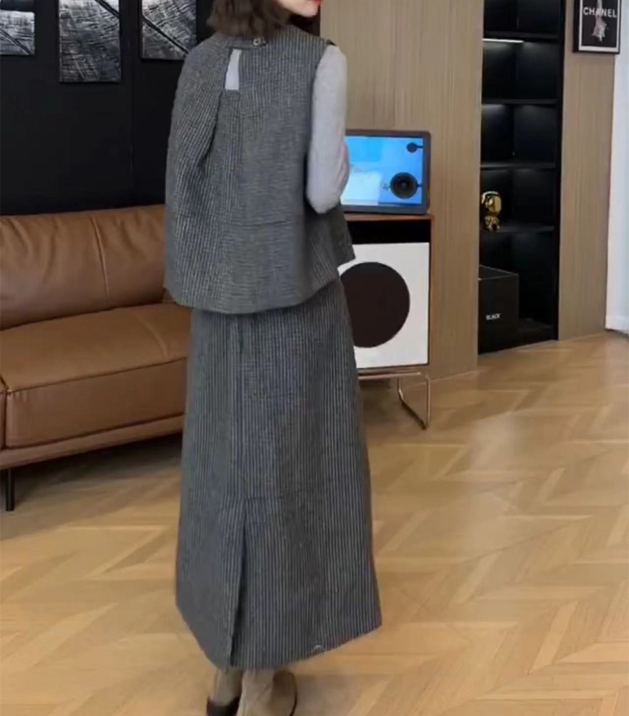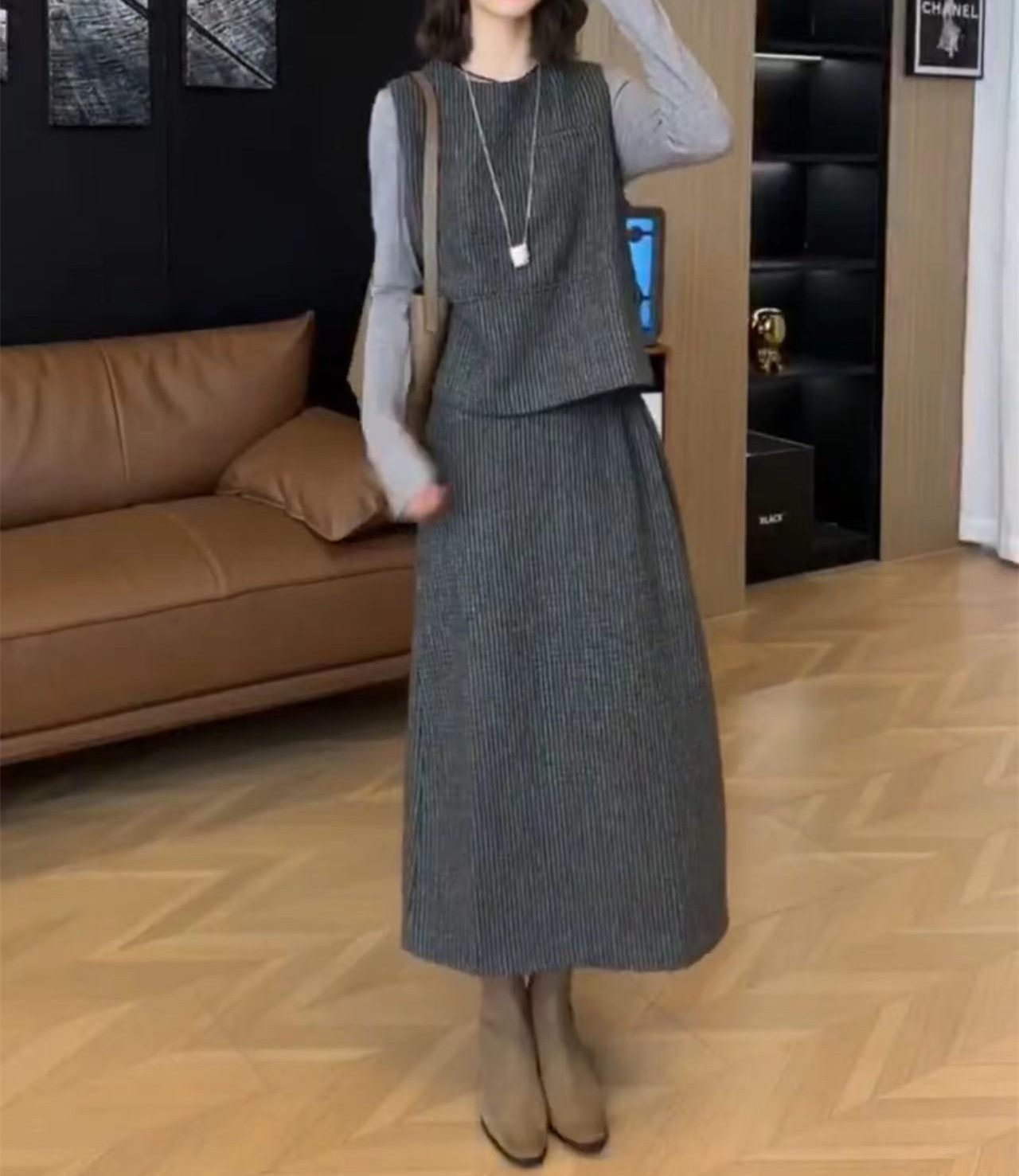 24802 다아이메이위안 2025 가을 신상 심플 긴팔 이너웨어 조끼와 스커트 세트 여성복스토어 가기