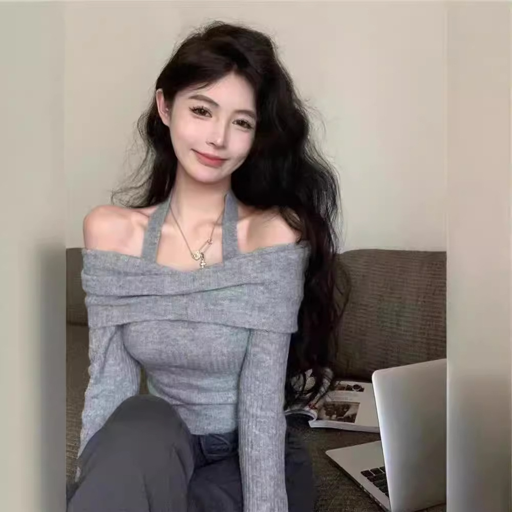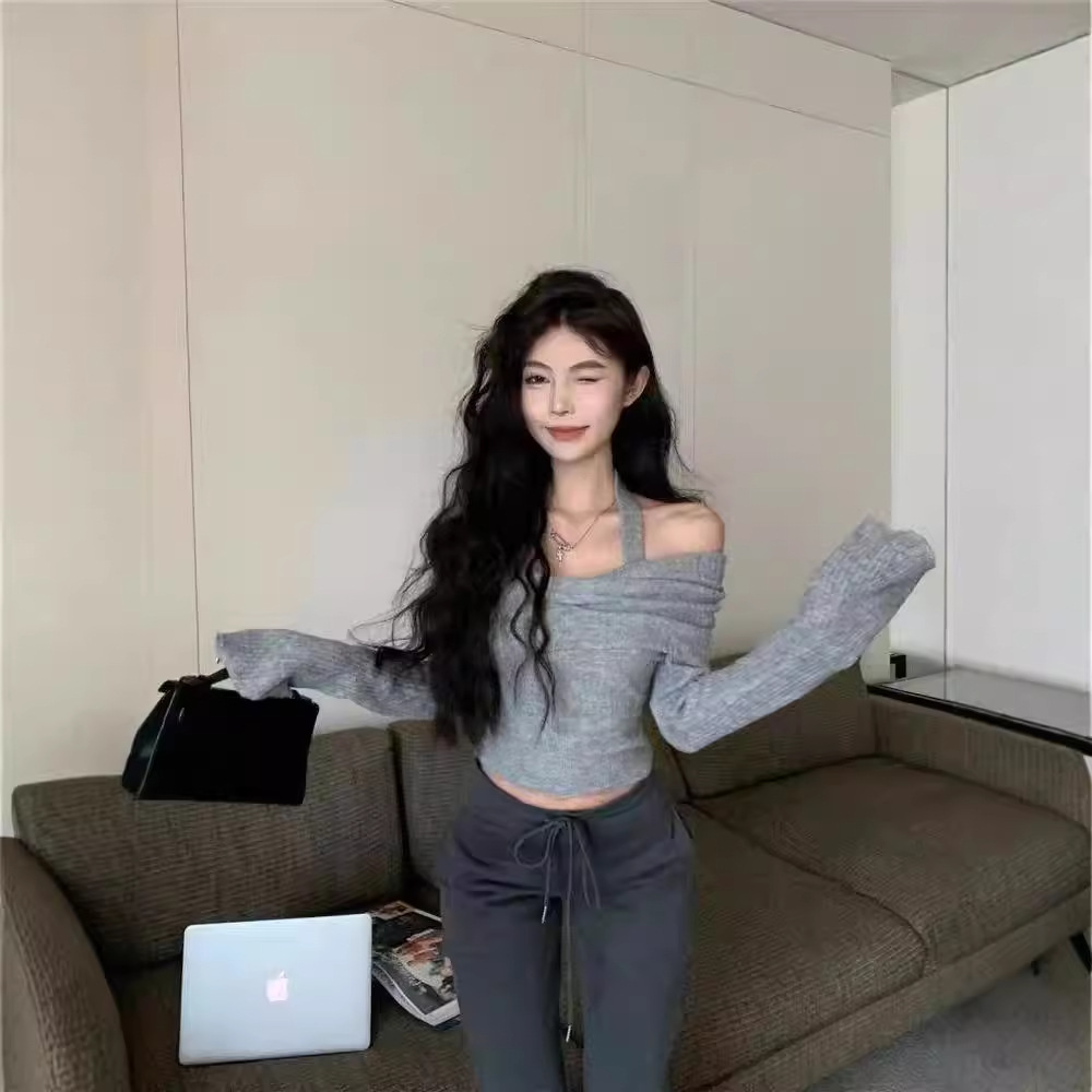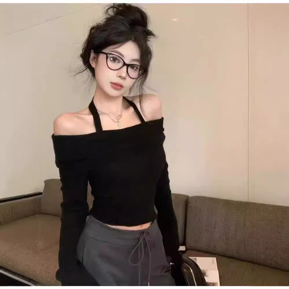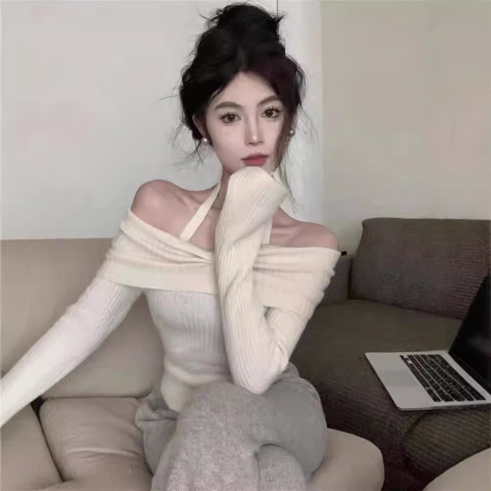 순수한 욕망 니트 셔츠 여성의 가을 한 캐릭터 칼라 어깨 긴소매베이스 셔츠 스파이스 걸스 어깨 짧은 달콤하고 뜨거운 탑