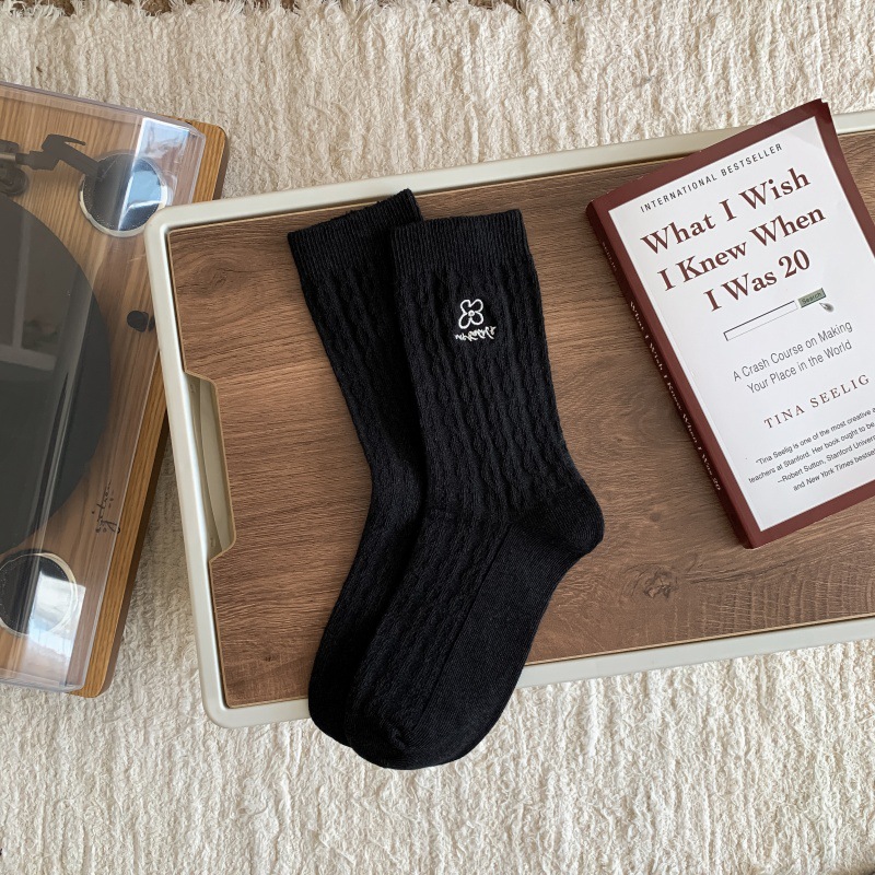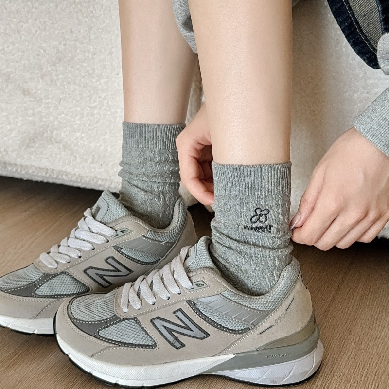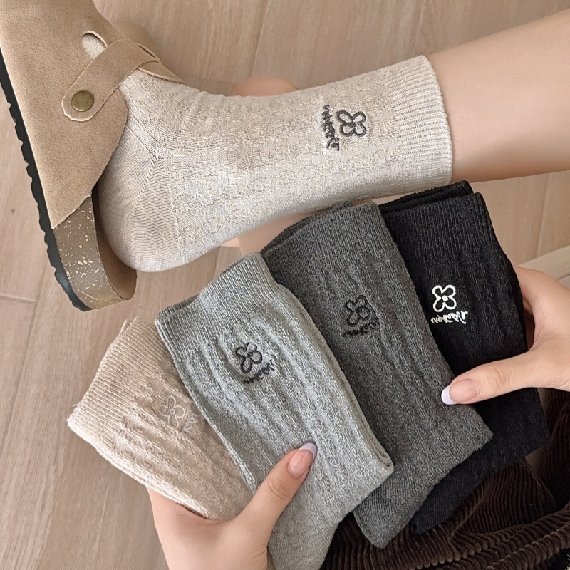 가을 겨울 회색 자수 꽃 이중 바늘 여성용 종아리 중간 양말 단색 양말 한국 대학 스타일 쌓인면 양말스토어 가기