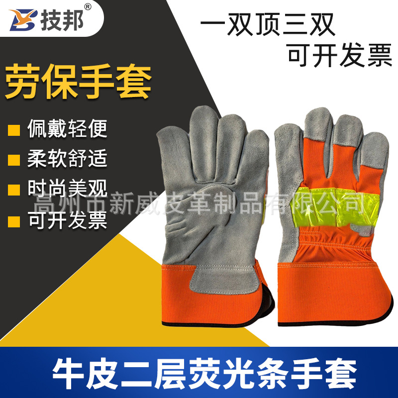 공장 직접 가죽 2 층 형광 스트립 장갑 용접 내마모성 단열 장갑 야외 작업 장갑