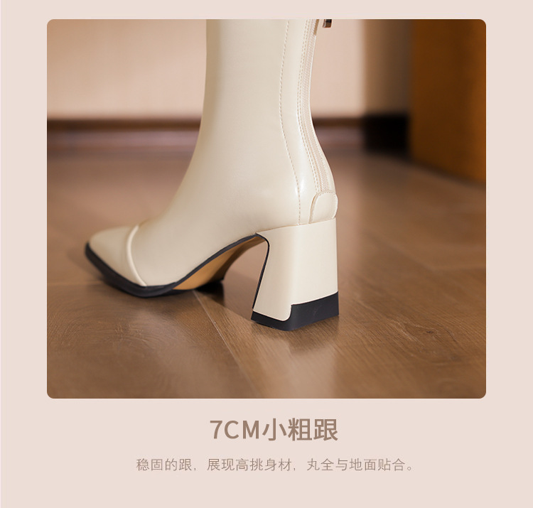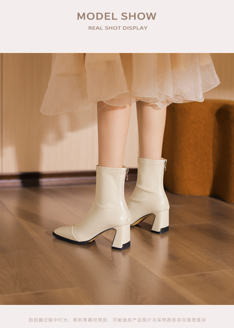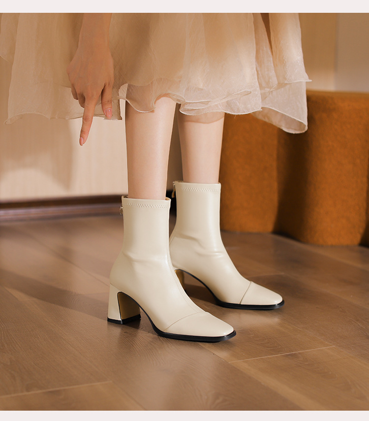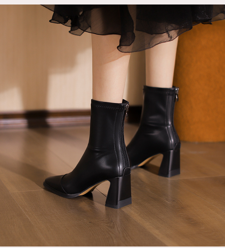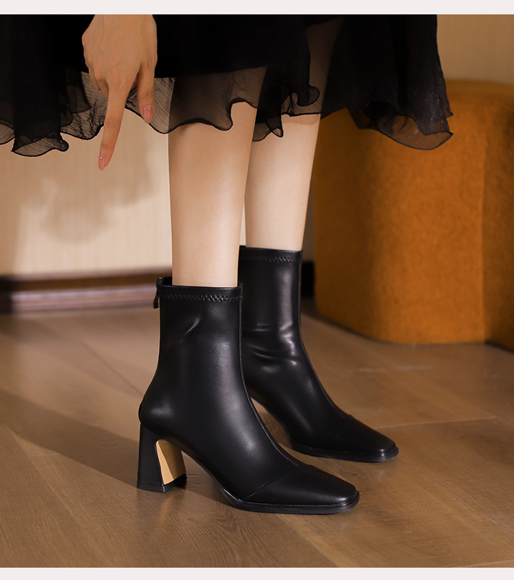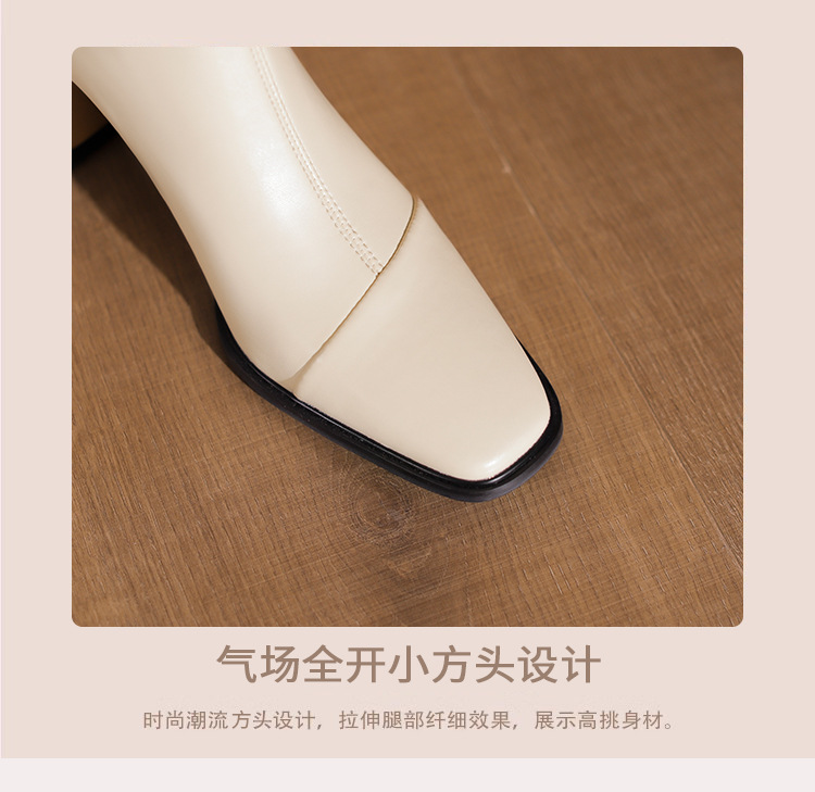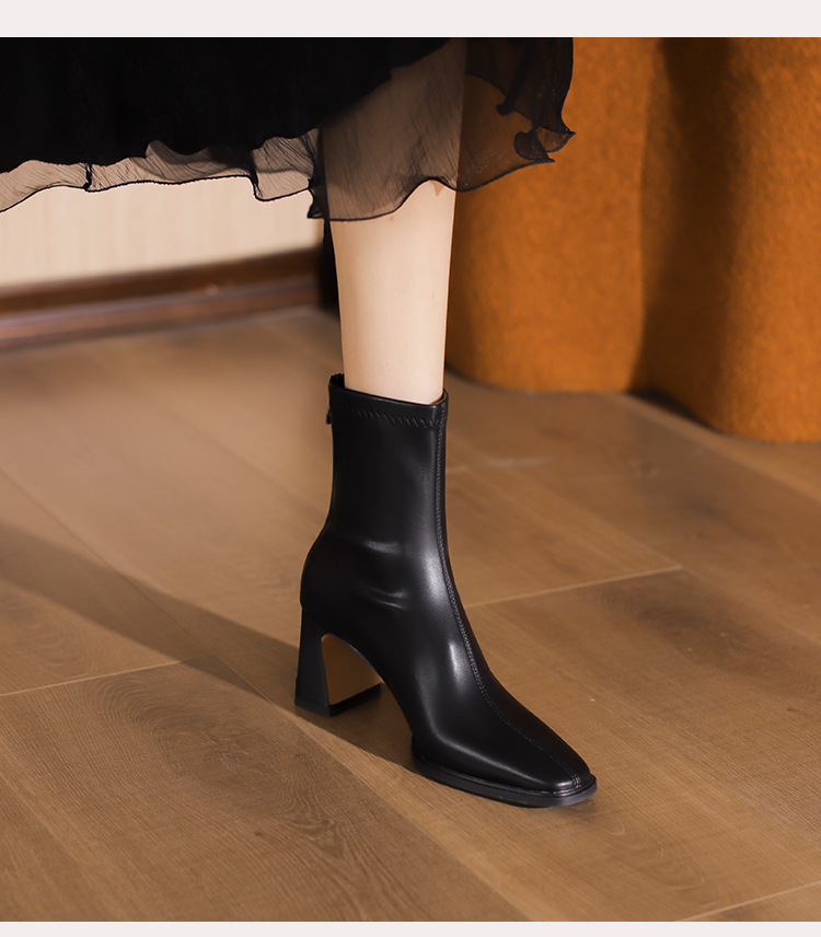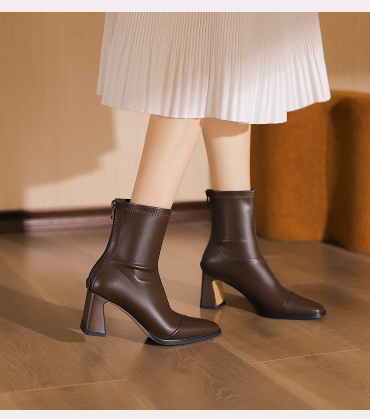 2024 가을과 겨울 새로운 스퀘어 헤드 마틴 부츠 여성 하이힐 짧은 부츠 두꺼운 힐 스트레치 부츠 다크 브라운 여성 부츠 도매