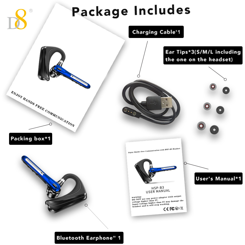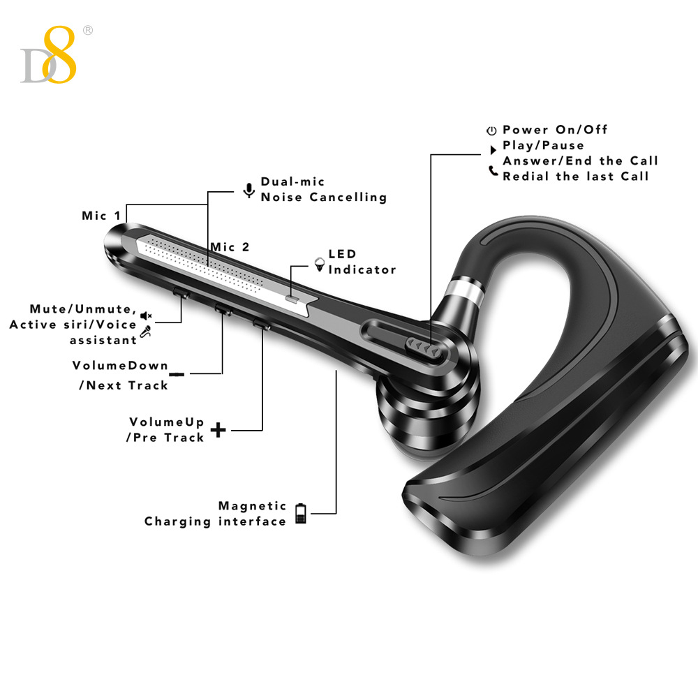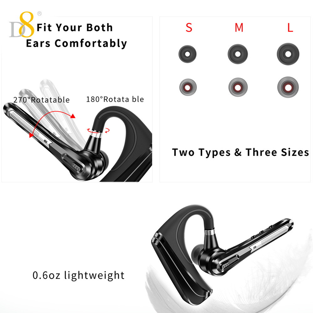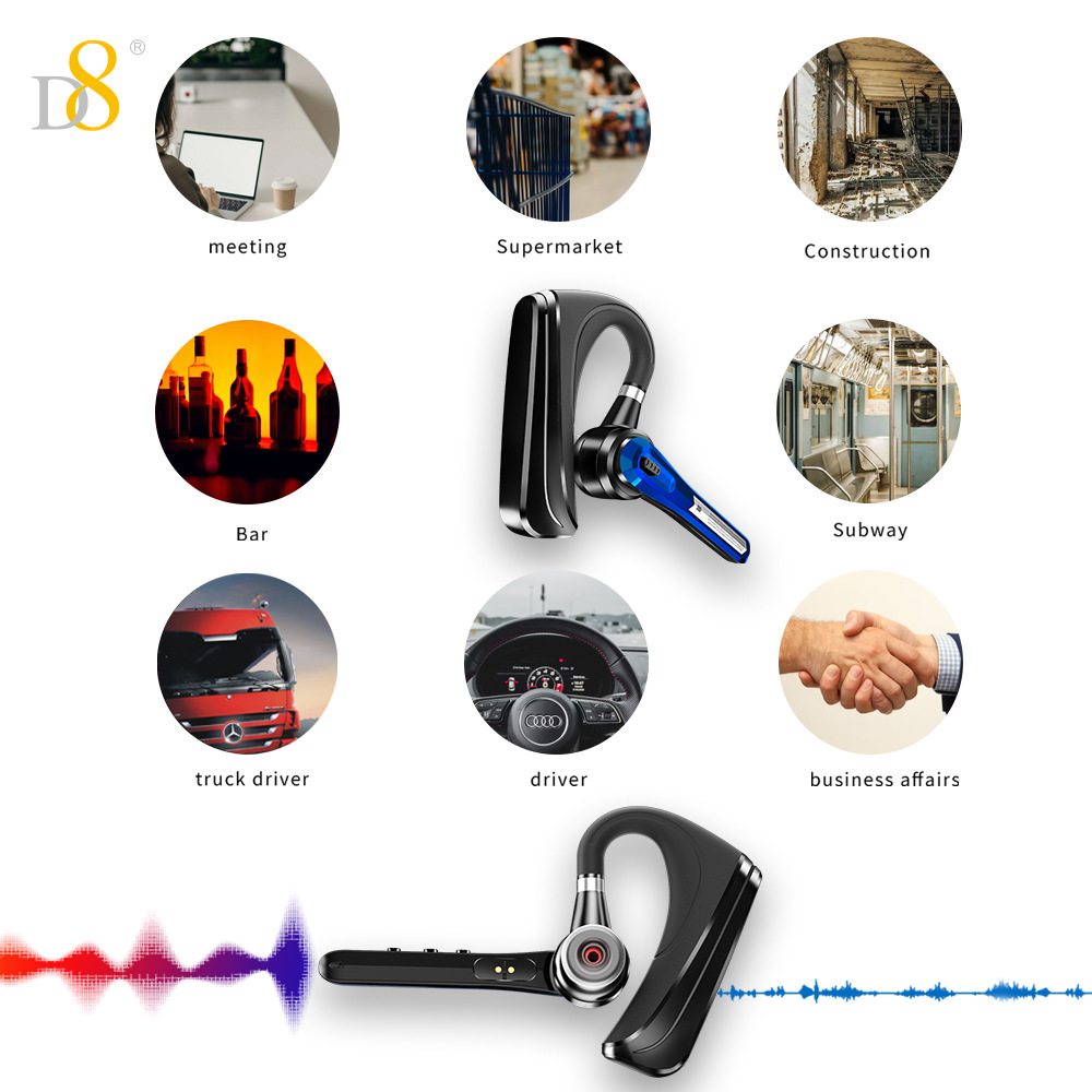D8 단일 귀 블루투스 비즈니스 헤드셋 무선 이어폰 대용량 24시간 매우 긴 배터리 수명 대외 무역 선물스토어 가기