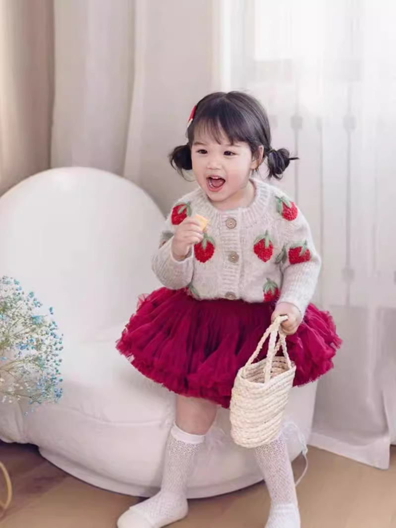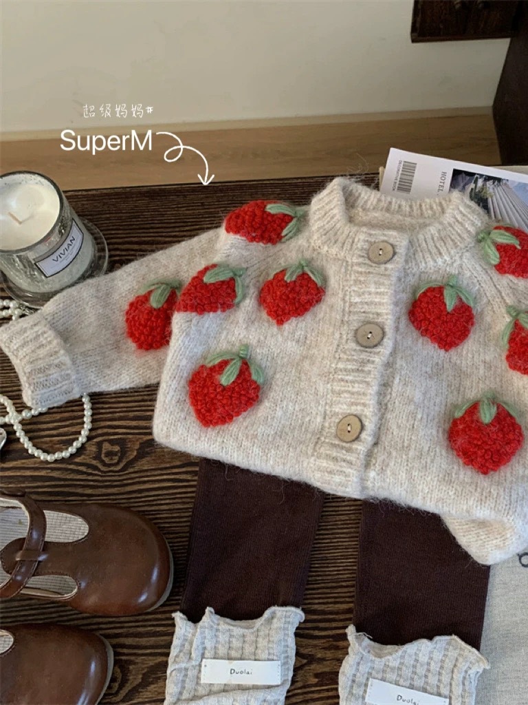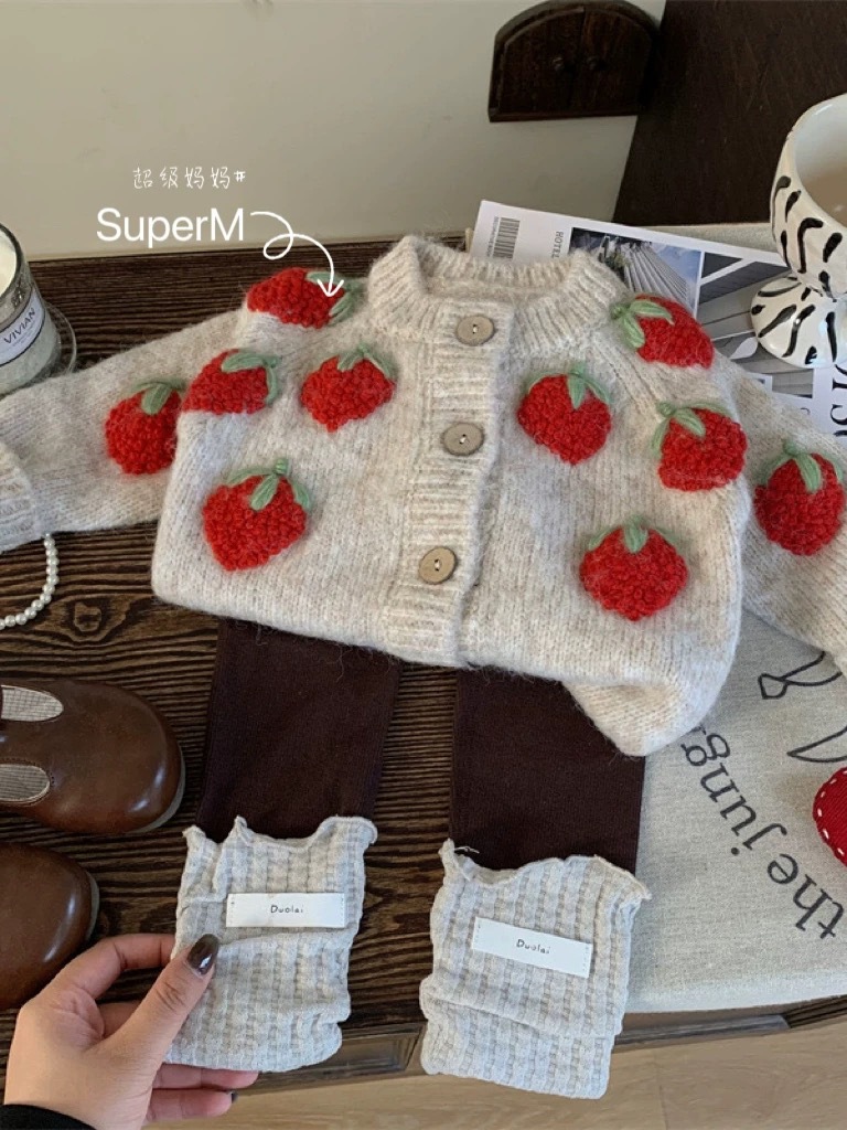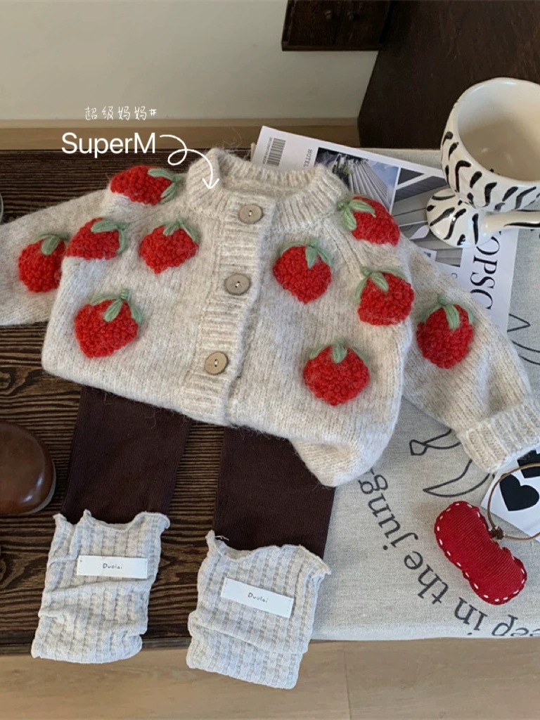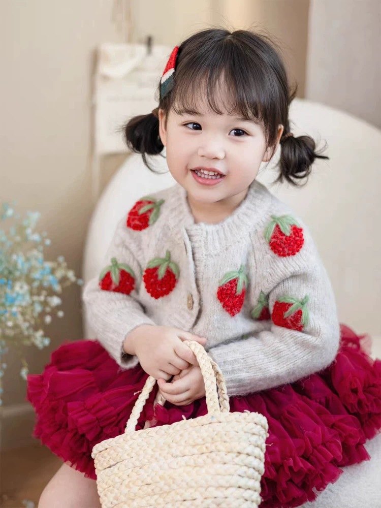 여자 니트 카디건 2025 새로운 가을 옷 아기 소녀 딸기 수 놓은 스웨터 어린이 유행 양모 재킷 유행스토어 가기