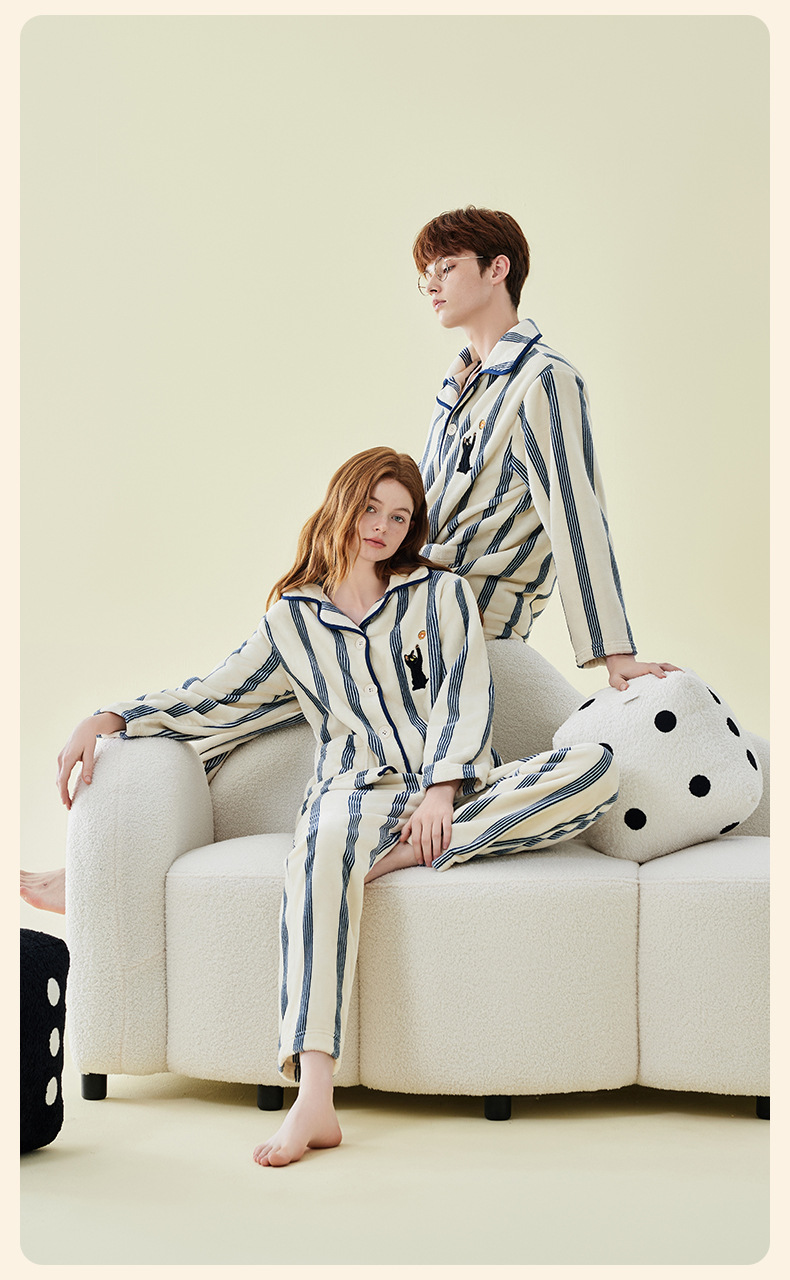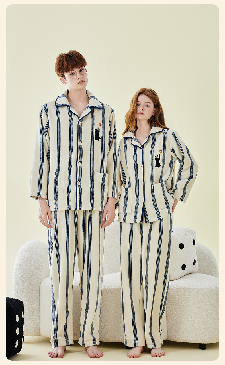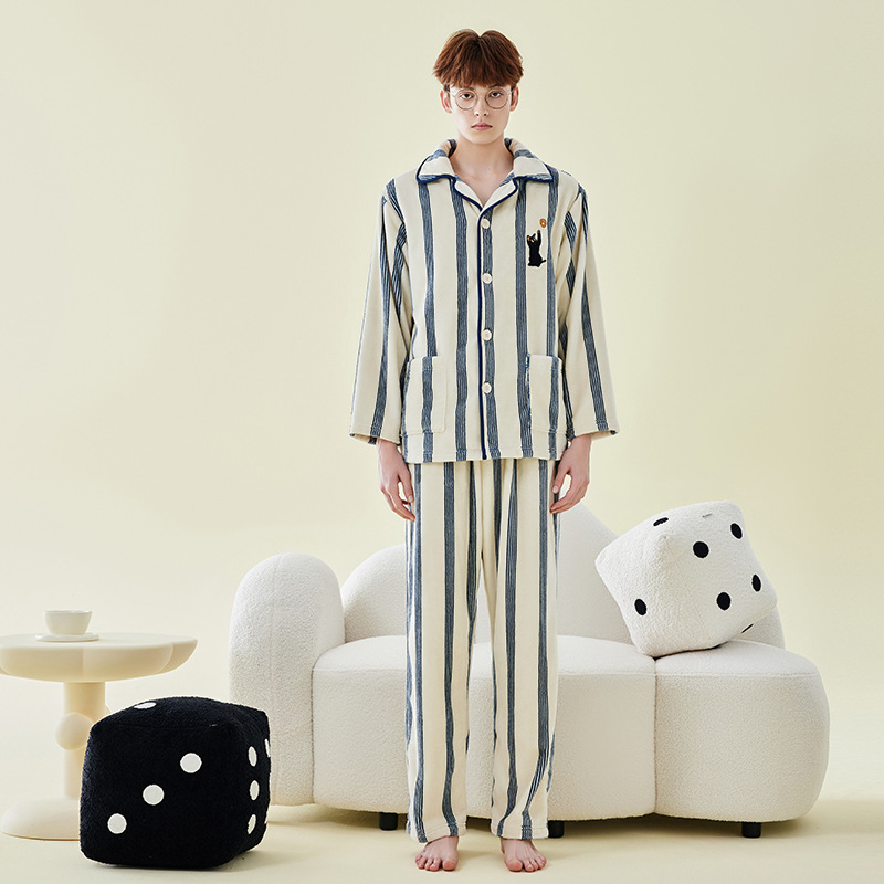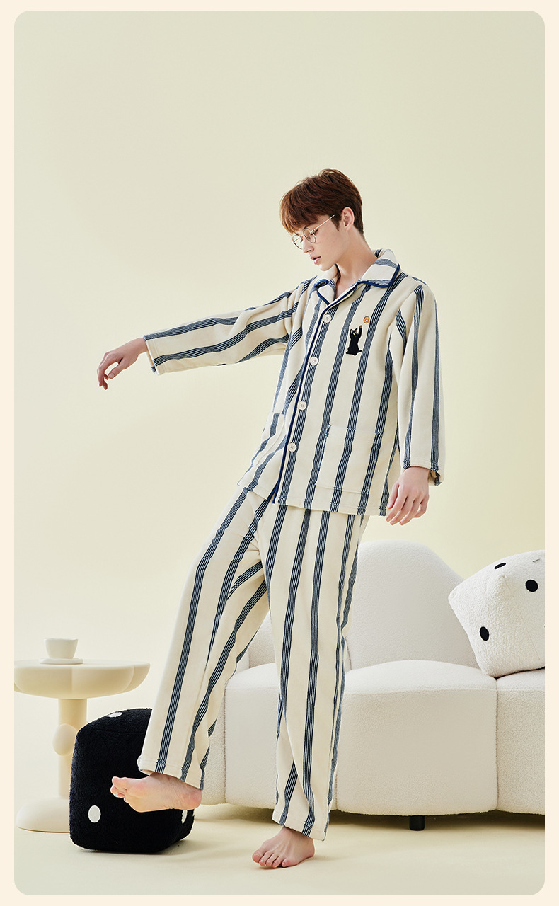 클래스 A 겨울 플란넬 파자마 남자 고양이 자수 남자 파자마 산호 양털 홈 옷 두꺼운 따뜻한 세트